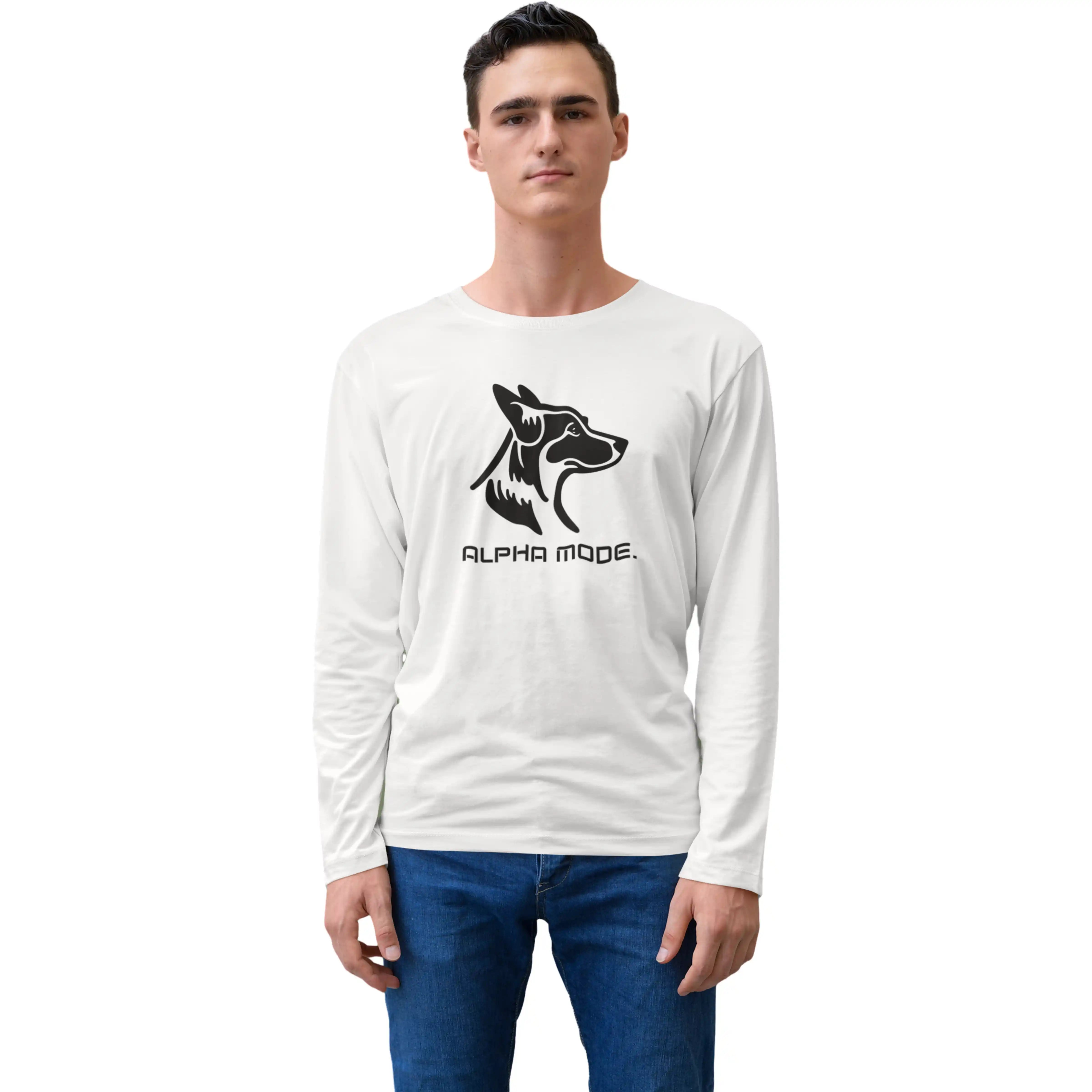 Step into confidence with this white full-sleeve T-shirt featuring “Alpha Mode” print. The round neck and regular fit provide everyday comfort, while the bold design reflects leadership, strength, and undeniable style.