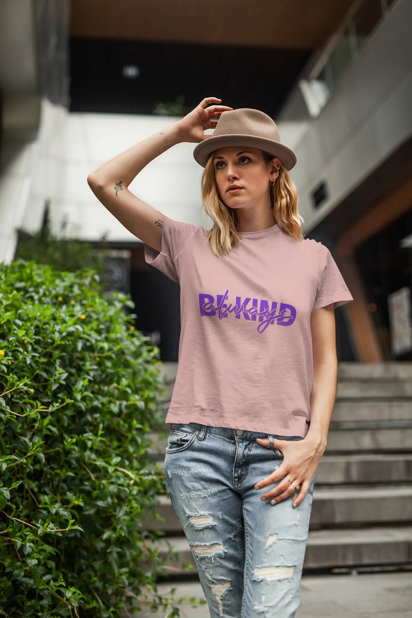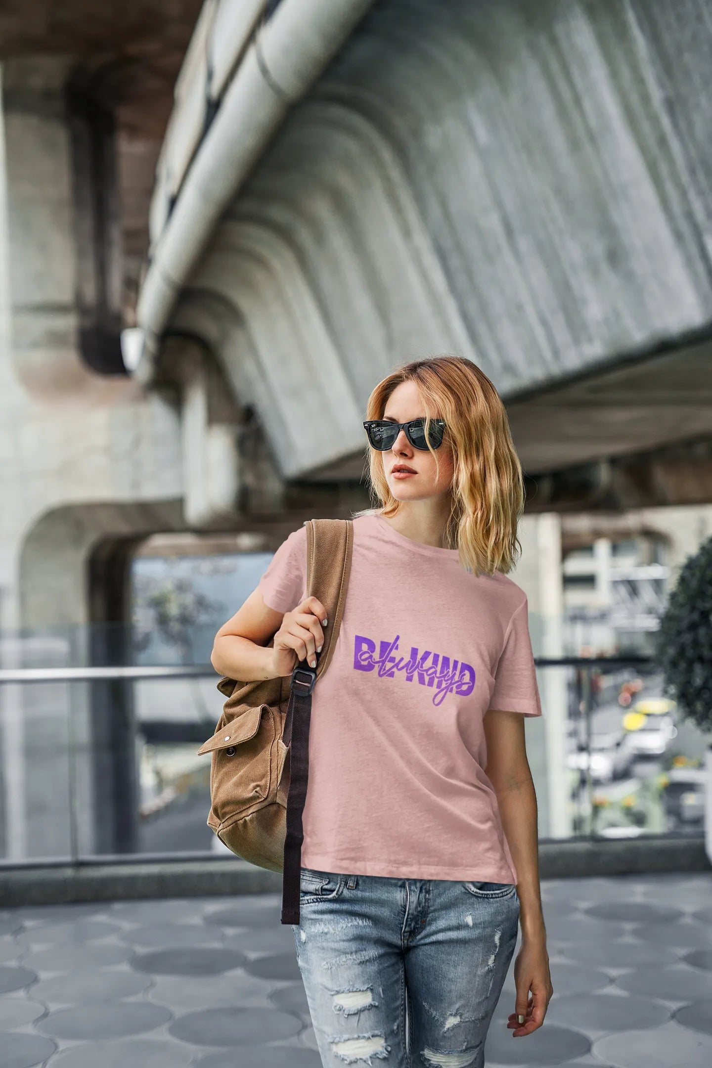 Person wearing a pink t-shirt with 'Be Kind' text, standing outdoors.