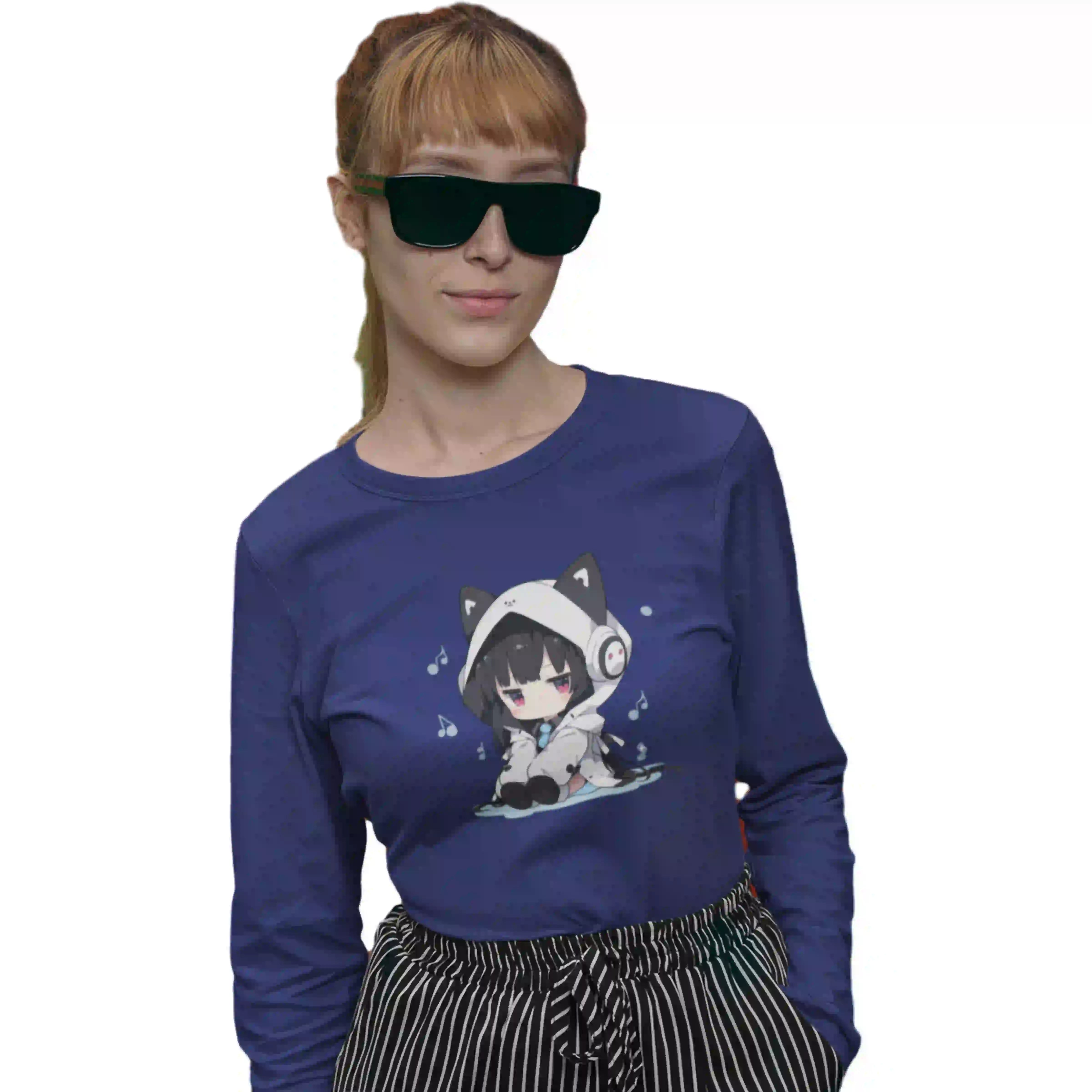 Person wearing a blue long-sleeve shirt with a graphic design and black shorts on a white background