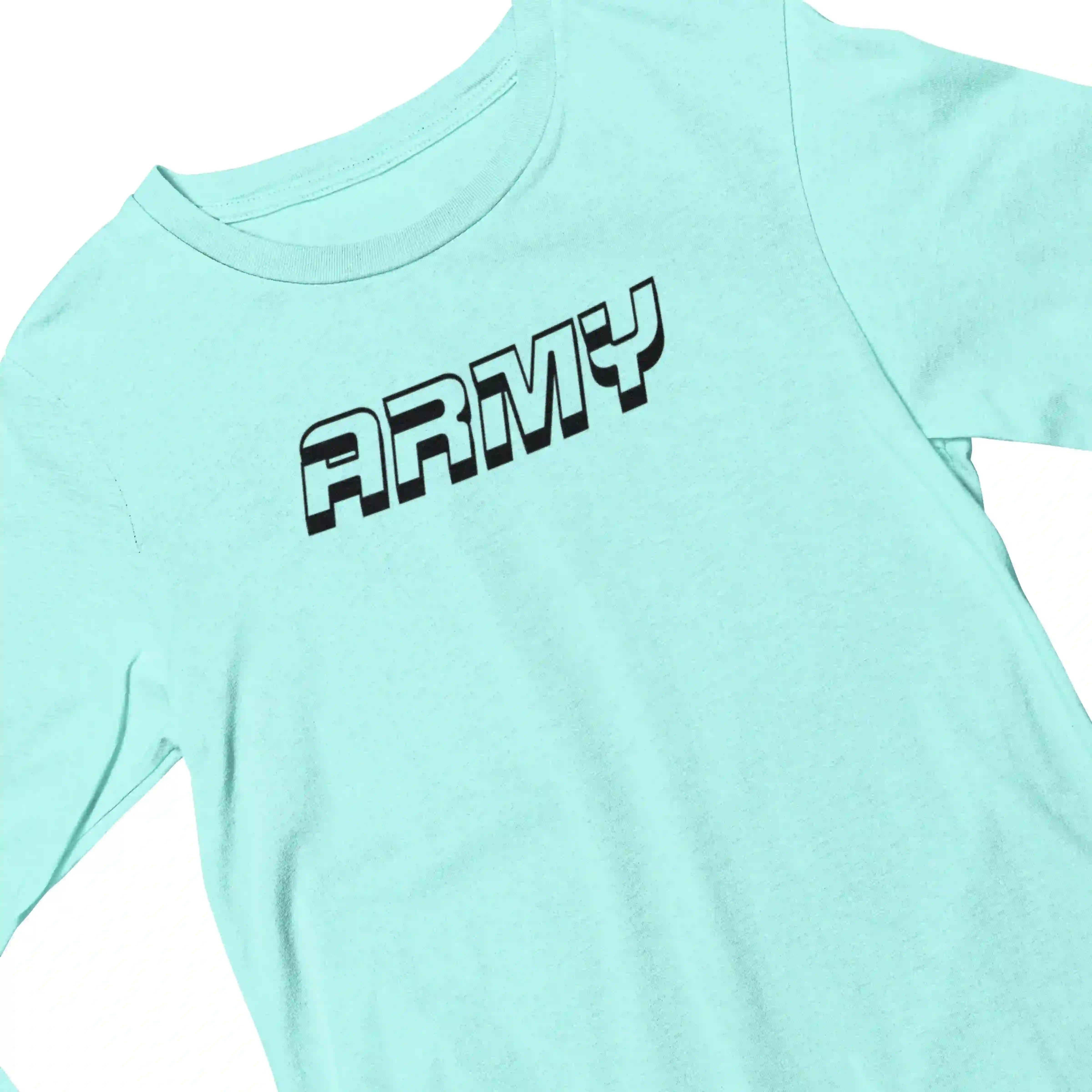 Show your bold spirit with this mint full-sleeve T-shirt featuring an “Army” design. Made with a round neck and regular fit, it blends confidence and comfort—perfect for strong, determined personalities who lead with courage.