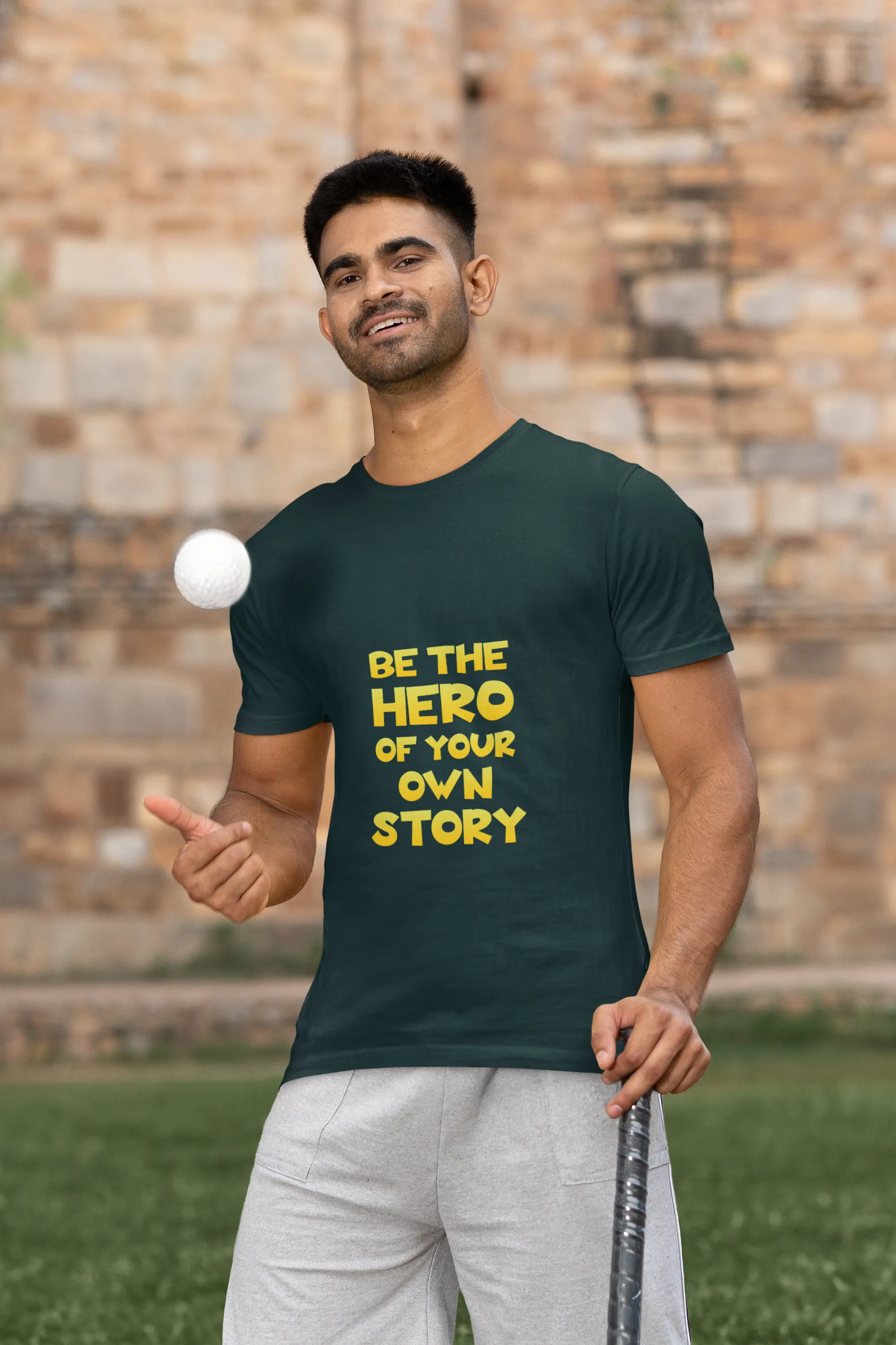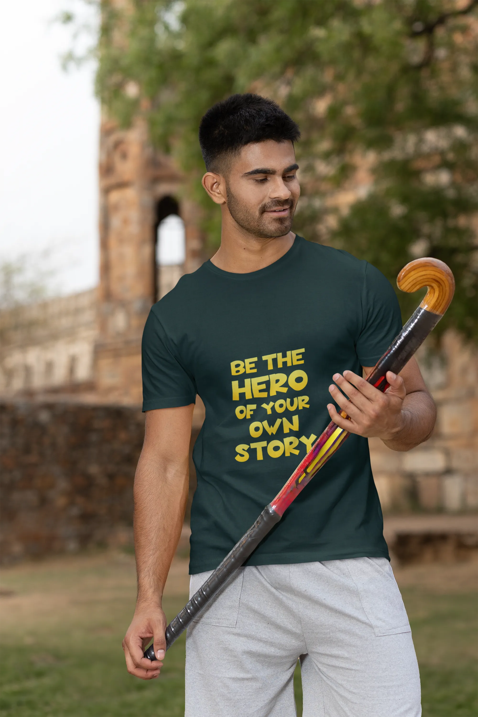 Green t-shirt with 'Be the Hero of your Own Story' text on a tree