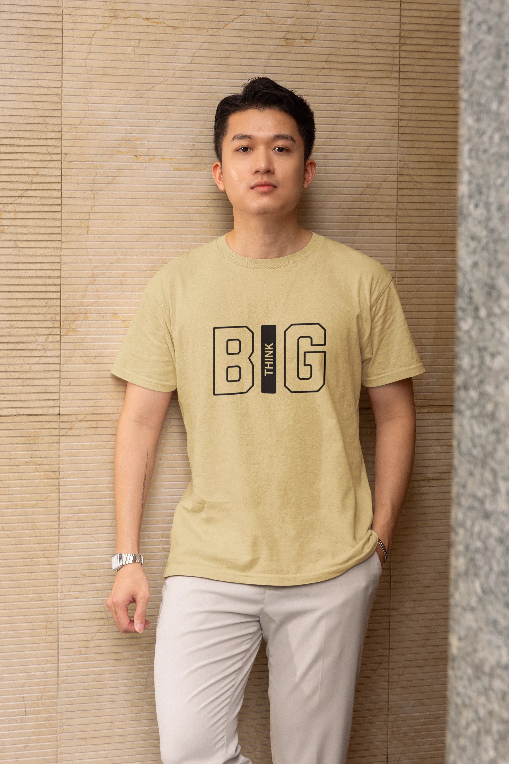 This beige T-shirt for men delivers a bold yet minimal vibe. Crafted in a regular fit with a round neck and half sleeves, it’s ideal for casual wear. A versatile staple that reflects confidence, simplicity, and effortless everyday fashion.