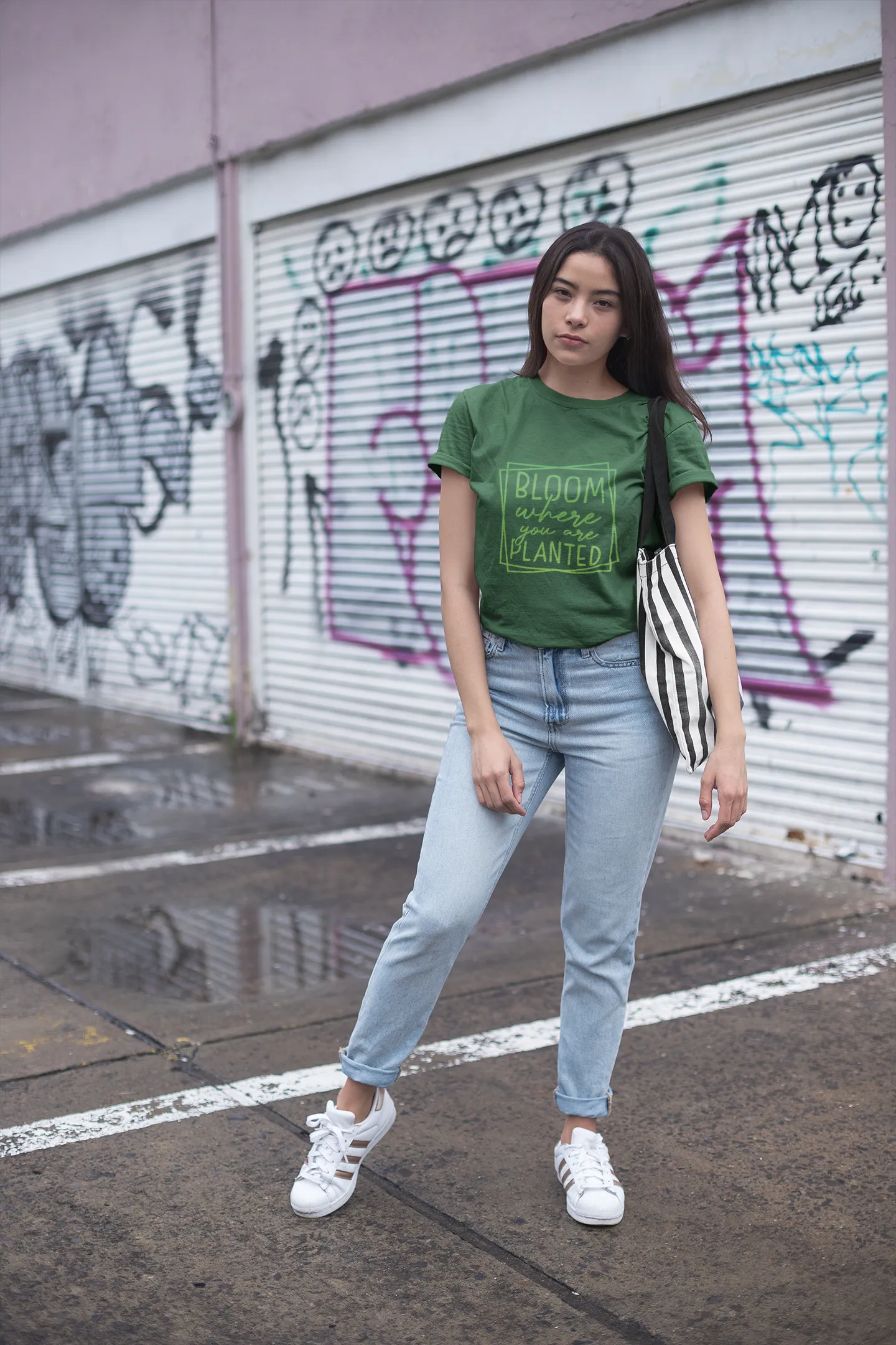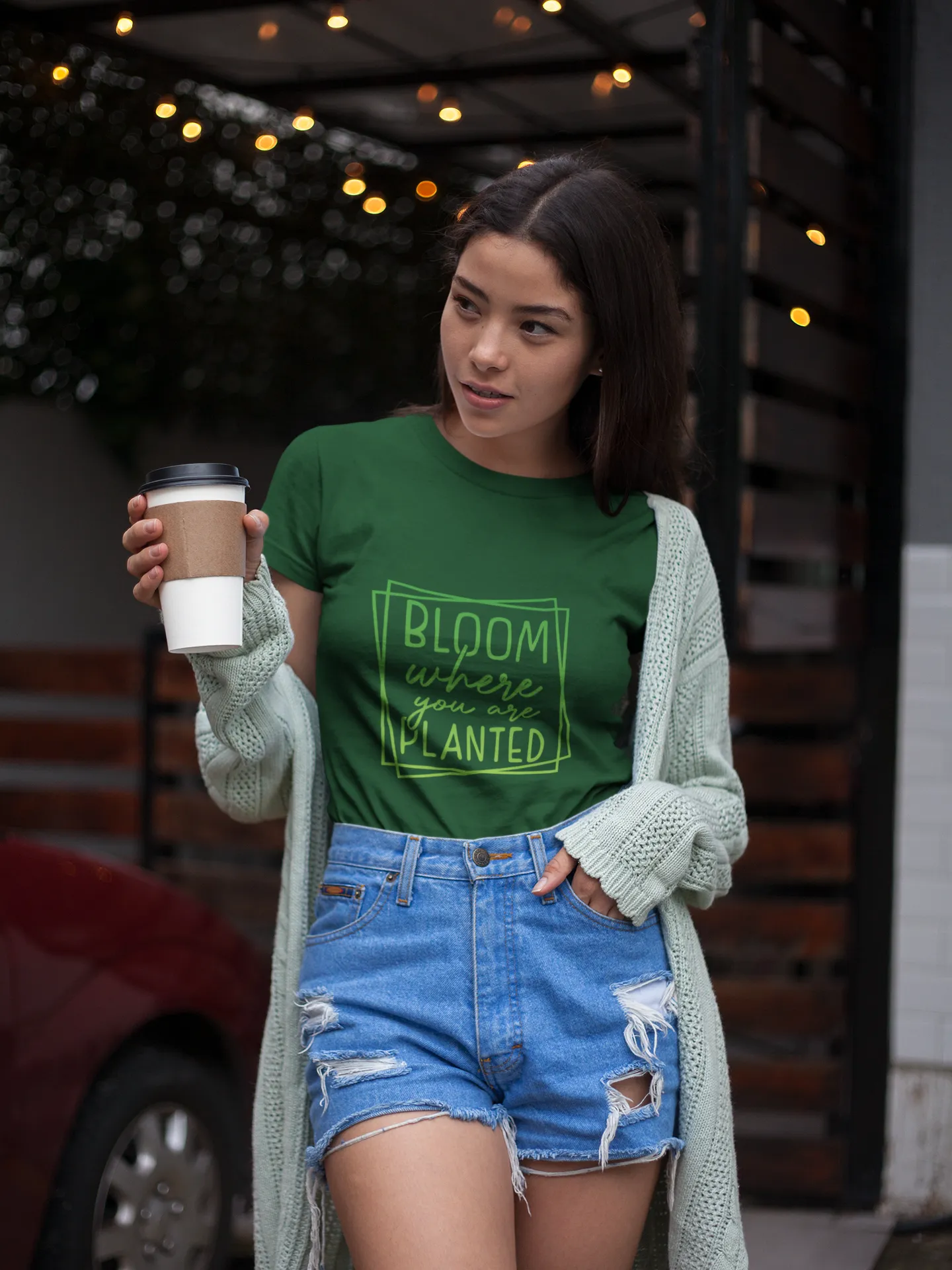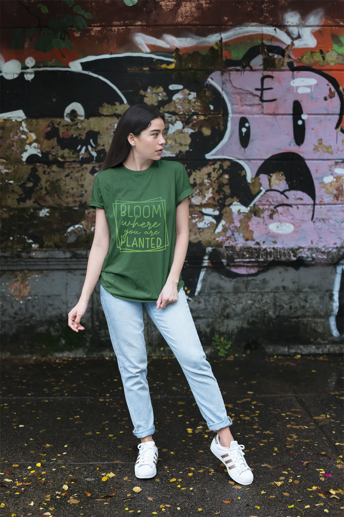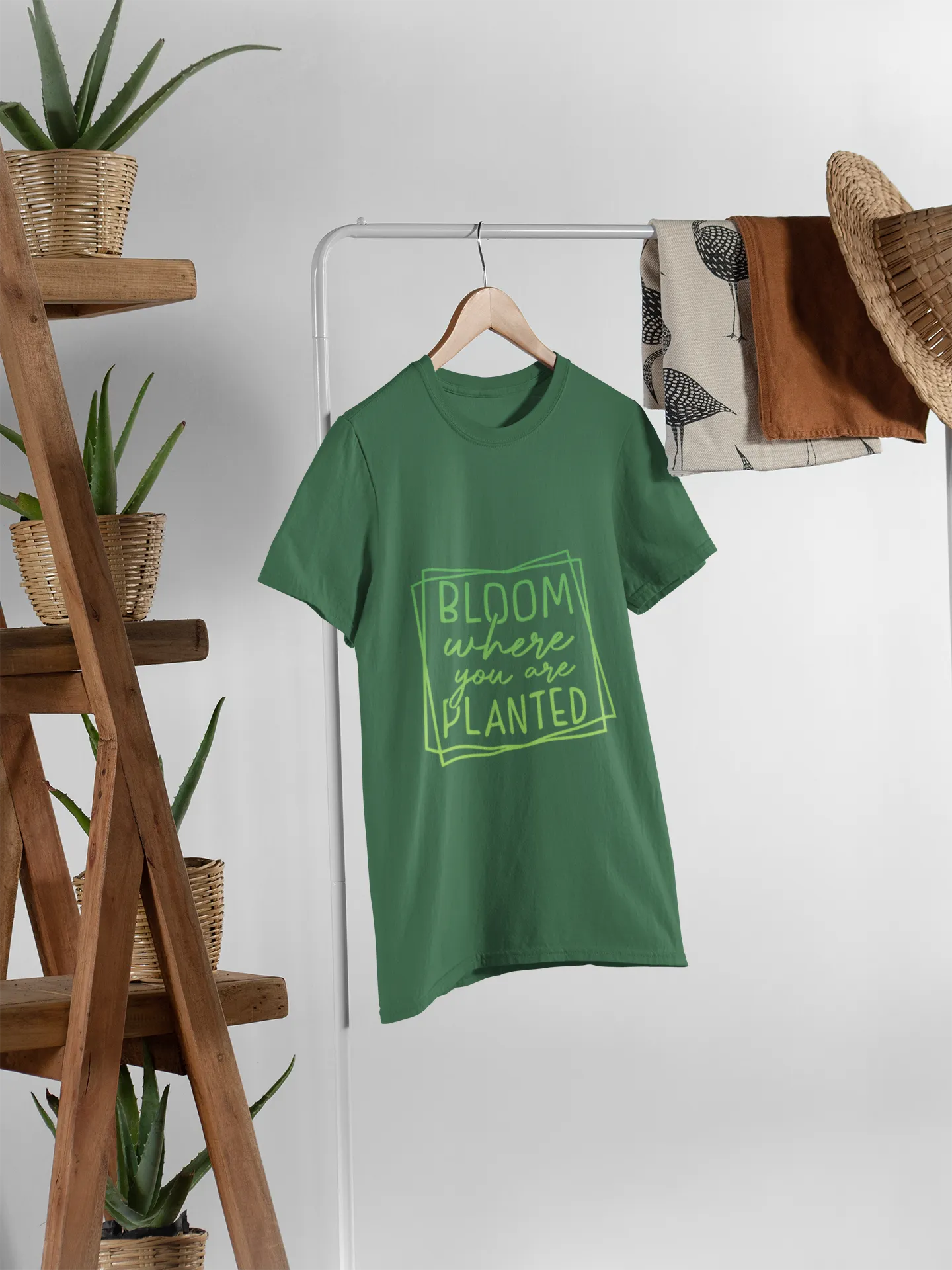 A minimal yet elegant T-shirt design featuring the phrase "Bloom Where You Are Planted" in a stylish, handwritten font. Delicate floral illustrations grow around the text, symbolizing resilience and growth. Soft pastel colors enhance the uplifting, nature-inspired aesthetic.