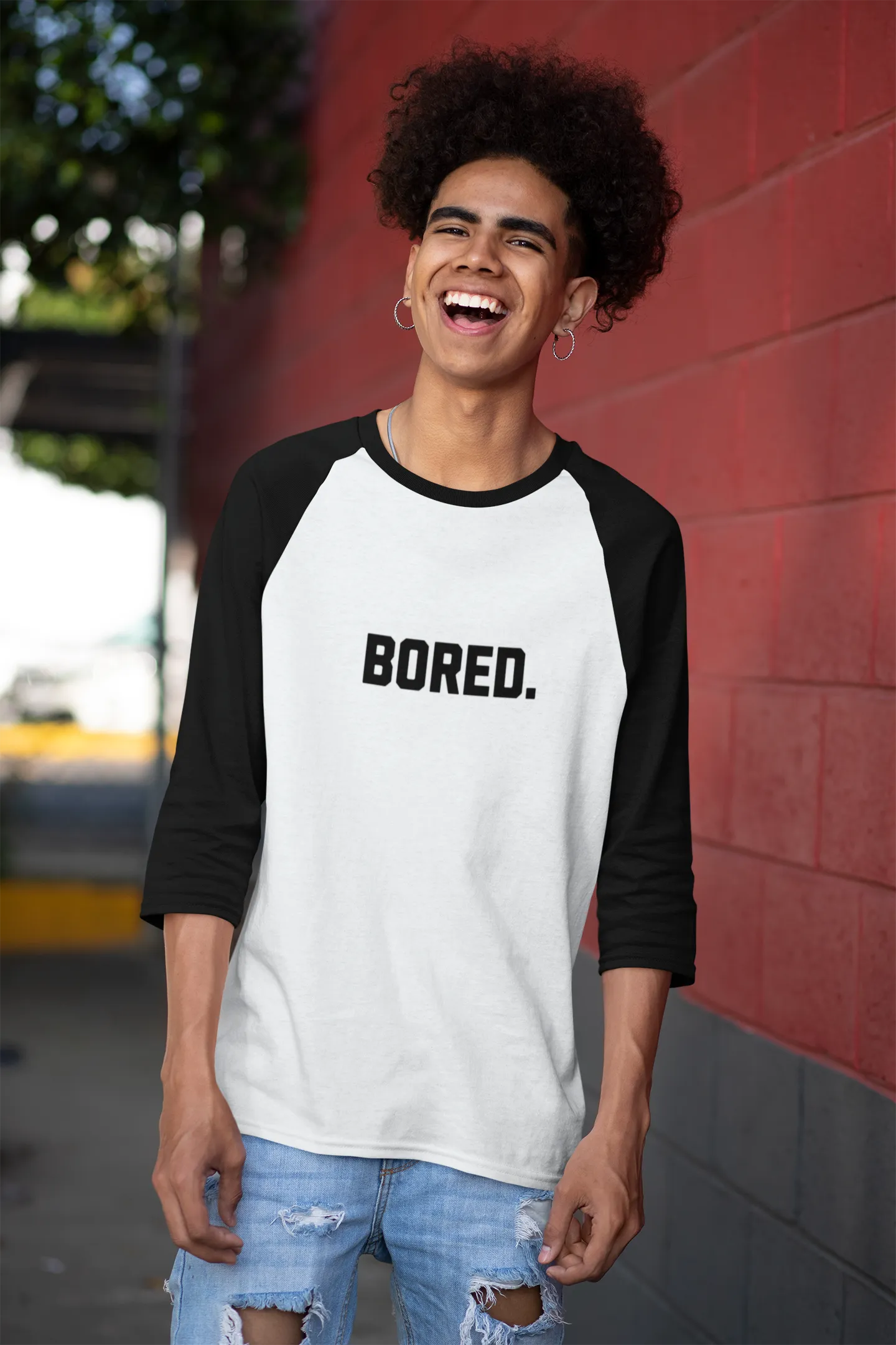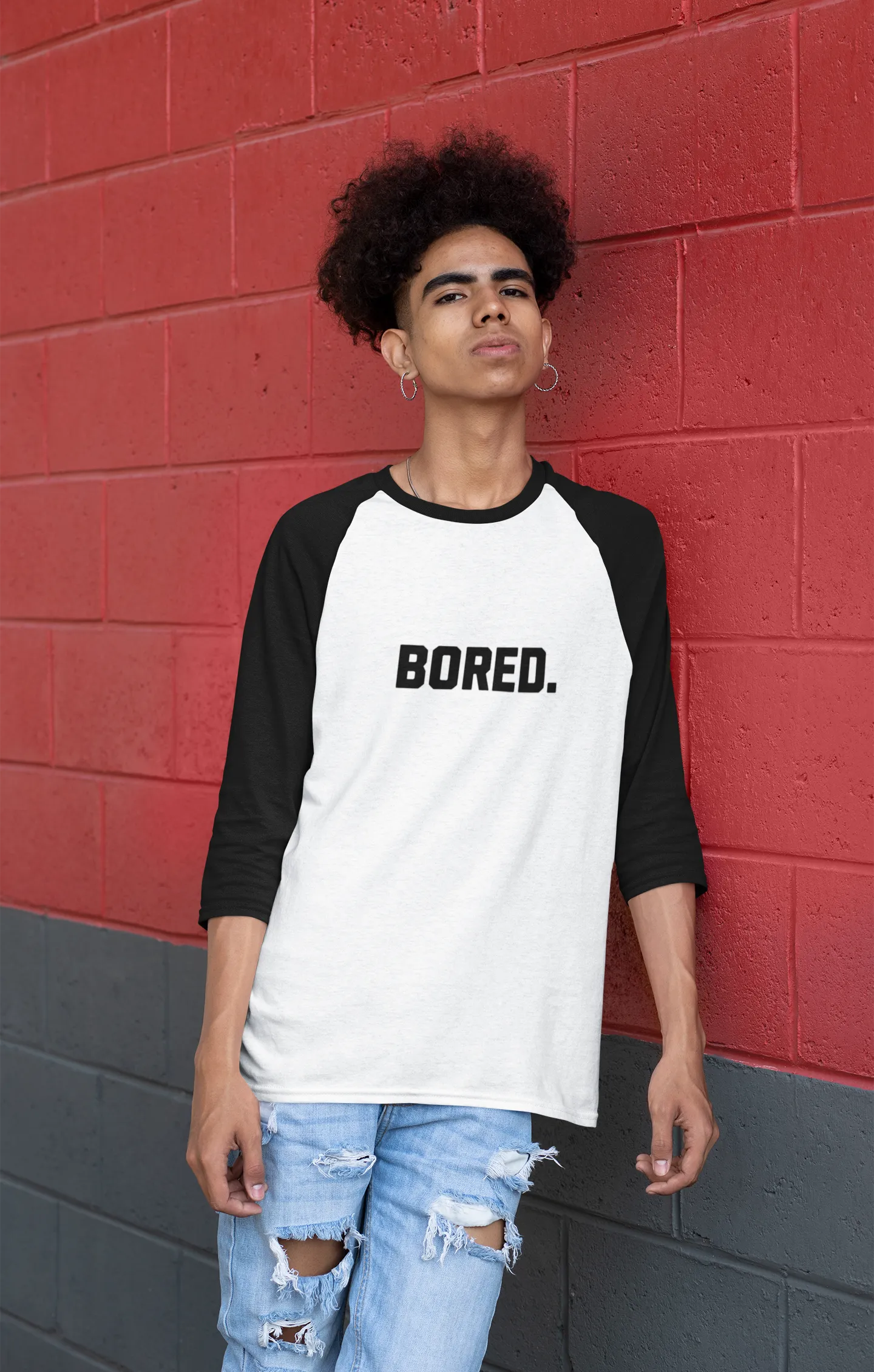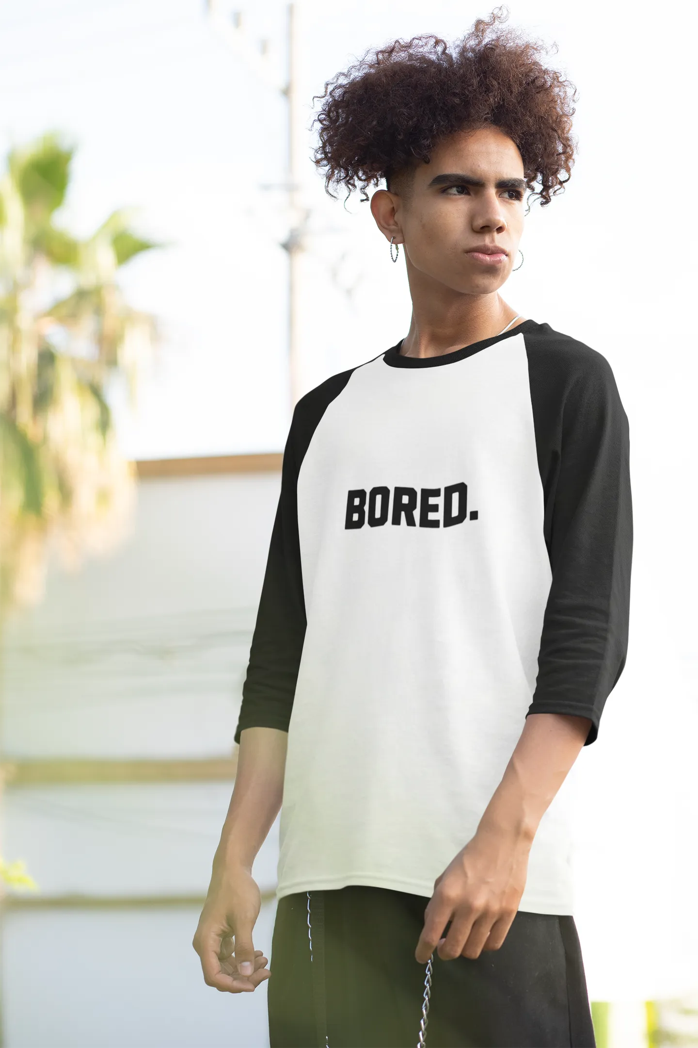 A minimalistic T-shirt design featuring a sleepy cartoon face with droopy eyes and a straight mouth. The word "BORED" is boldly printed beneath in a quirky font, capturing the ultimate lazy-day vibe with effortless, relatable charm.
