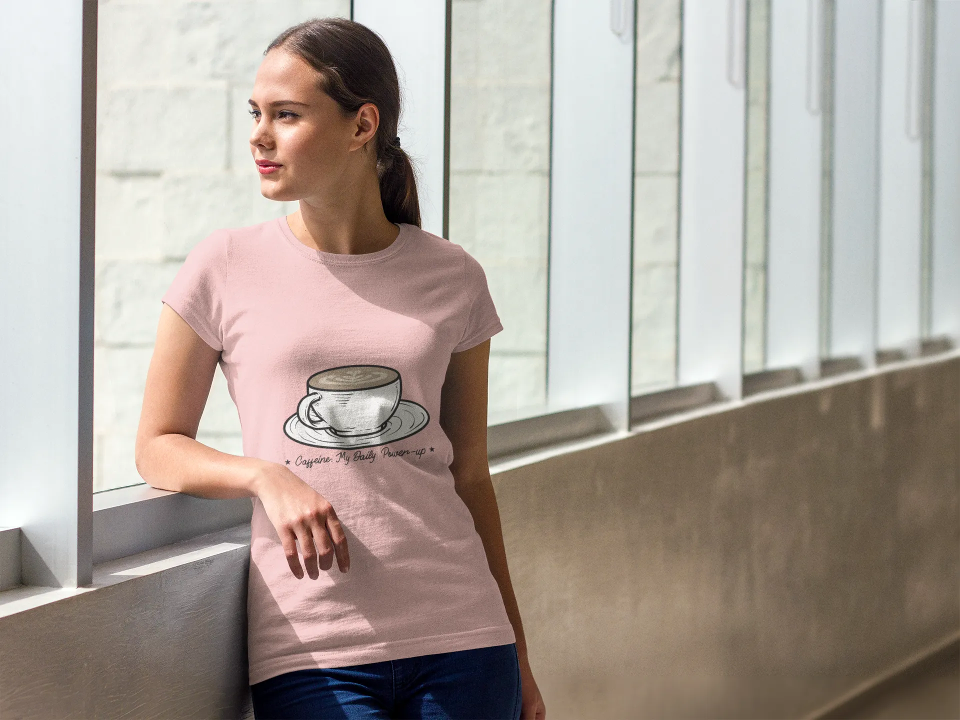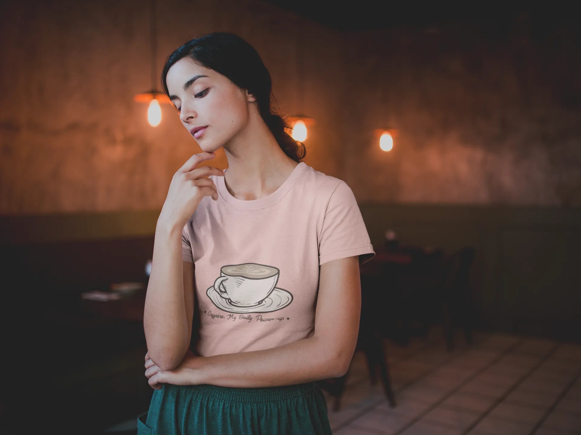 Woman wearing a pink t-shirt with a coffee cup design in a café setting