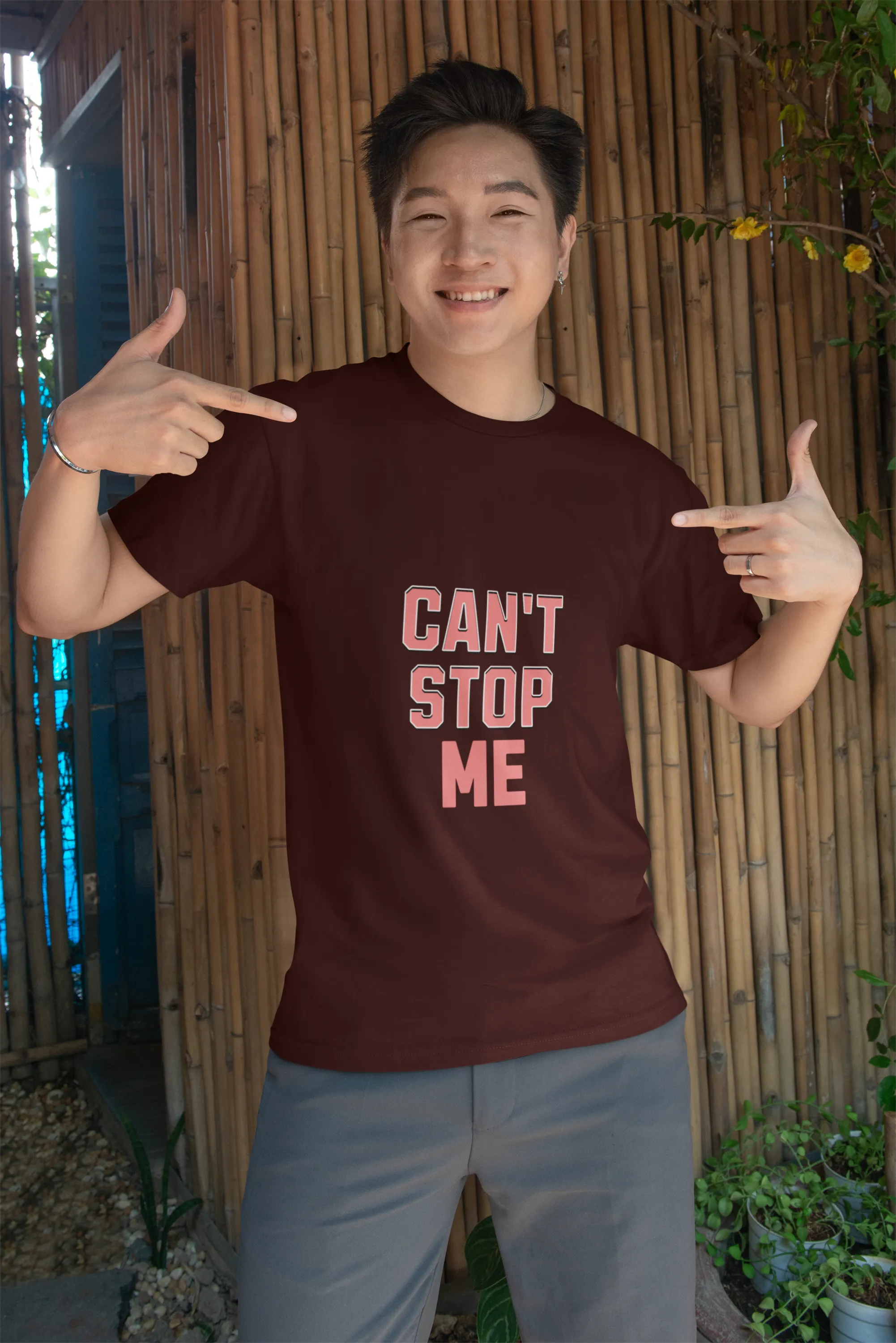 Person wearing a black t-shirt with 'CAN'T STOP ME' text on a green background