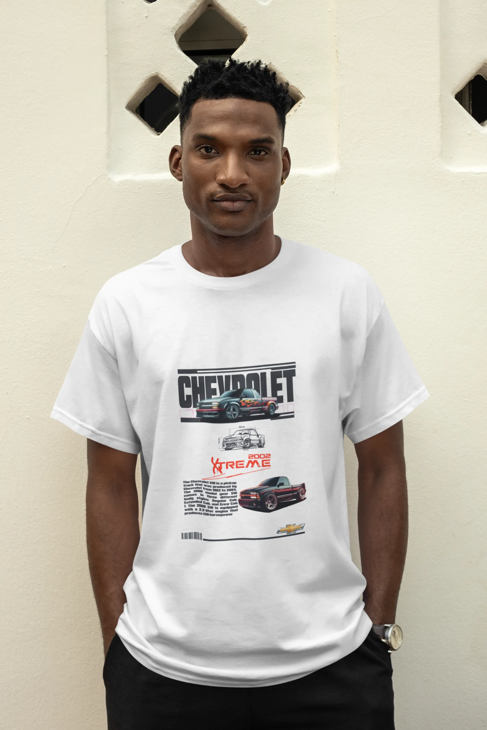 White t-shirt with Chevrolet graphic on a wooden rack against a beige wall.