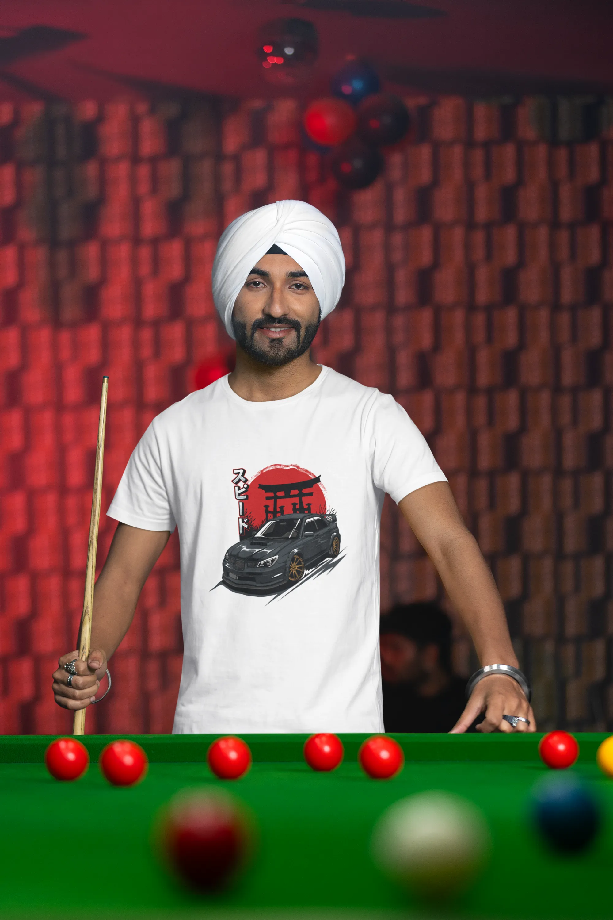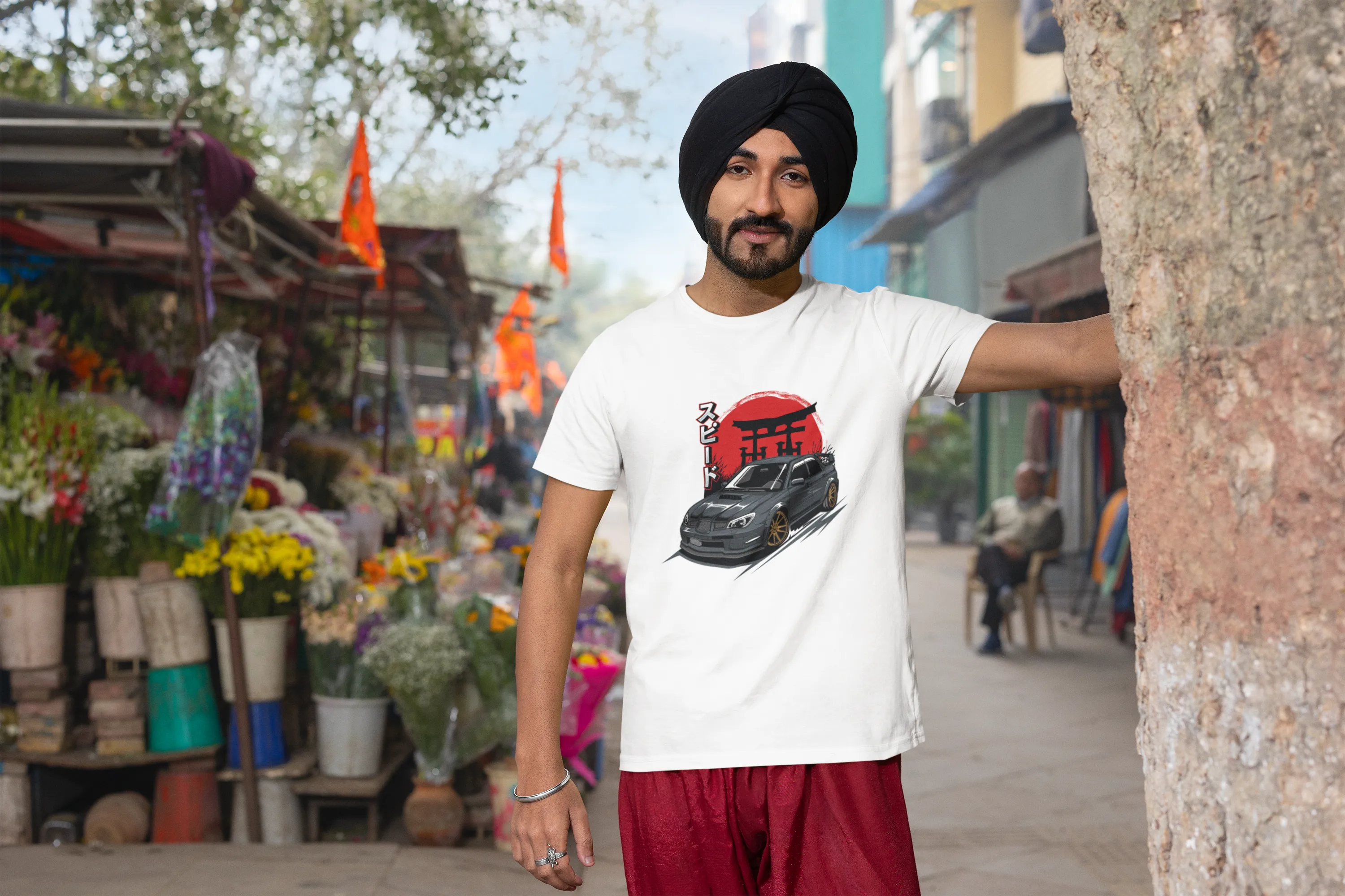 Man wearing a white t-shirt with a graphic design, standing on a street with colorful decorations.