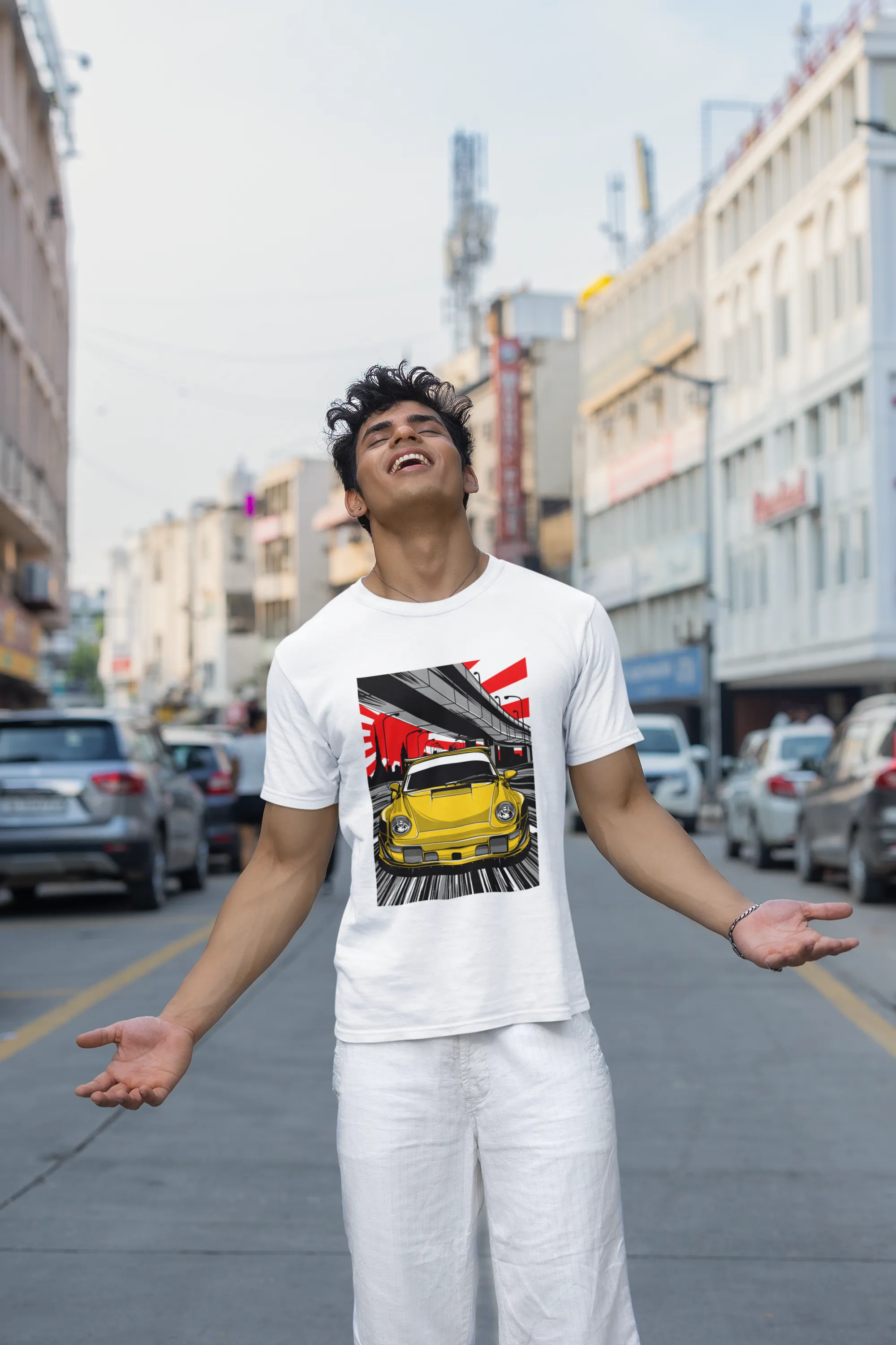 White t-shirt with a graphic design of a yellow car on a hanger in a room.