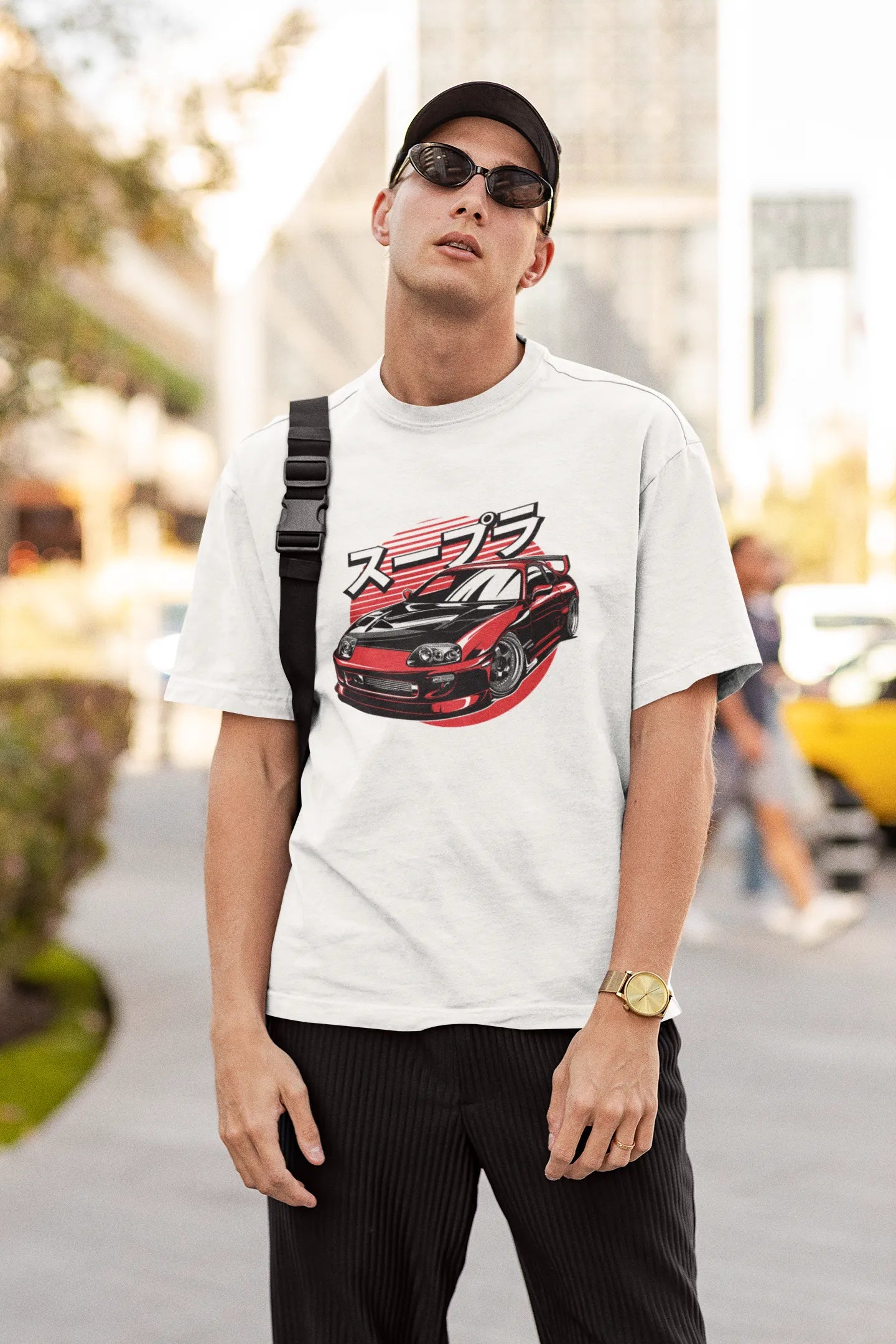 White t-shirt with a red and black car graphic and Japanese text on a dark background
