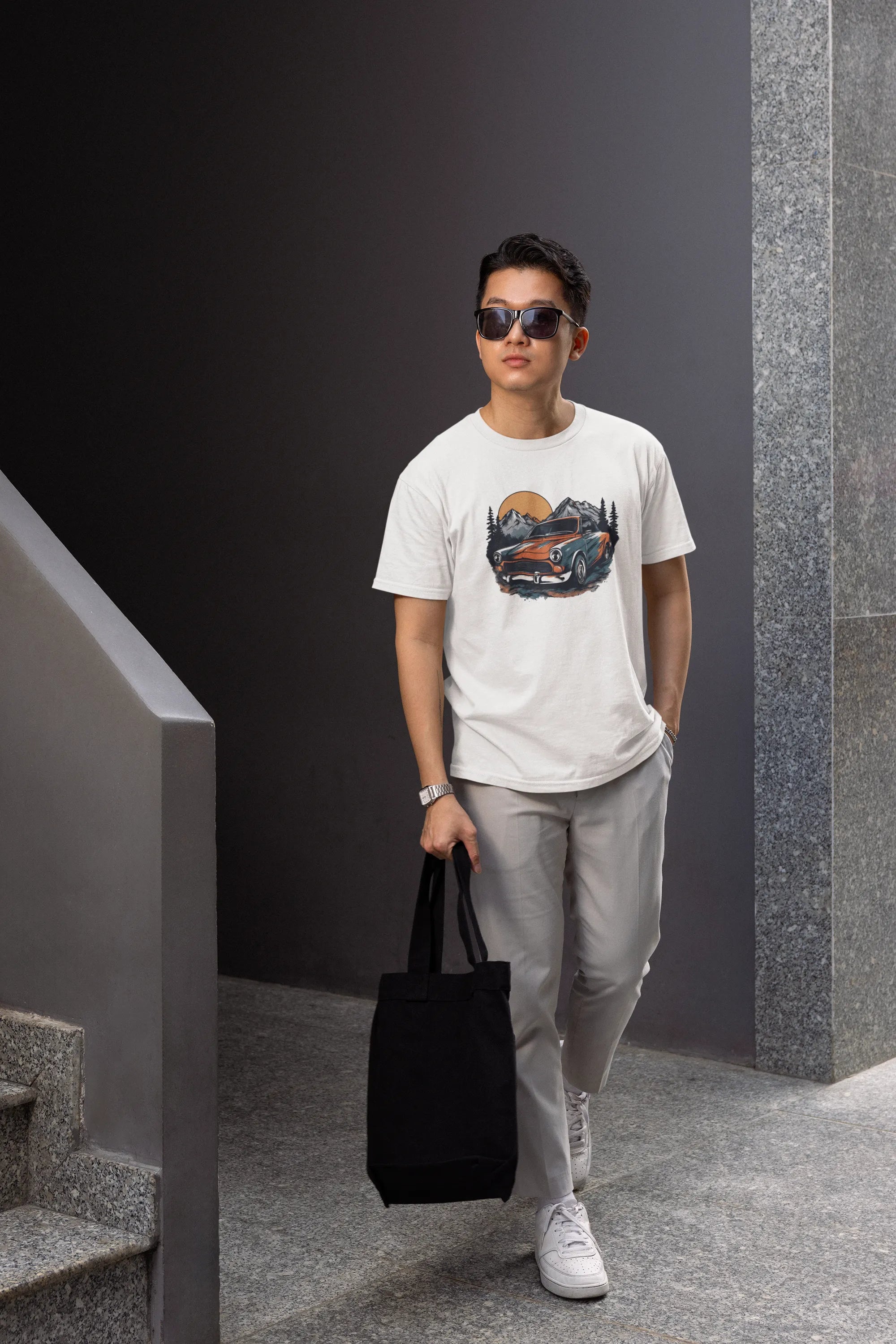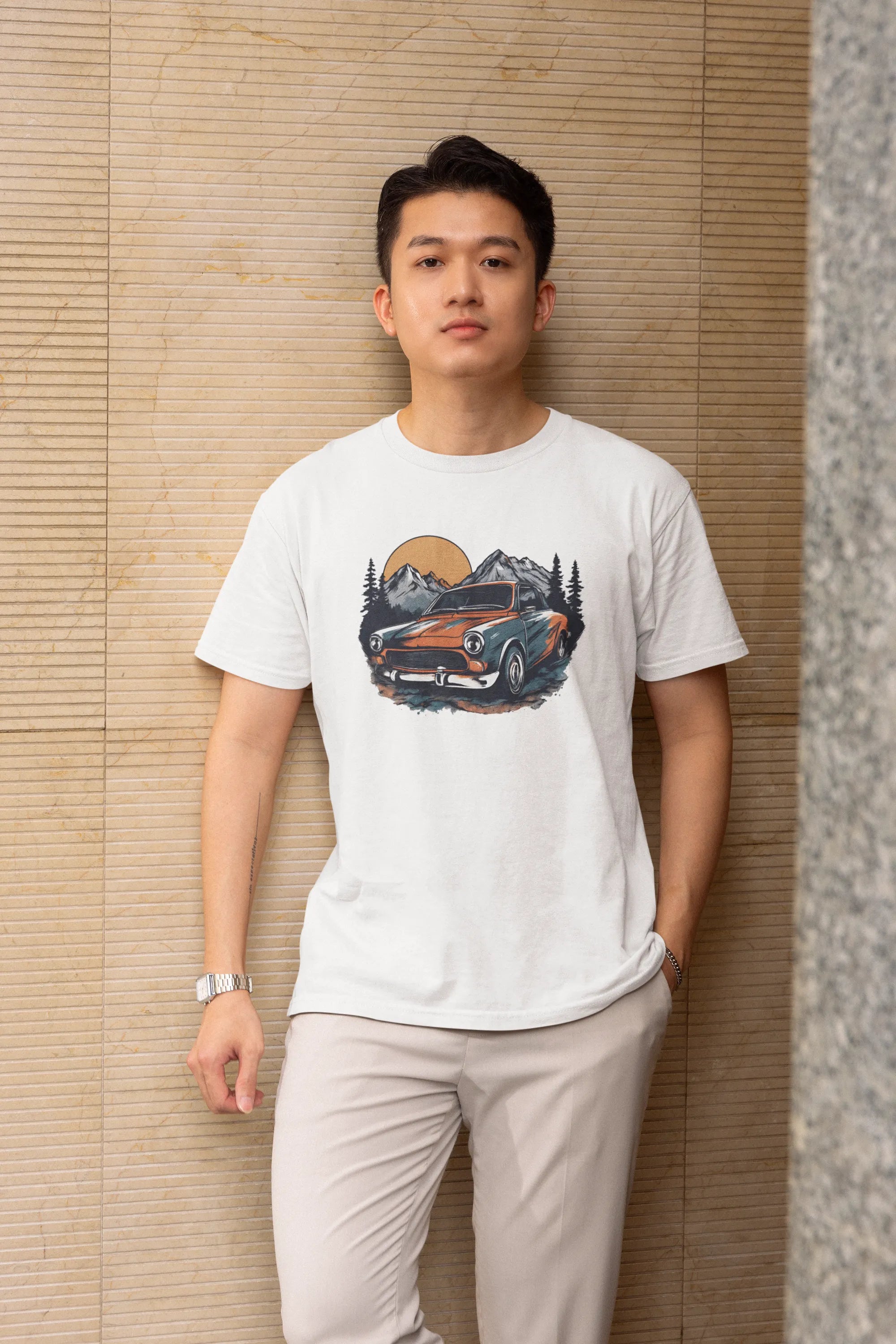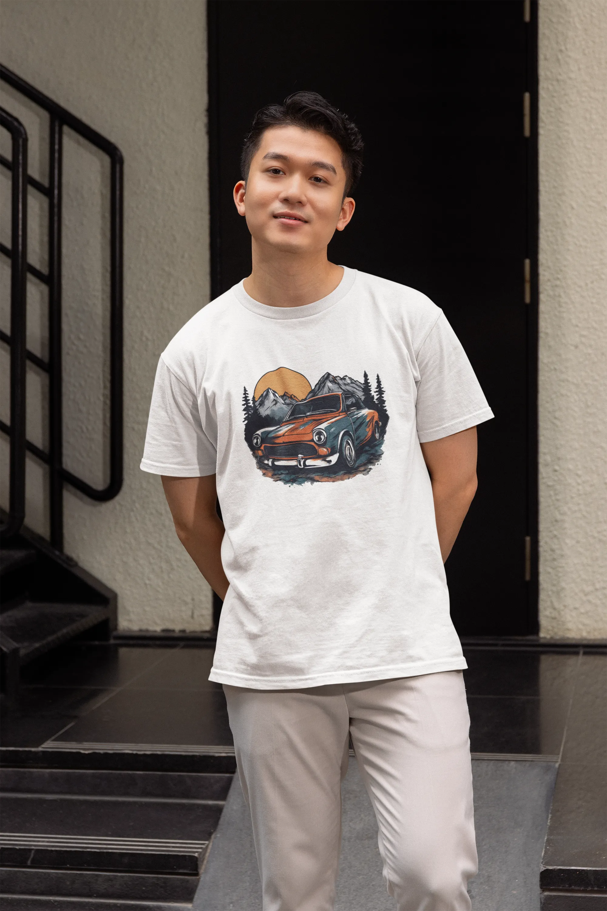 White t-shirt with a graphic design of a vintage car and mountains on a hanger in a room.