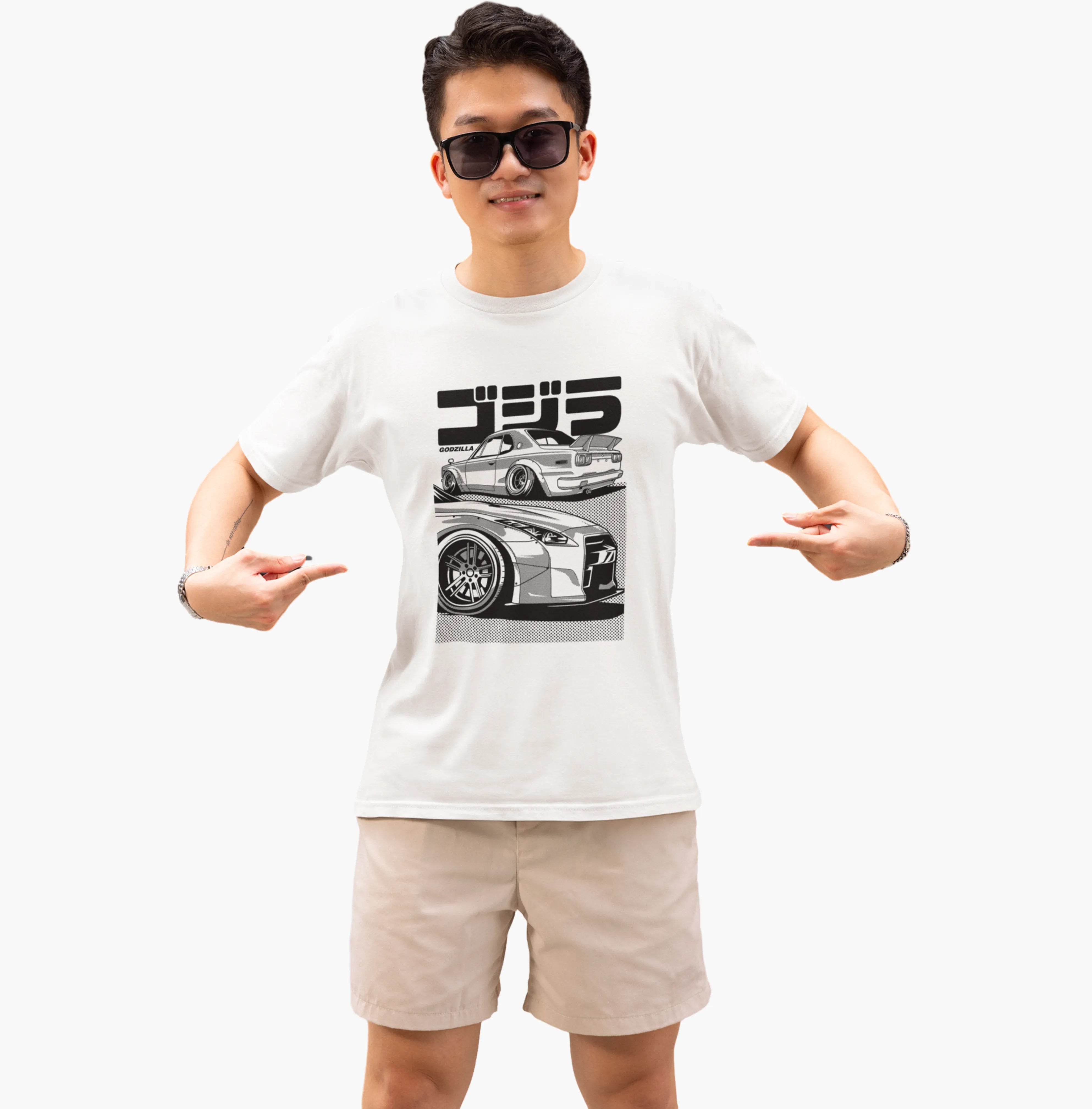 Person wearing a white t-shirt with a graphic design, holding a black tote bag on a white background