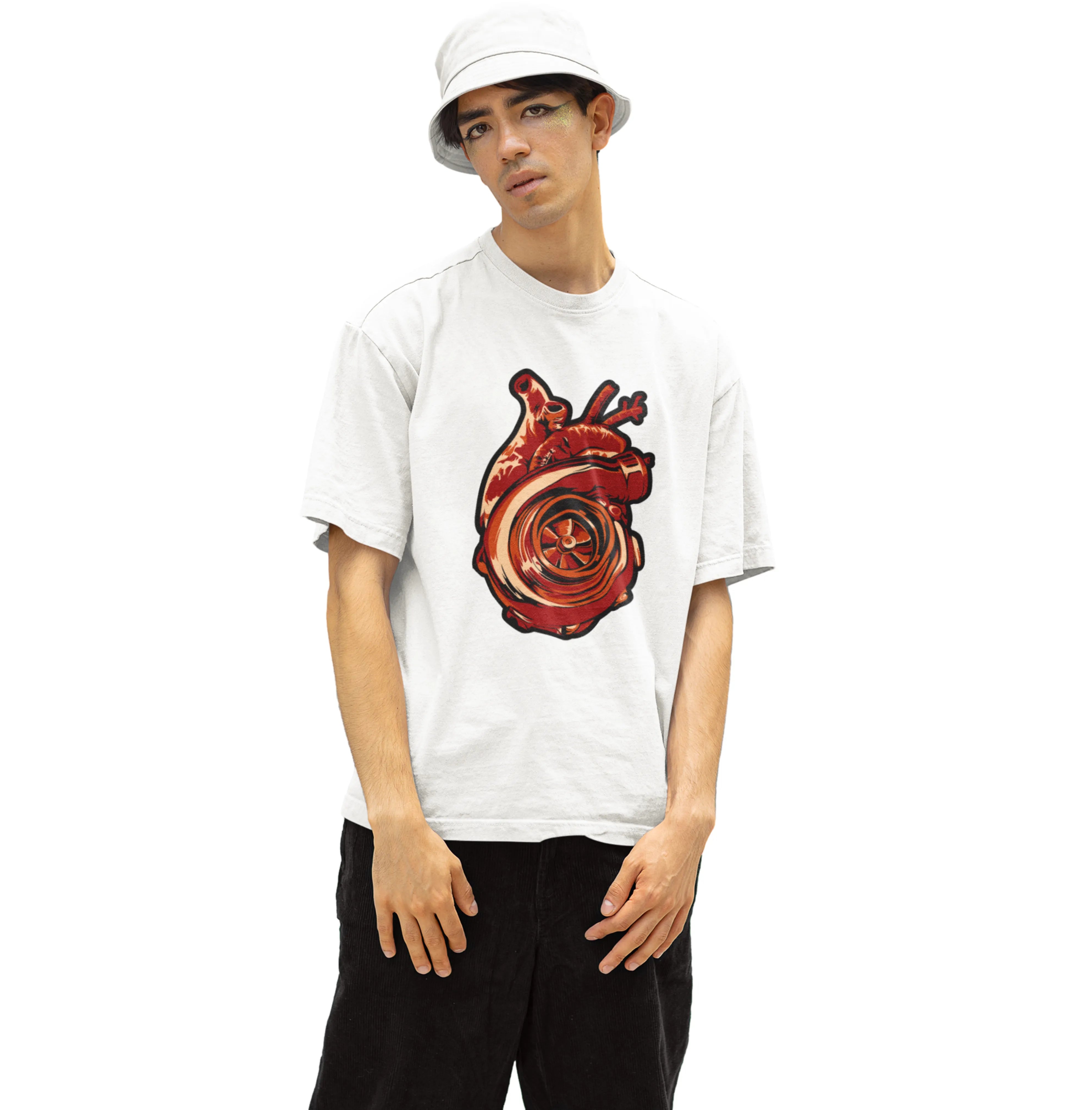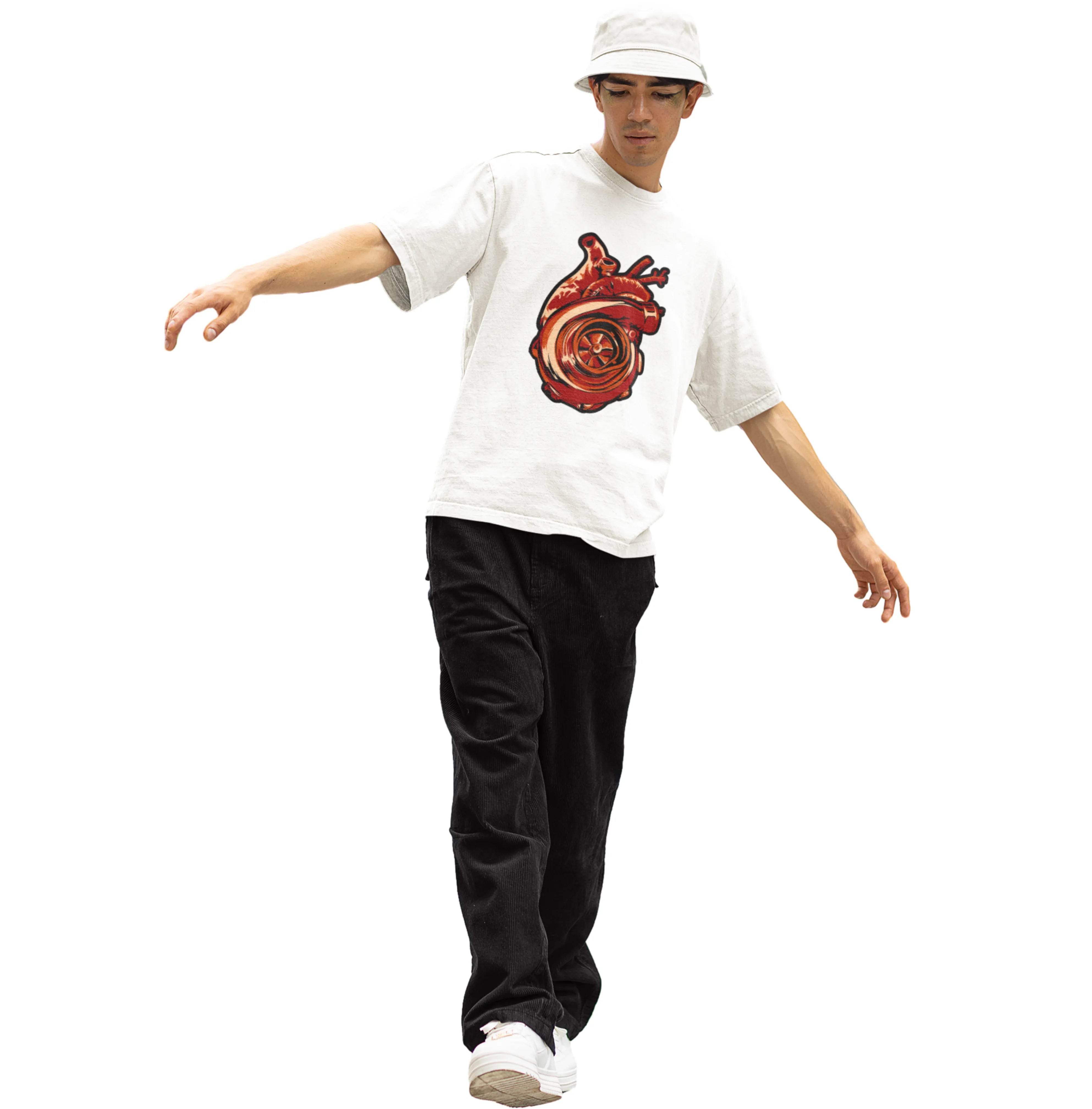 Person wearing a white t-shirt with a red graphic design on a white background