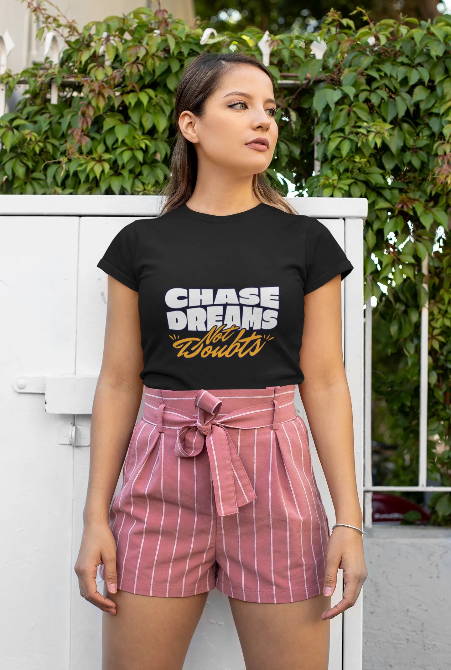 A motivational T-shirt design featuring the phrase “Chase Dreams Not Doubts” in bold, energetic typography. Accented with shooting stars, dream clouds, or running silhouettes, it symbolizes courage, ambition, and self-belief — perfect for dreamers who refuse to be held back by fear.