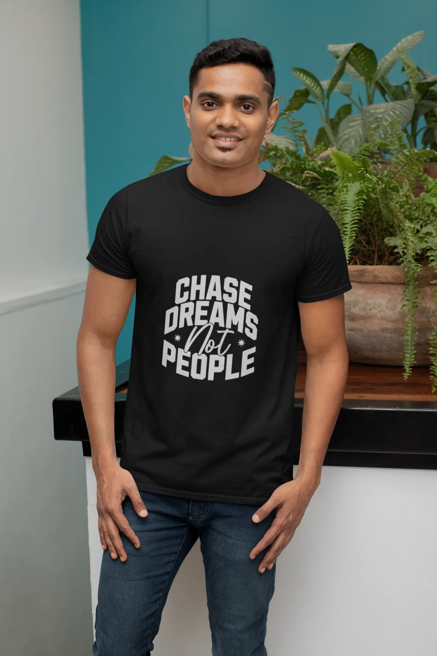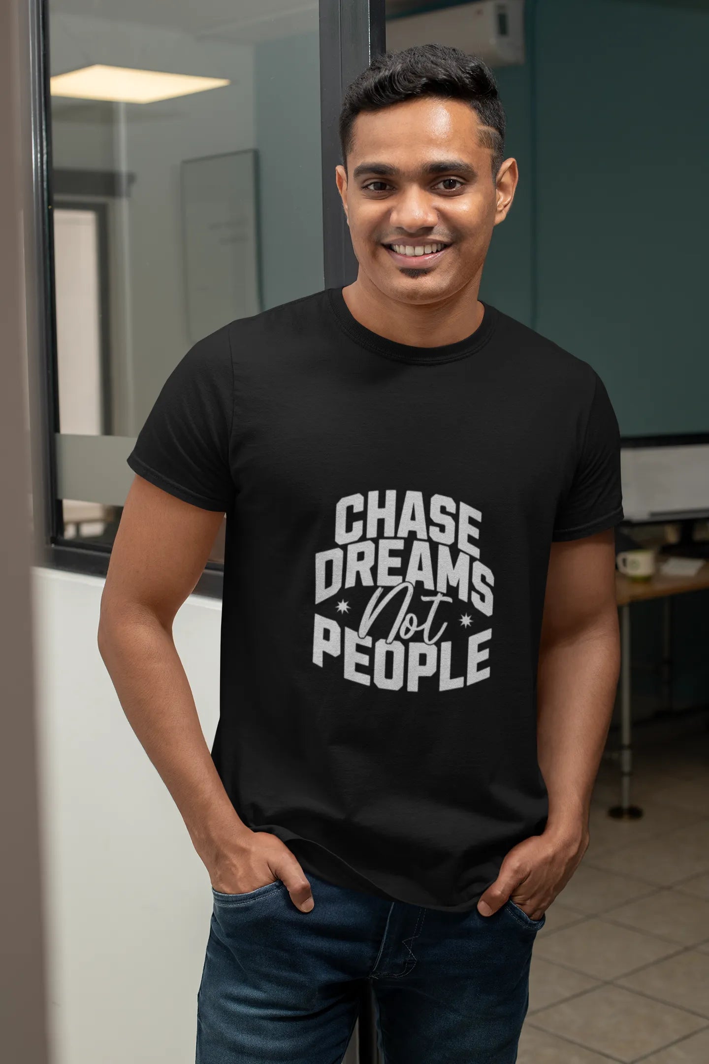 The "Chase Dreams, Not People" T-shirt design features bold, motivational typography that inspires self-growth and ambition. Stylish fonts, uplifting colors, and subtle graphics like stars or an open road symbolize the journey toward success. Perfect for dreamers, go-getters, and anyone focused on their goals.