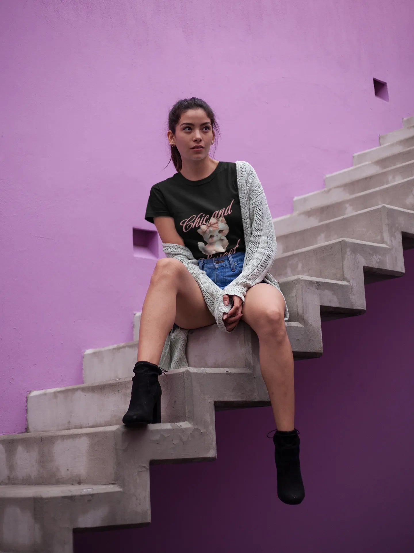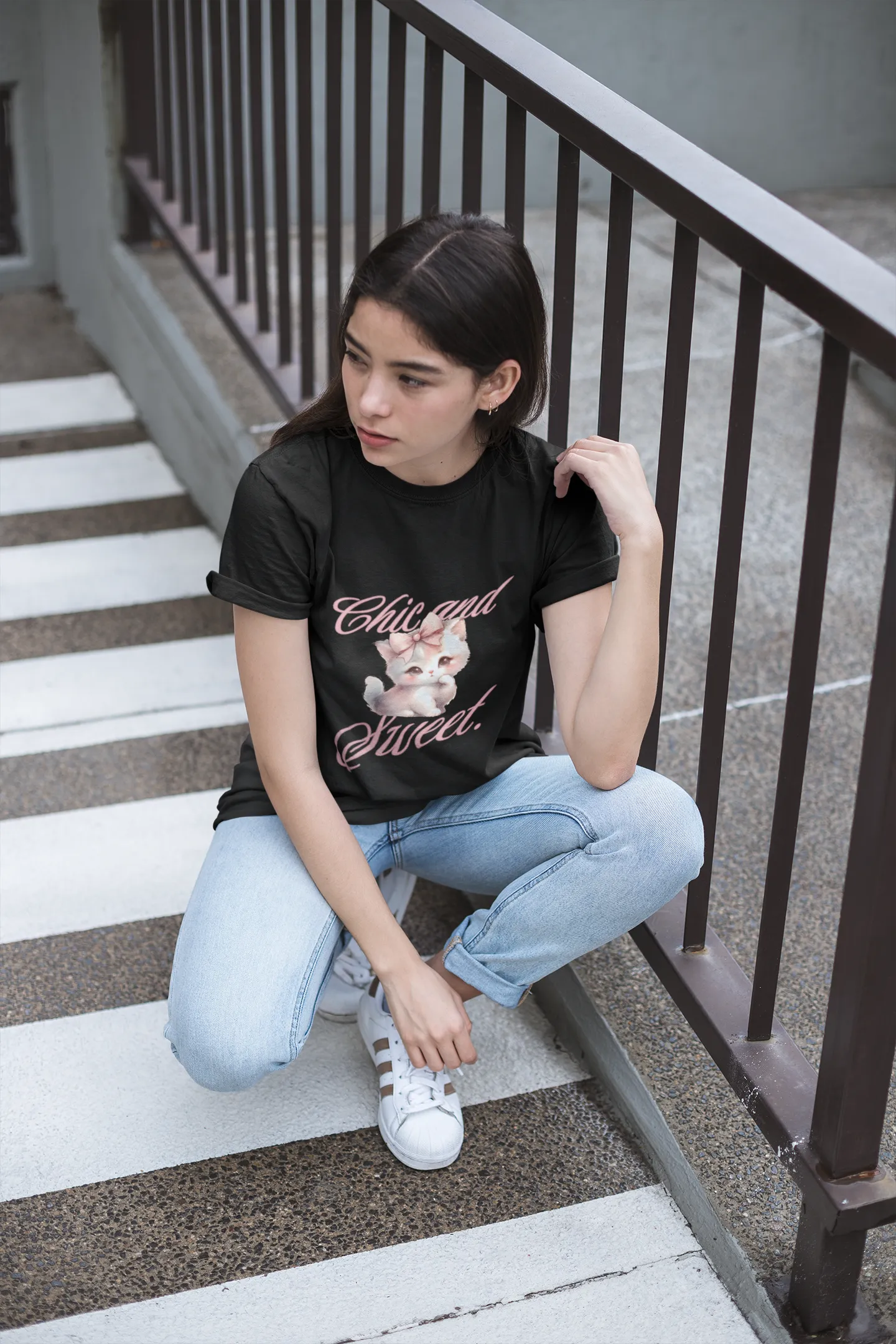 A stylish and feminine T-shirt design featuring the phrase “Chic and Sweet” in elegant, cursive typography. Enhanced with subtle hearts, sparkles, or pastel tones, it blends sophistication with charm — perfect for those who love to express their fashion-forward yet gentle personality.