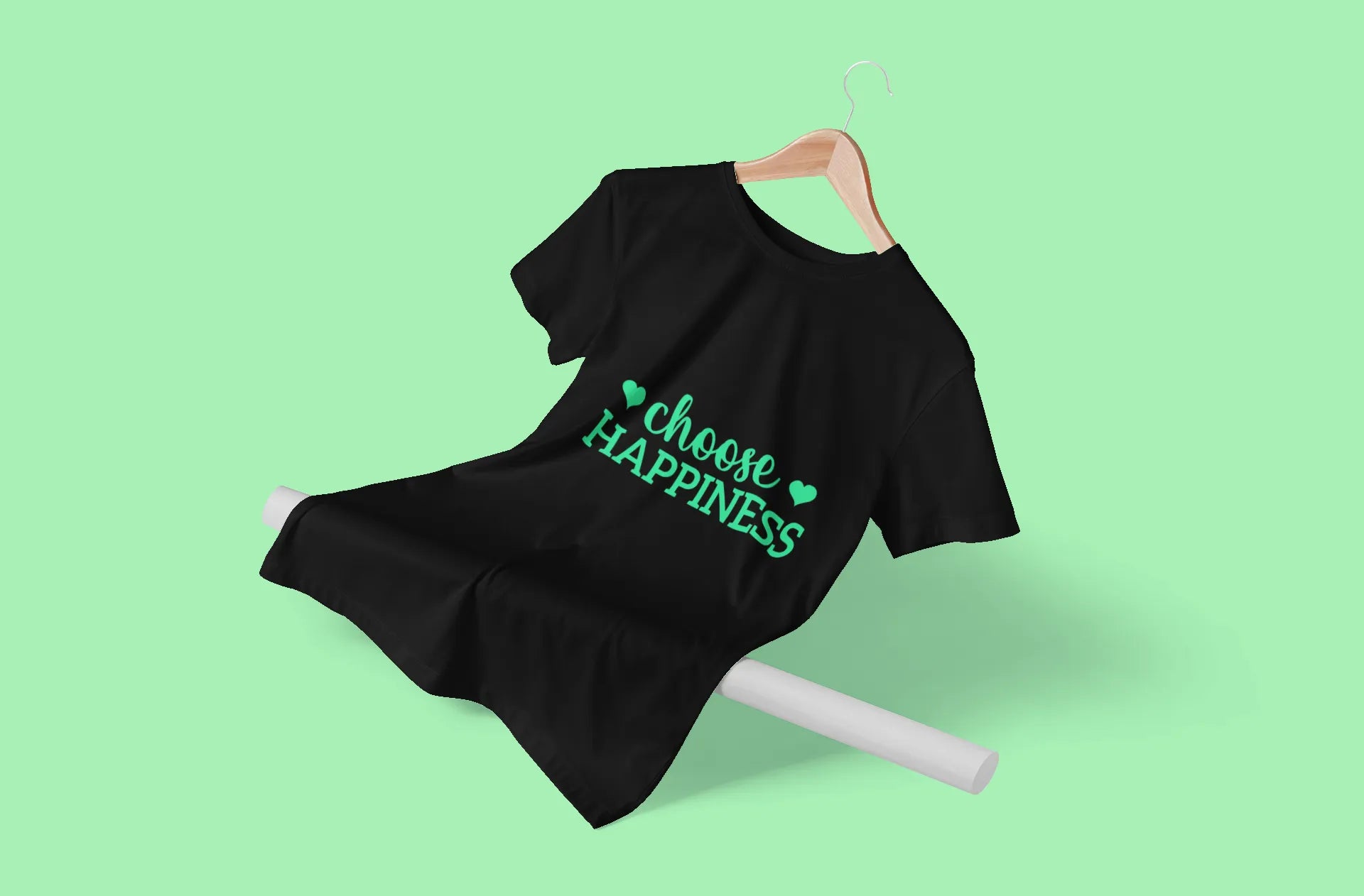 A minimal yet vibrant T-shirt design featuring the phrase "Choose Happiness" in an elegant, hand-lettered font. Bright, uplifting colors, playful typography, and subtle smiley or sun elements create a positive, cheerful vibe, inspiring optimism and joy in everyday life.
