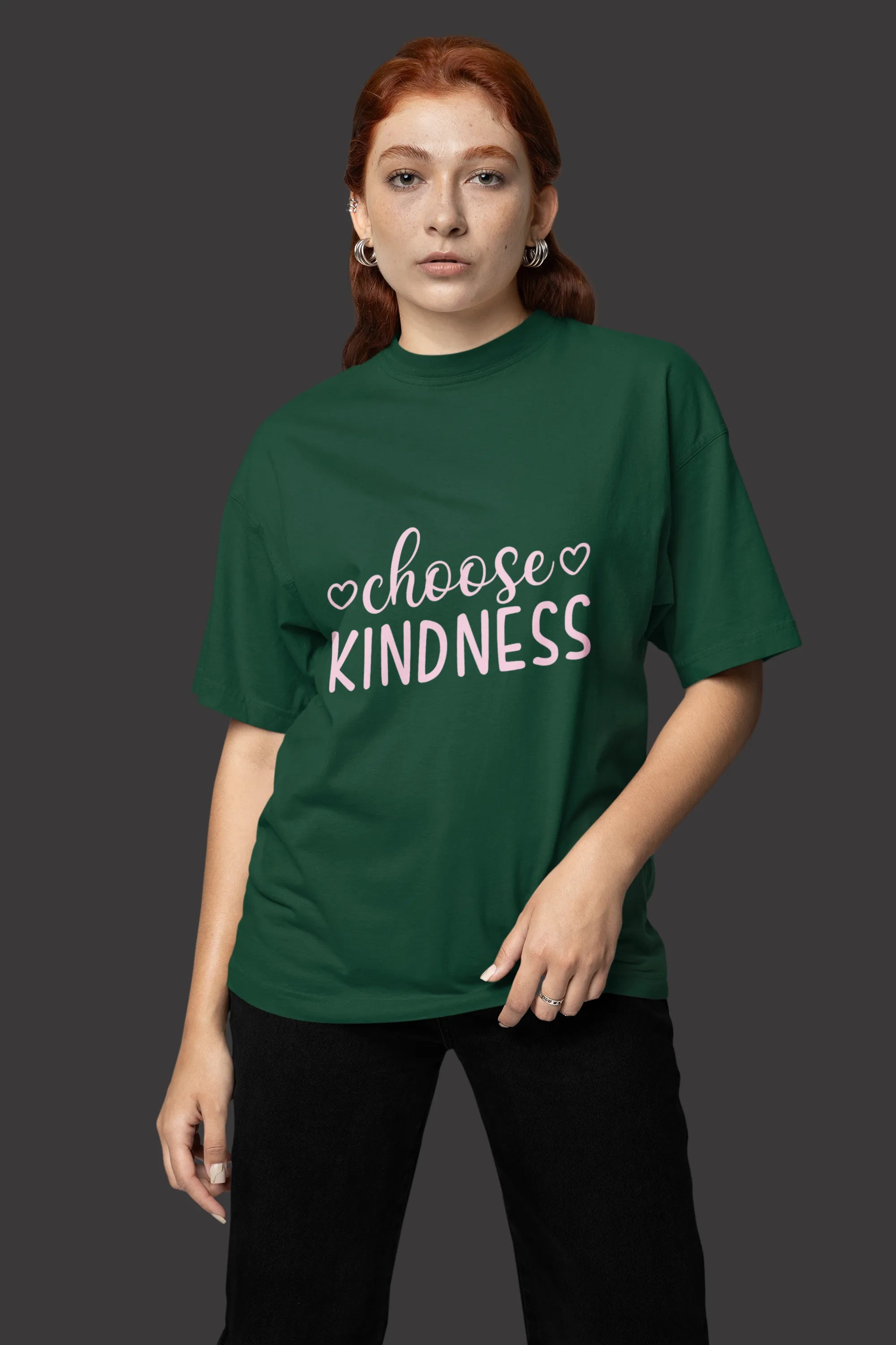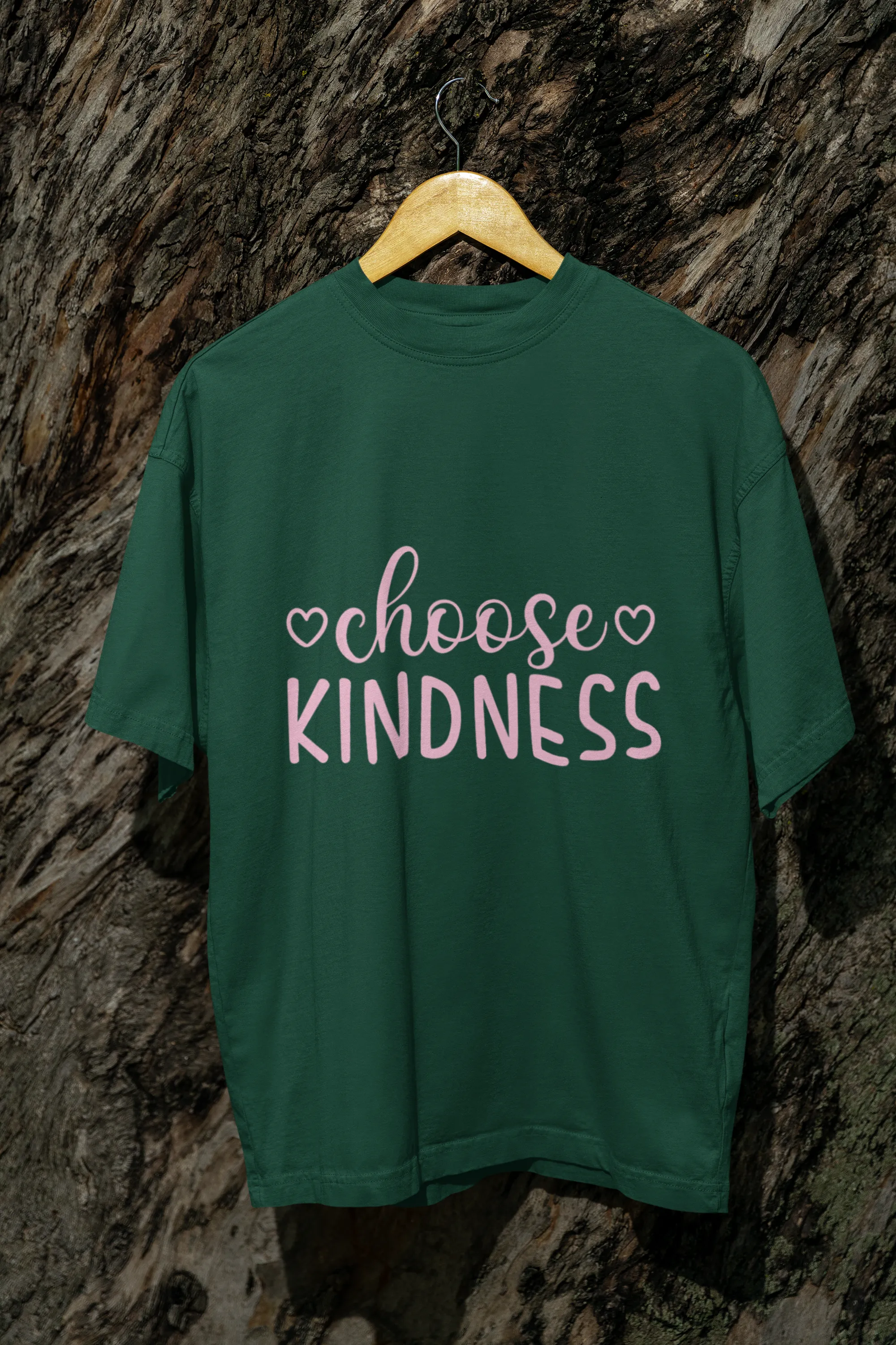 A trendy T-shirt design featuring "Choose Kindness" in an elegant, handwritten or bold serif font. Soft pastel tones or vibrant contrasts enhance the message. A heart, smiley, or subtle floral elements add warmth, promoting positivity and compassion with every wear.