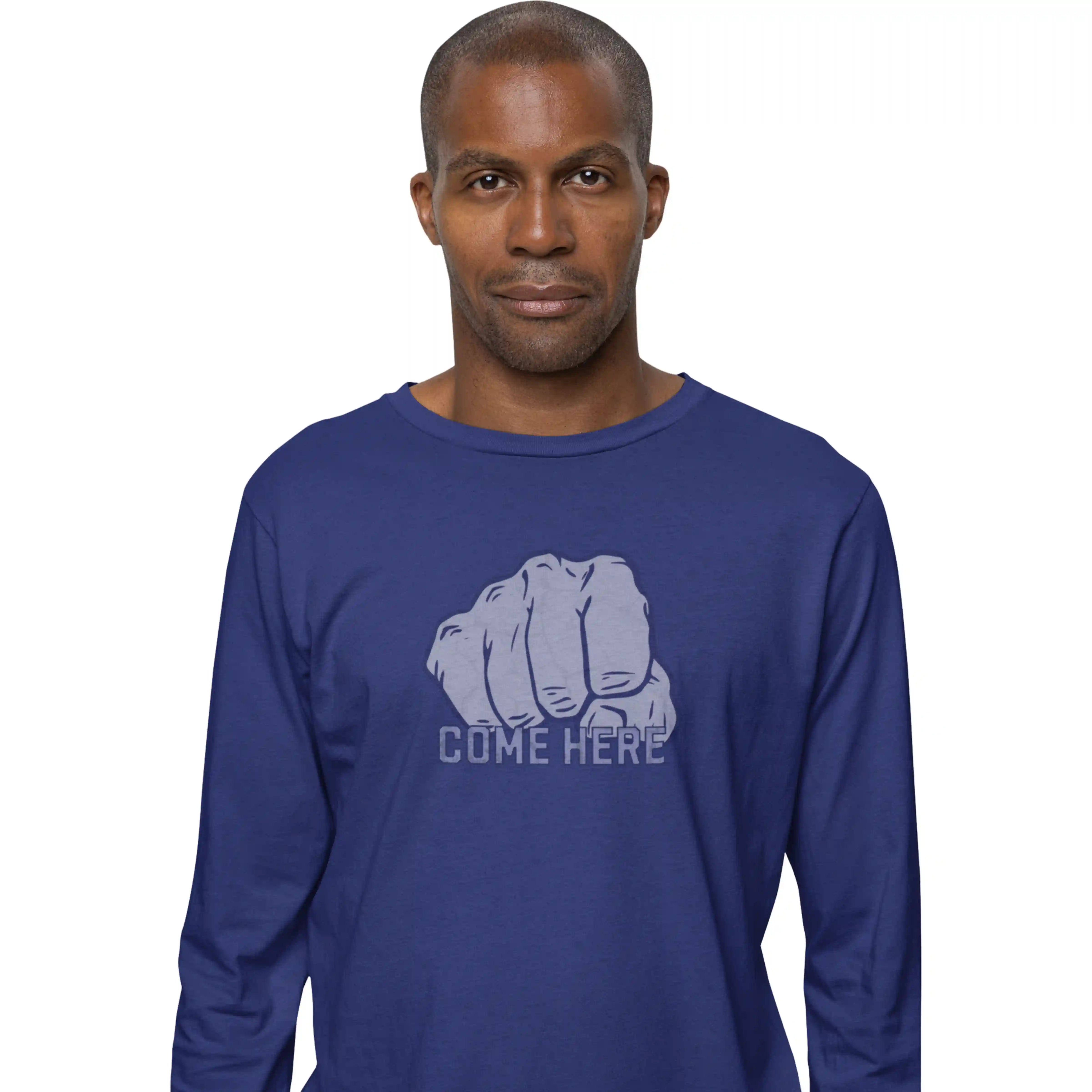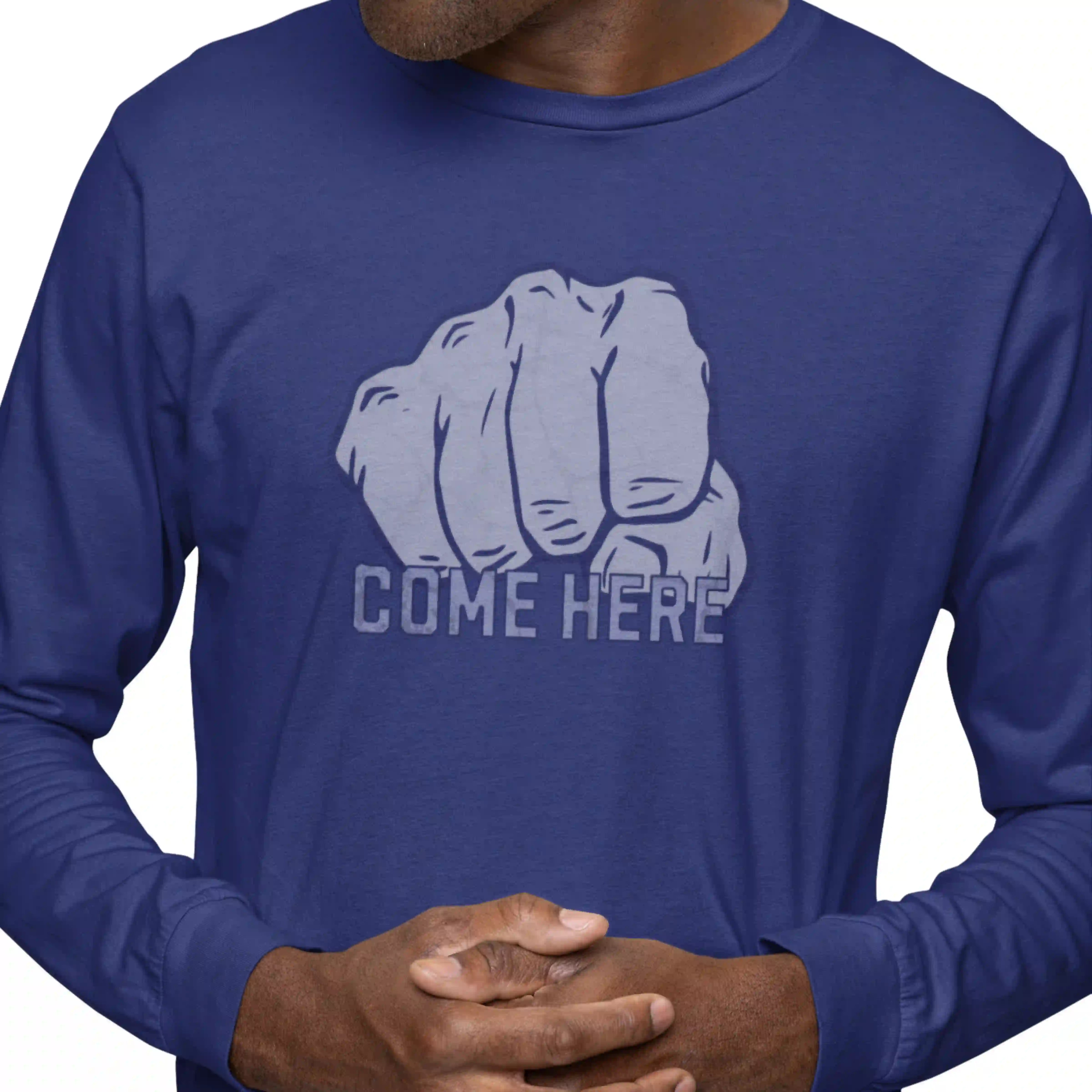 Turn heads in this royal blue full-sleeve T-shirt featuring the bold “Come Here” print. Its regular fit and round neck design offer lasting comfort, perfect for adding playful charm and confidence to your casual wear.