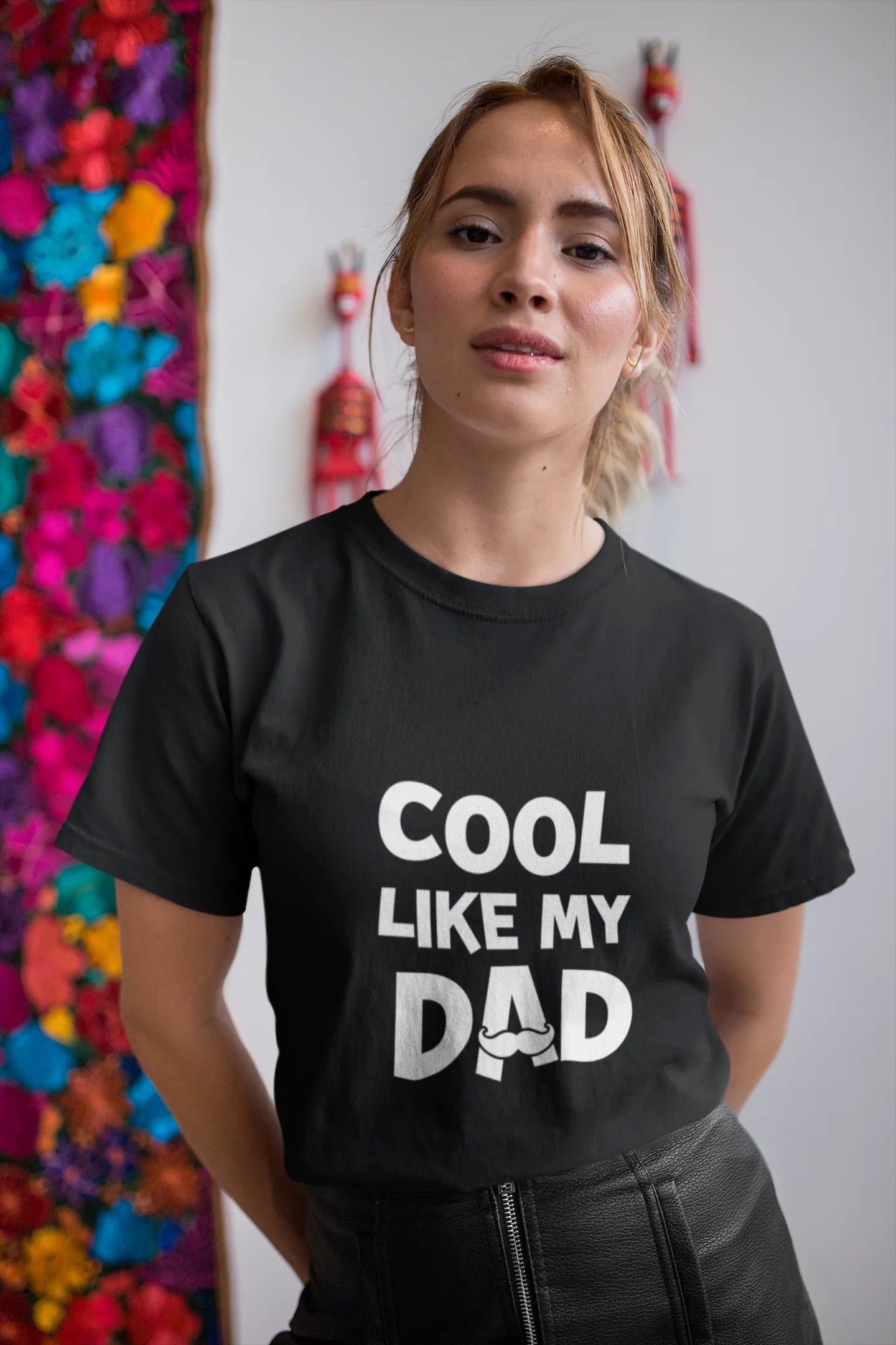 Woman wearing a black t-shirt with 'Cool like my dad' text outdoors.