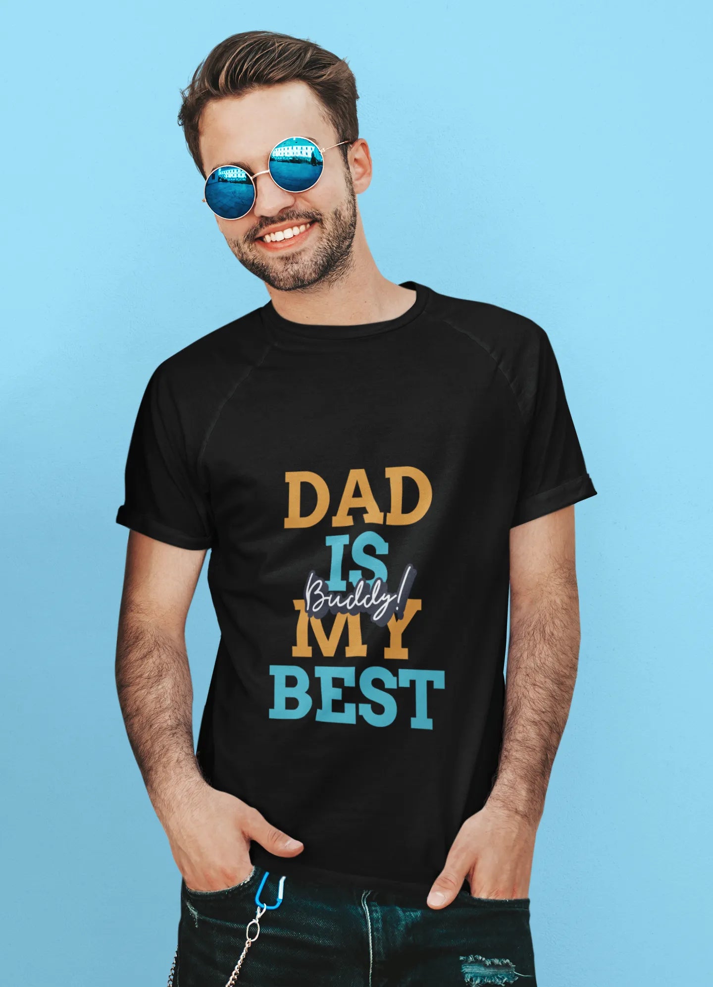 A stylish T-shirt featuring “Dad is My Best Buddy” in bold, playful typography. The design includes a heartwarming illustration of a father and child, complemented by minimalistic doodles or a vintage badge-style emblem. Perfect for expressing love and friendship!