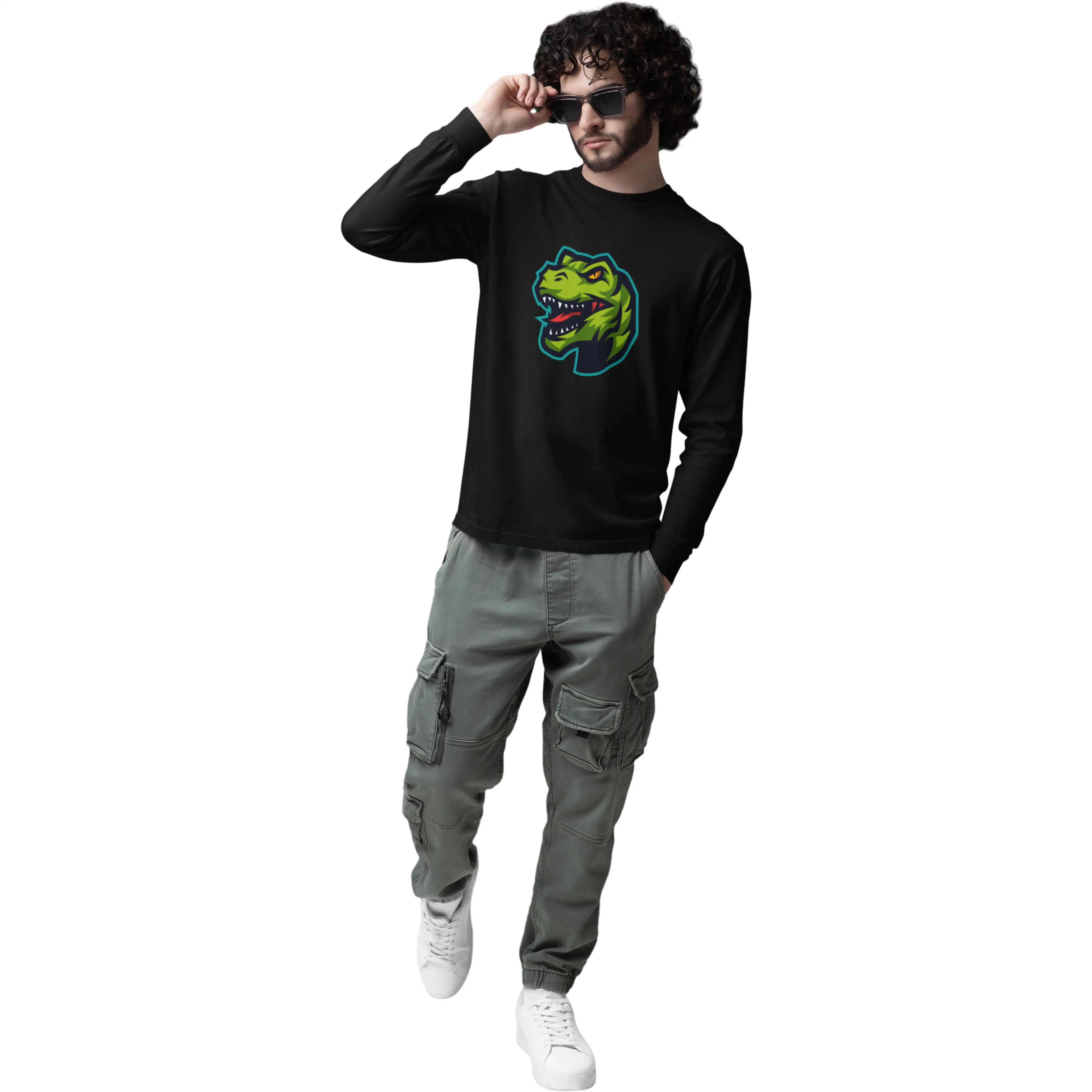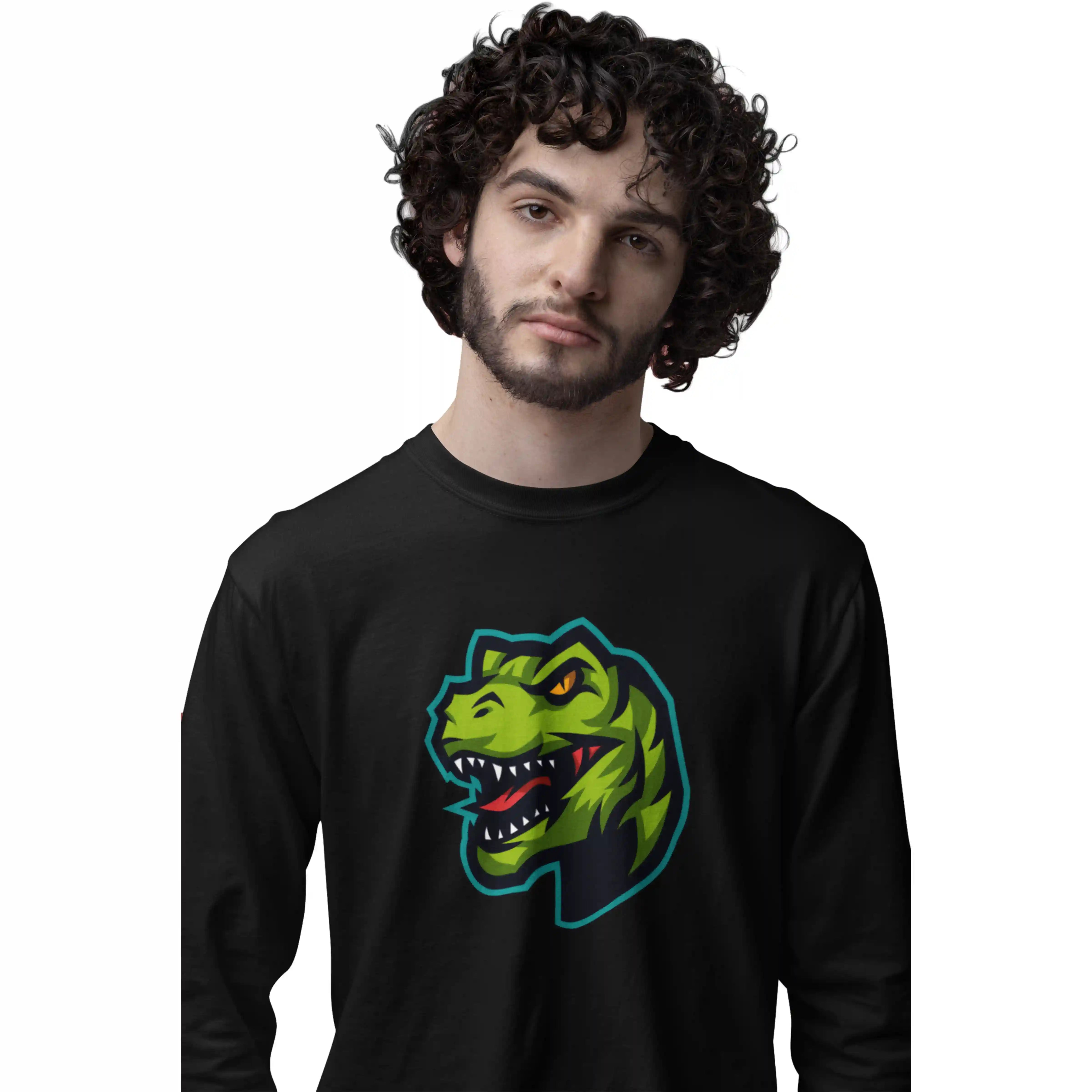 Black t-shirt with a green dinosaur graphic on a white background
