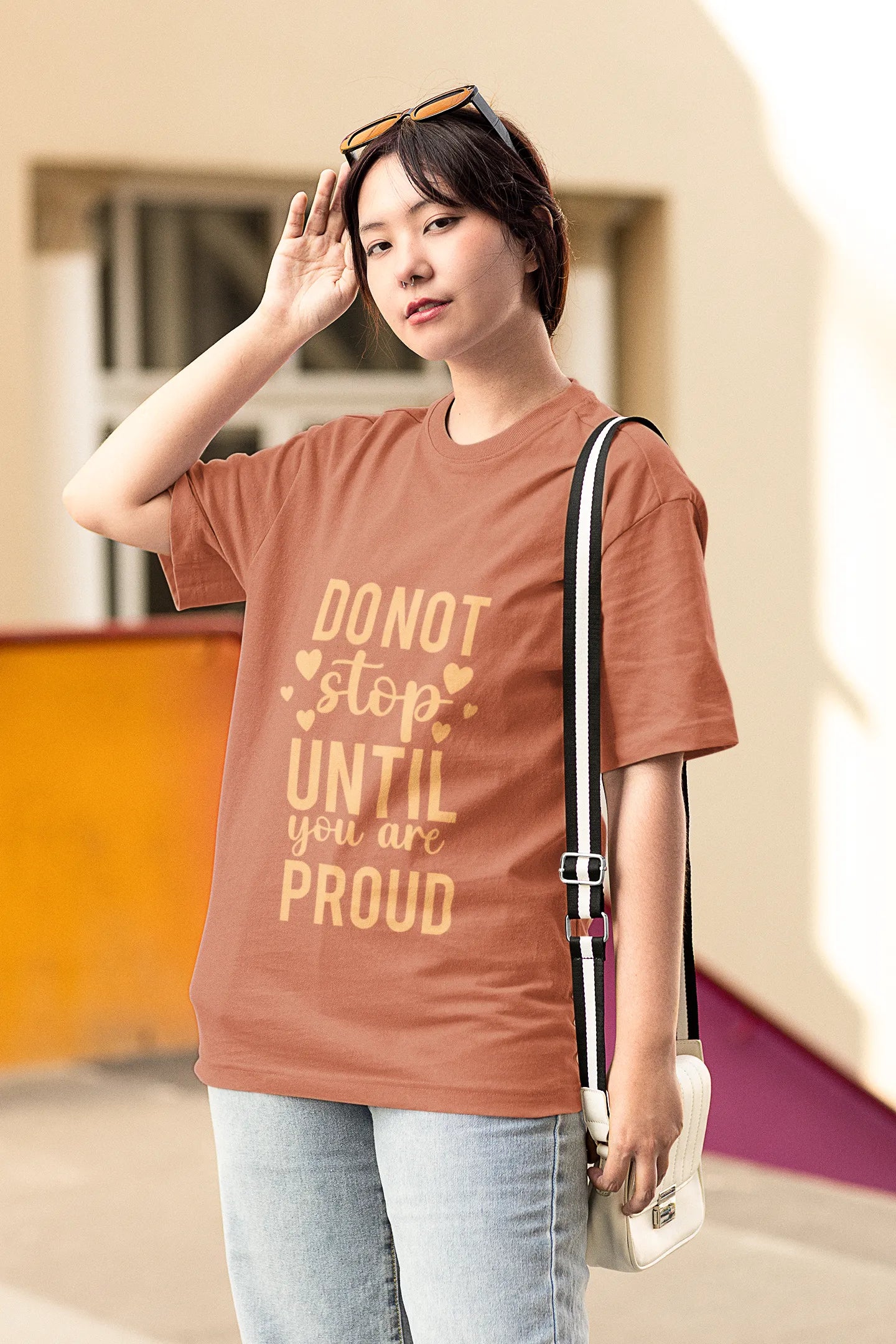 Bold and inspiring, this T-shirt features the powerful quote "Do not stop until you are proud" in sleek typography. Perfect for go-getters, it motivates with every wear, combining minimalist design with a strong, empowering message.