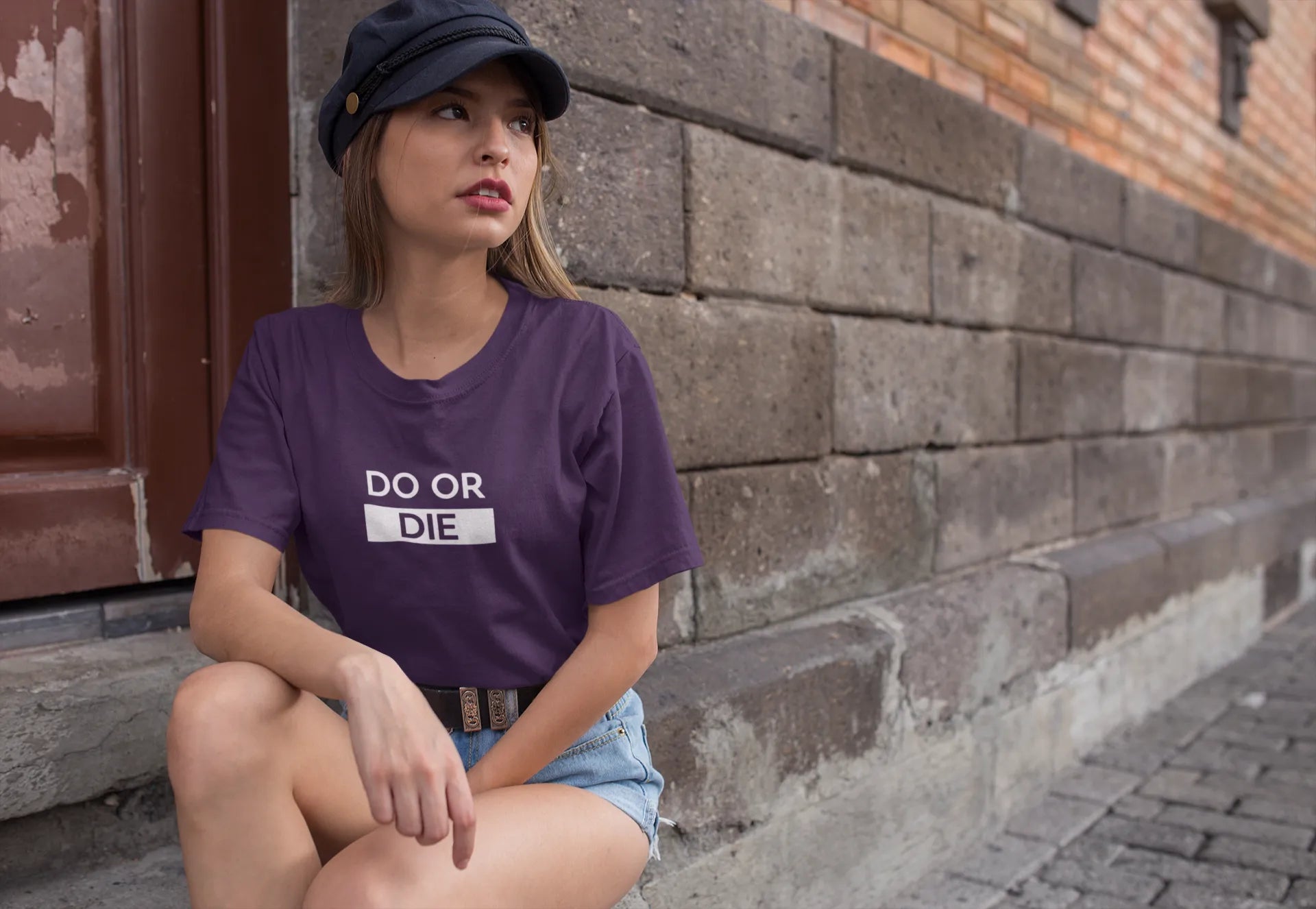 Woman wearing a purple t-shirt with 'DO OR DIE' text in front of a building.