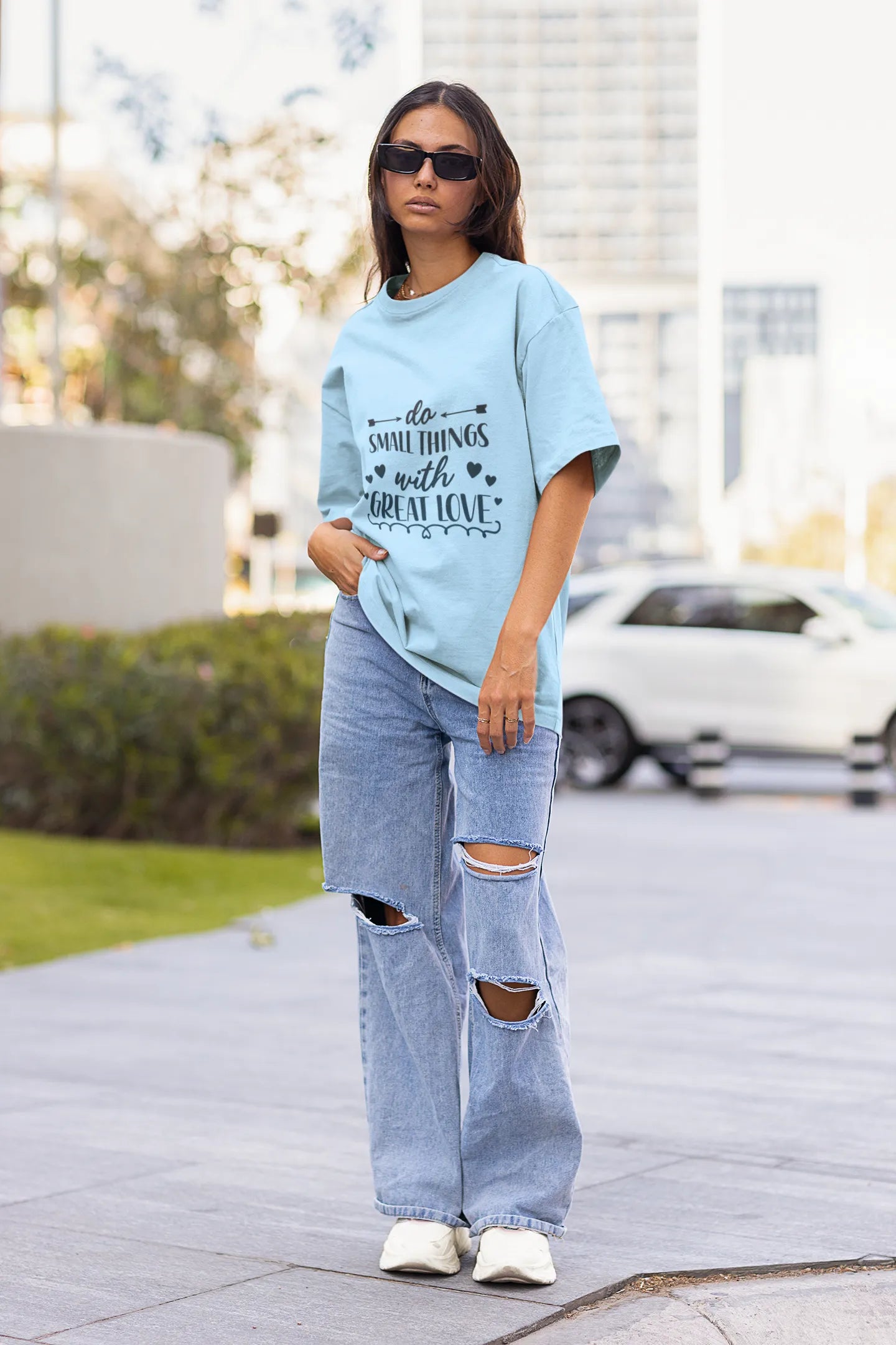 A charming T-shirt design featuring the quote "Do Small Things with Great Love" in an elegant, hand-lettered script. Soft pastel tones or heart accents enhance the message, creating a warm, uplifting look perfect for spreading positivity and kindness effortlessly.