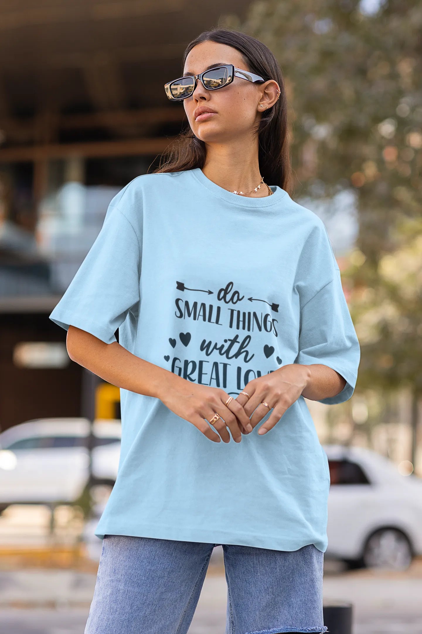 A charming T-shirt design featuring the quote "Do Small Things with Great Love" in an elegant, hand-lettered script. Soft pastel tones or heart accents enhance the message, creating a warm, uplifting look perfect for spreading positivity and kindness effortlessly.