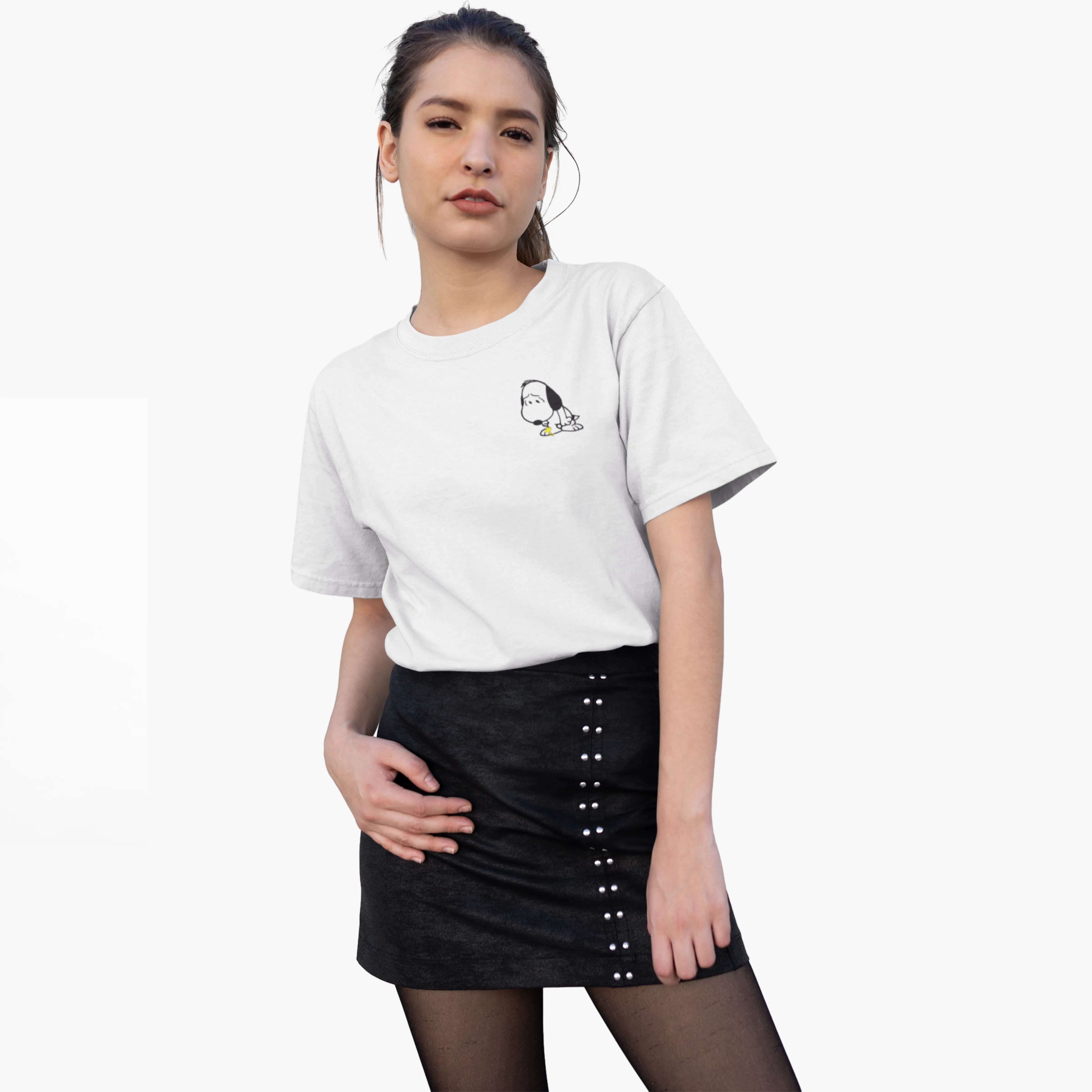 Step out in style with this white dog-themed T-shirt, combining softness, comfort, and a flattering fit. Its minimalist round-neck design makes it easy to style for a fresh, casual look while expressing your love for adorable canine companions.