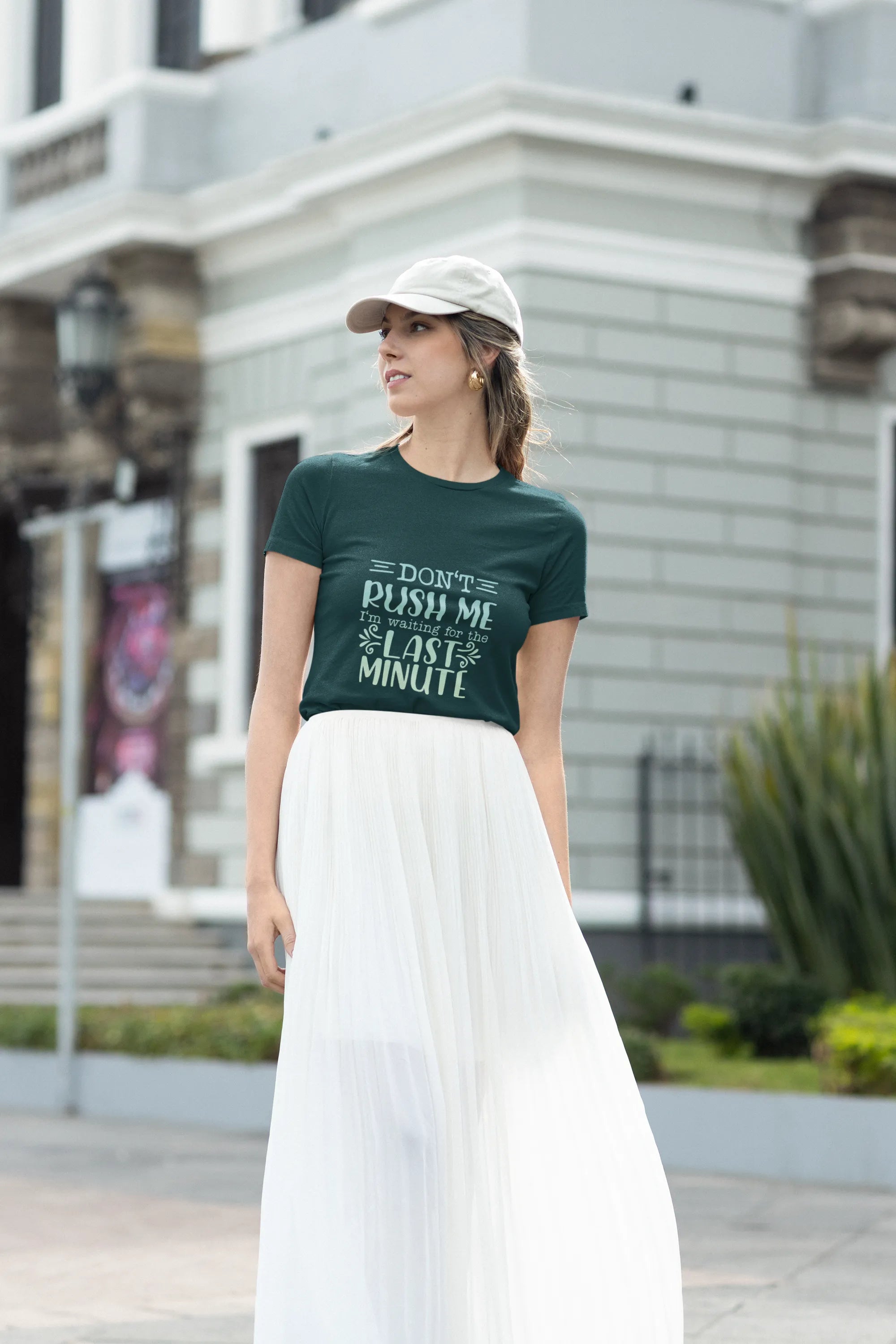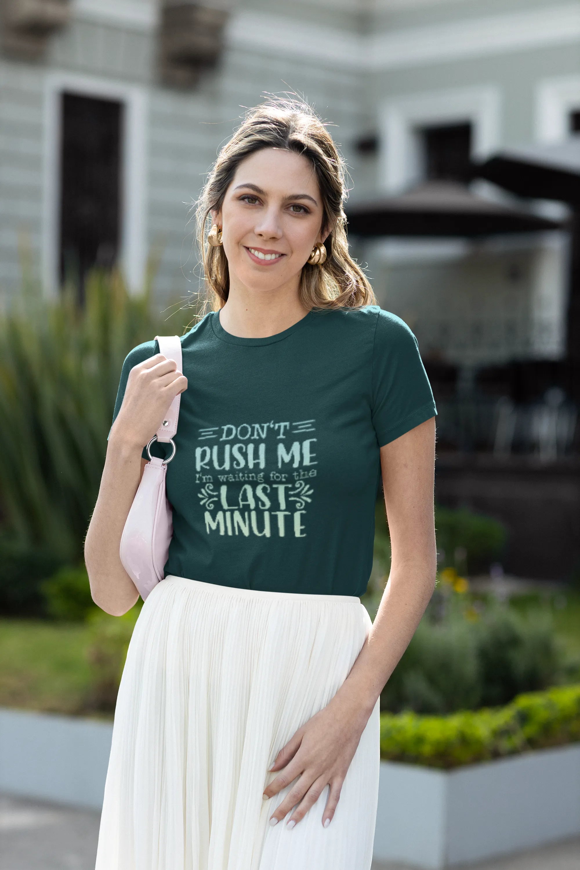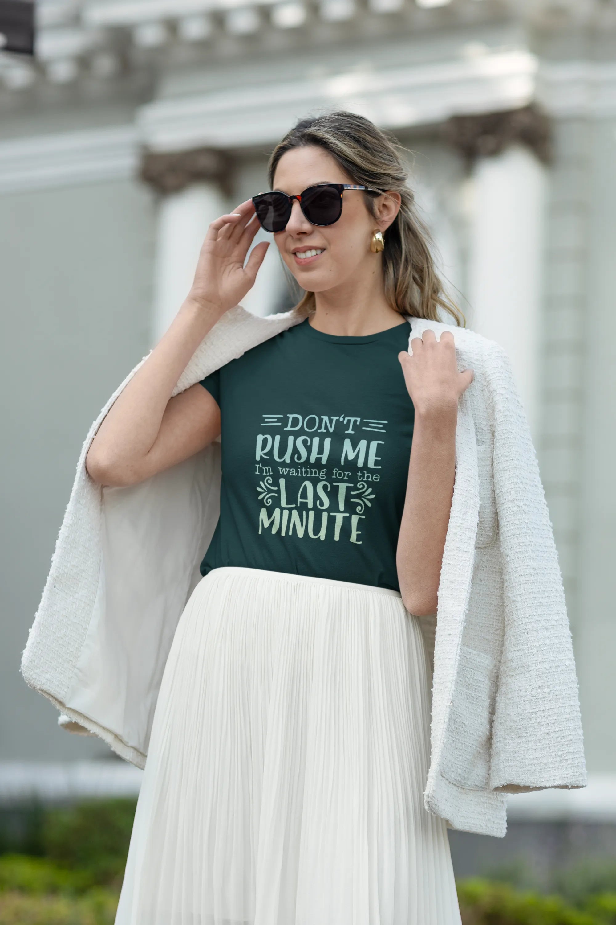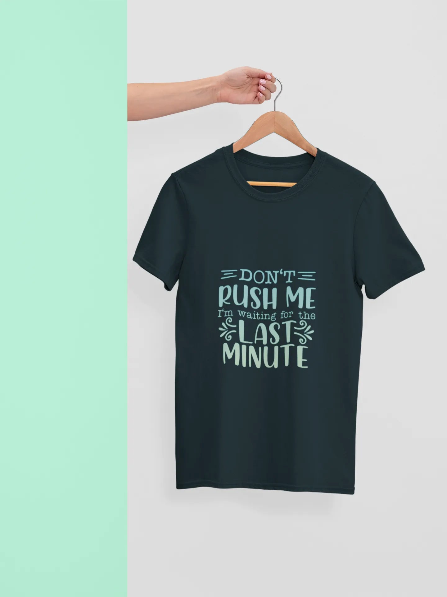 This T-shirt features a witty quote: "Don't rush me, I'm waiting for the last minute," in bold, playful typography. Perfect for procrastinators with humor, the design adds a fun, relatable touch to your casual style.