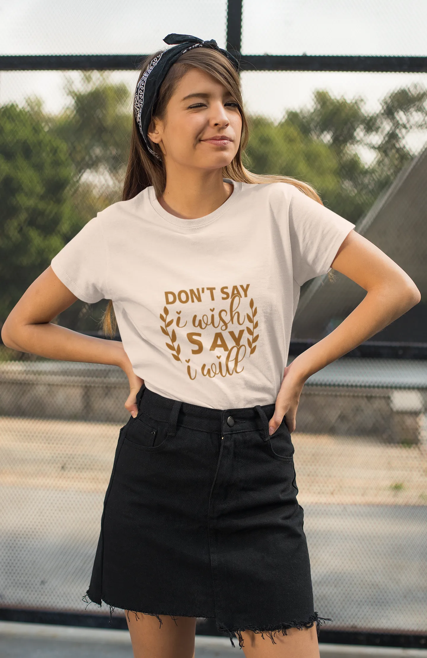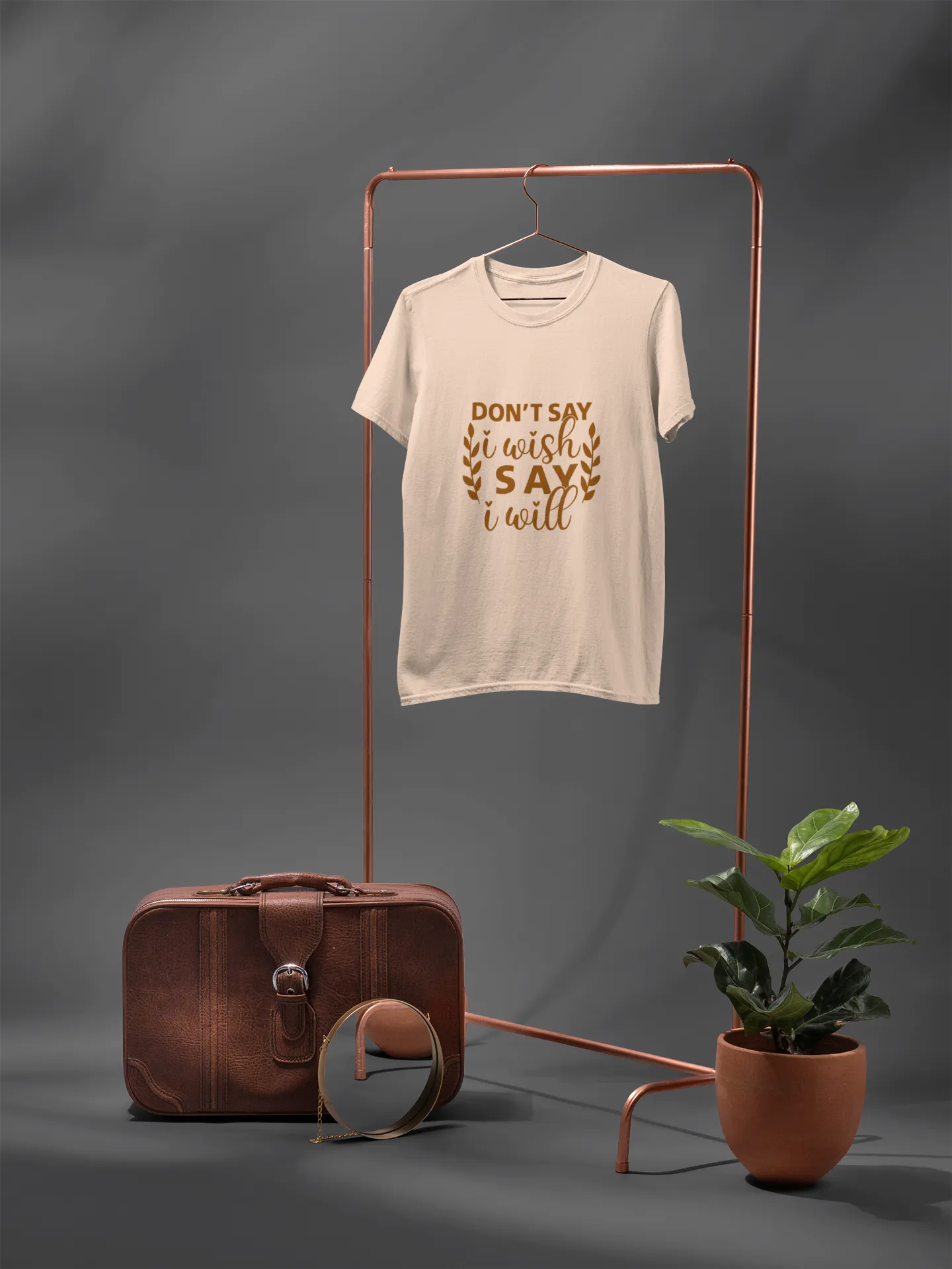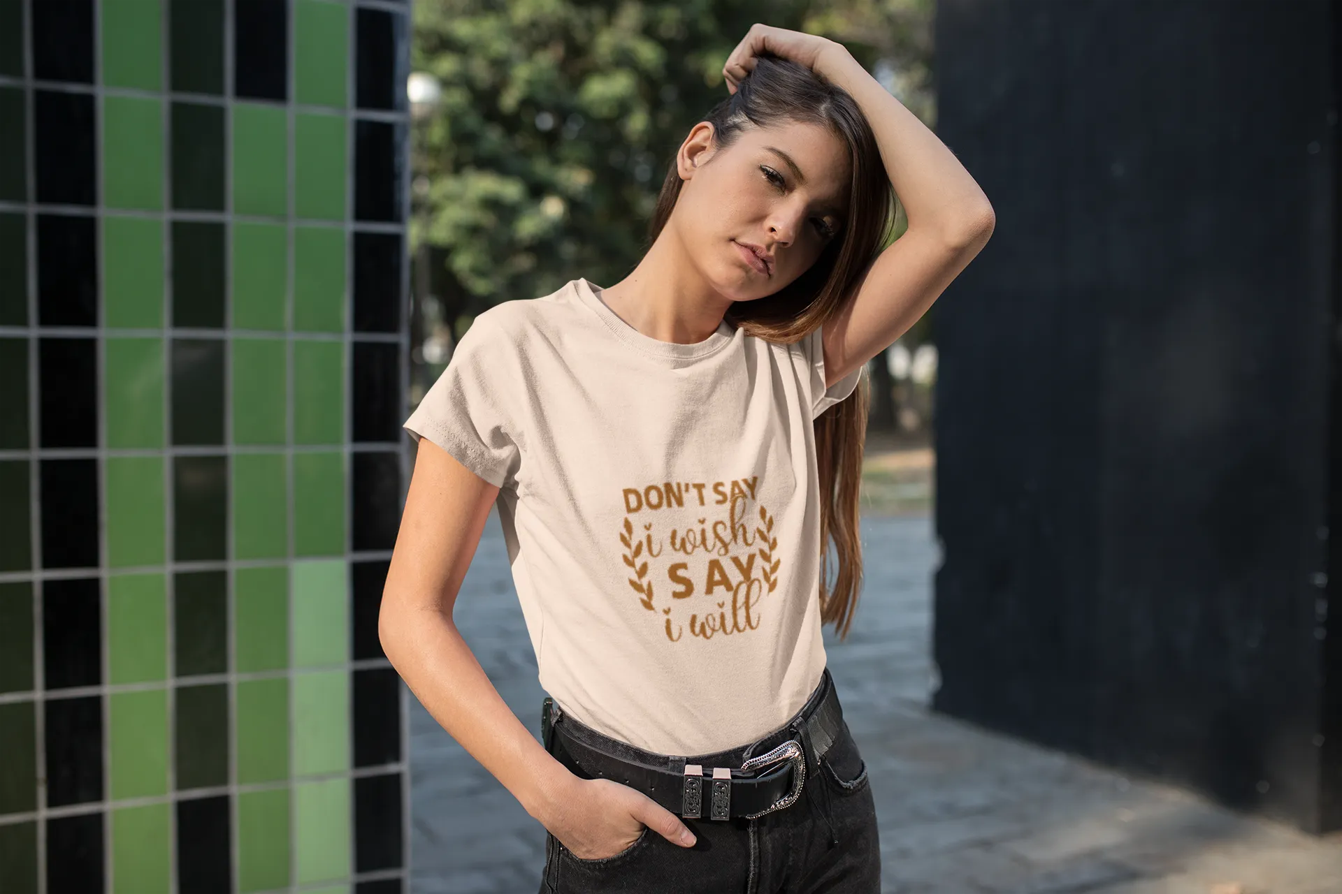 A bold and empowering t-shirt design featuring the phrase “Don’t say I wish, say I will” in stylish typography. Perfectly blended with motivational vibes, this design inspires confidence, determination, and a go-getter attitude. Ideal for dreamers and doers.