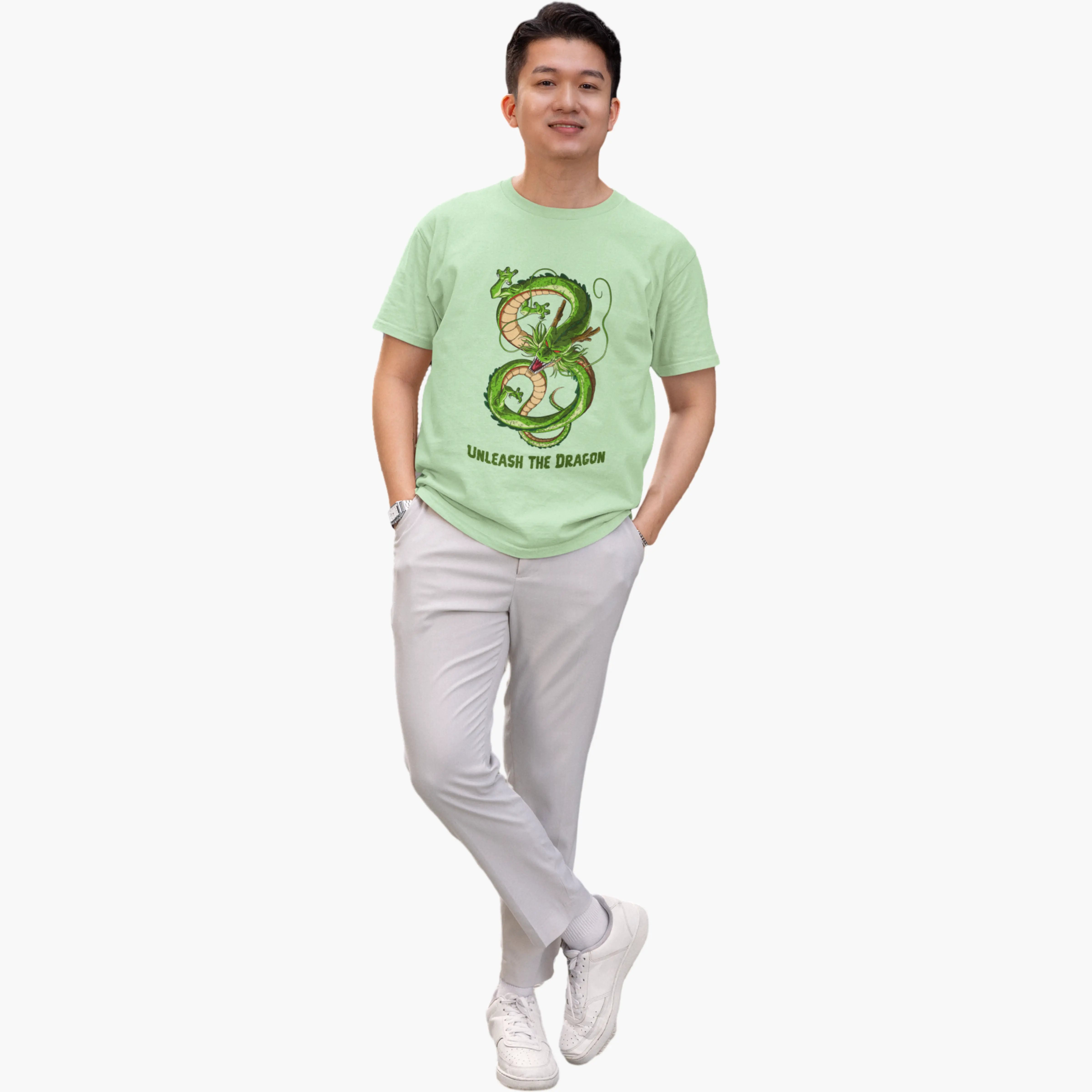A bold jade t-shirt featuring a striking dragon design, symbolizing power and strength. With its round neck and regular fit, it’s both stylish and versatile. Perfect for those who love fearless fashion and want to make a strong statement.