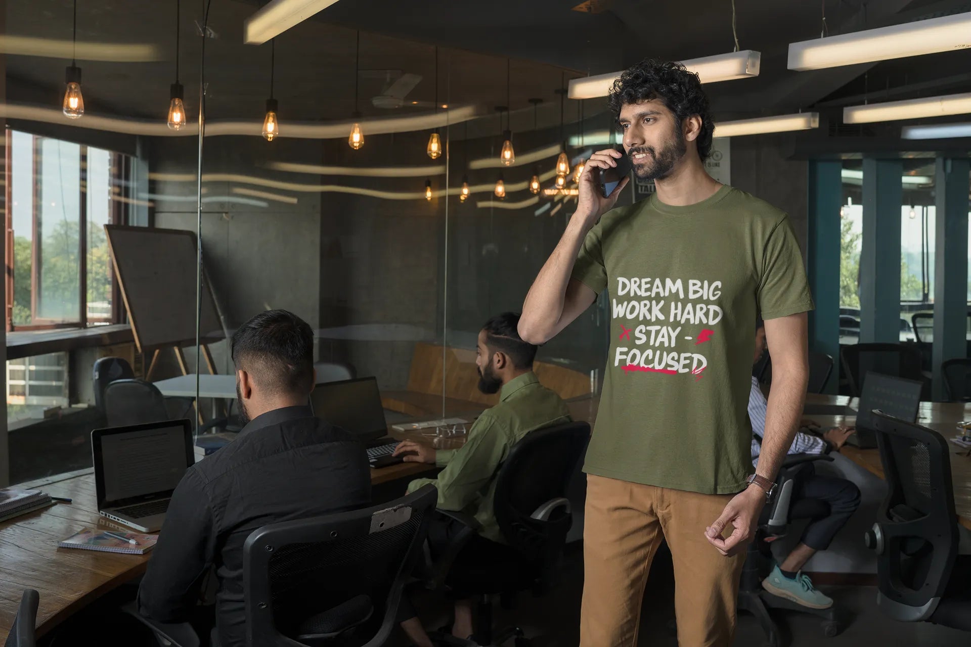 A bold and inspiring T-shirt design featuring "Dream Big, Work Hard" in dynamic typography. The text blends modern calligraphy with strong block letters, accented by motivational graphics like stars, arrows, or a rising sun, symbolizing ambition, determination, and success.