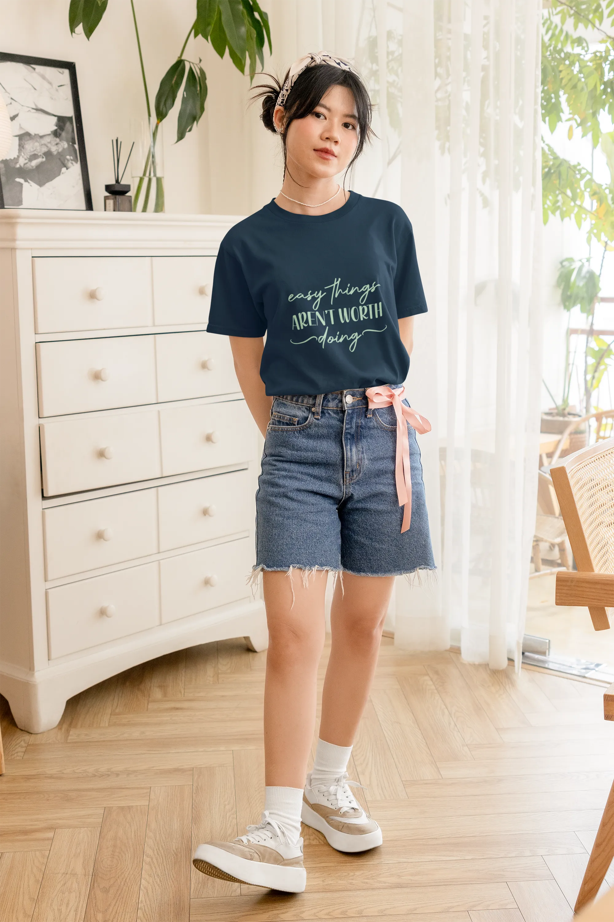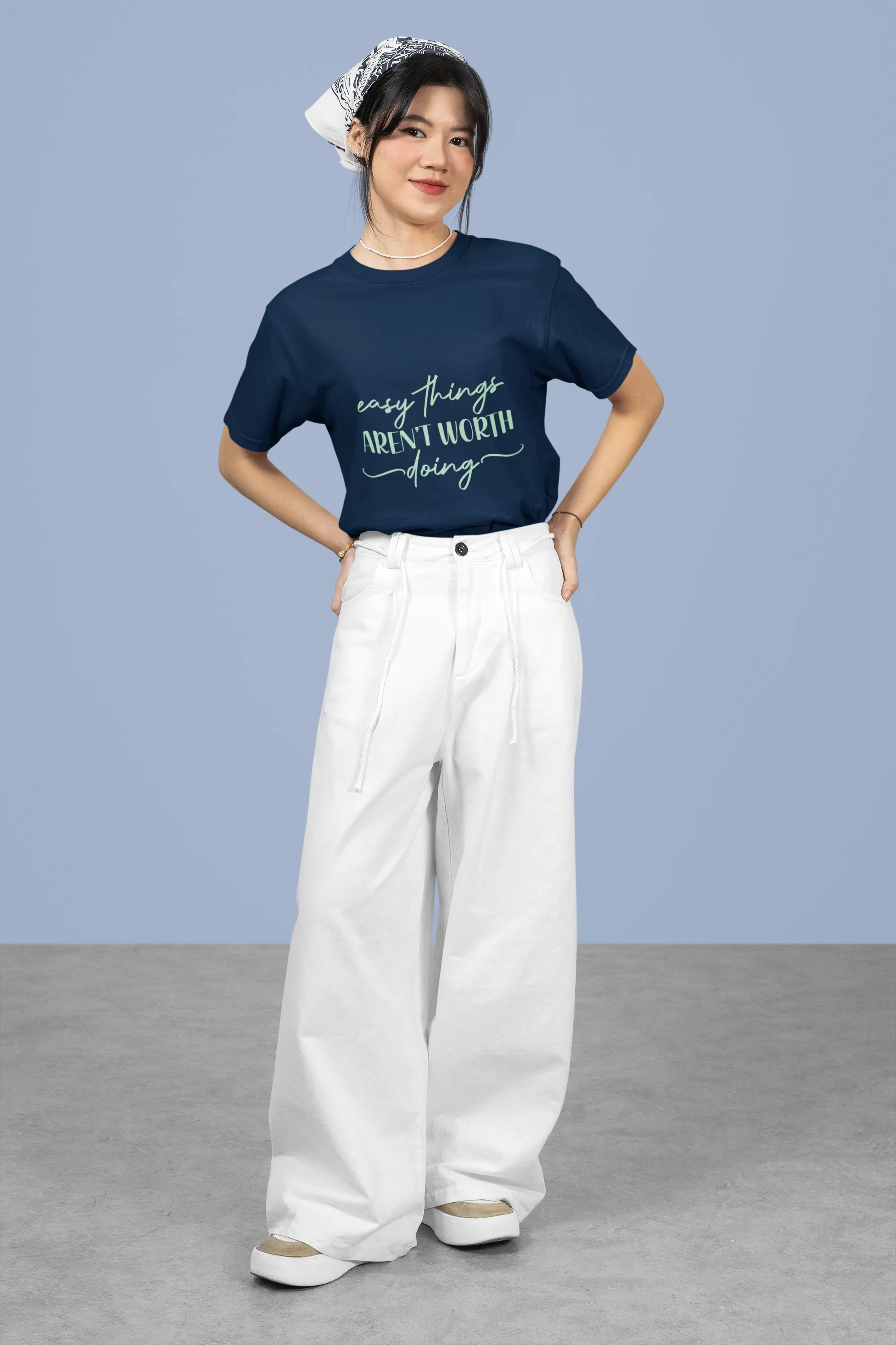 Person wearing a navy blue t-shirt with text on a solid background