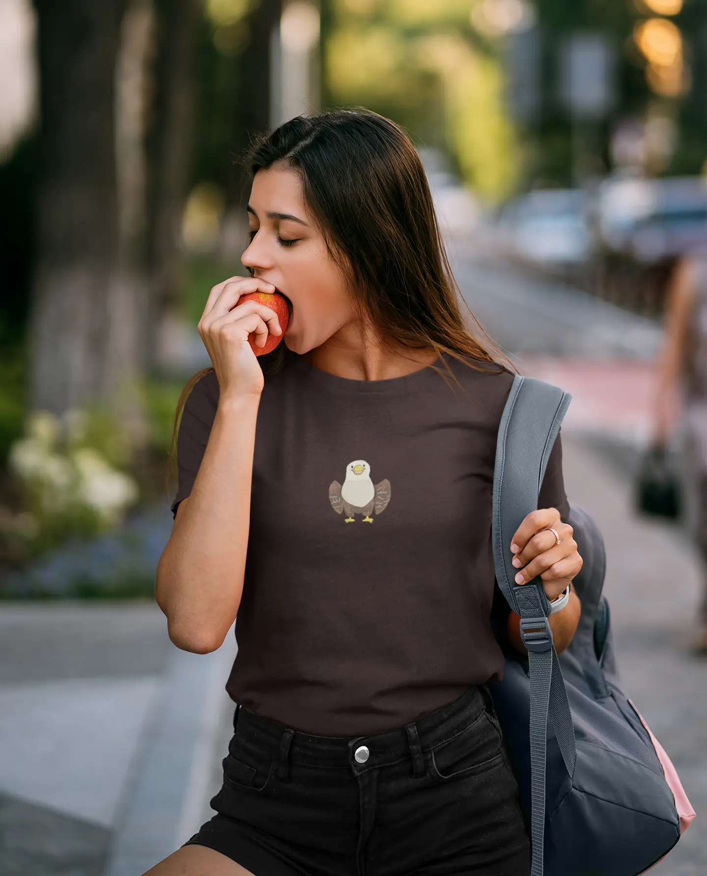 Woman wearing a black t-shirt with a graphic design, holding an apple, and carrying a gray backpack on a street.