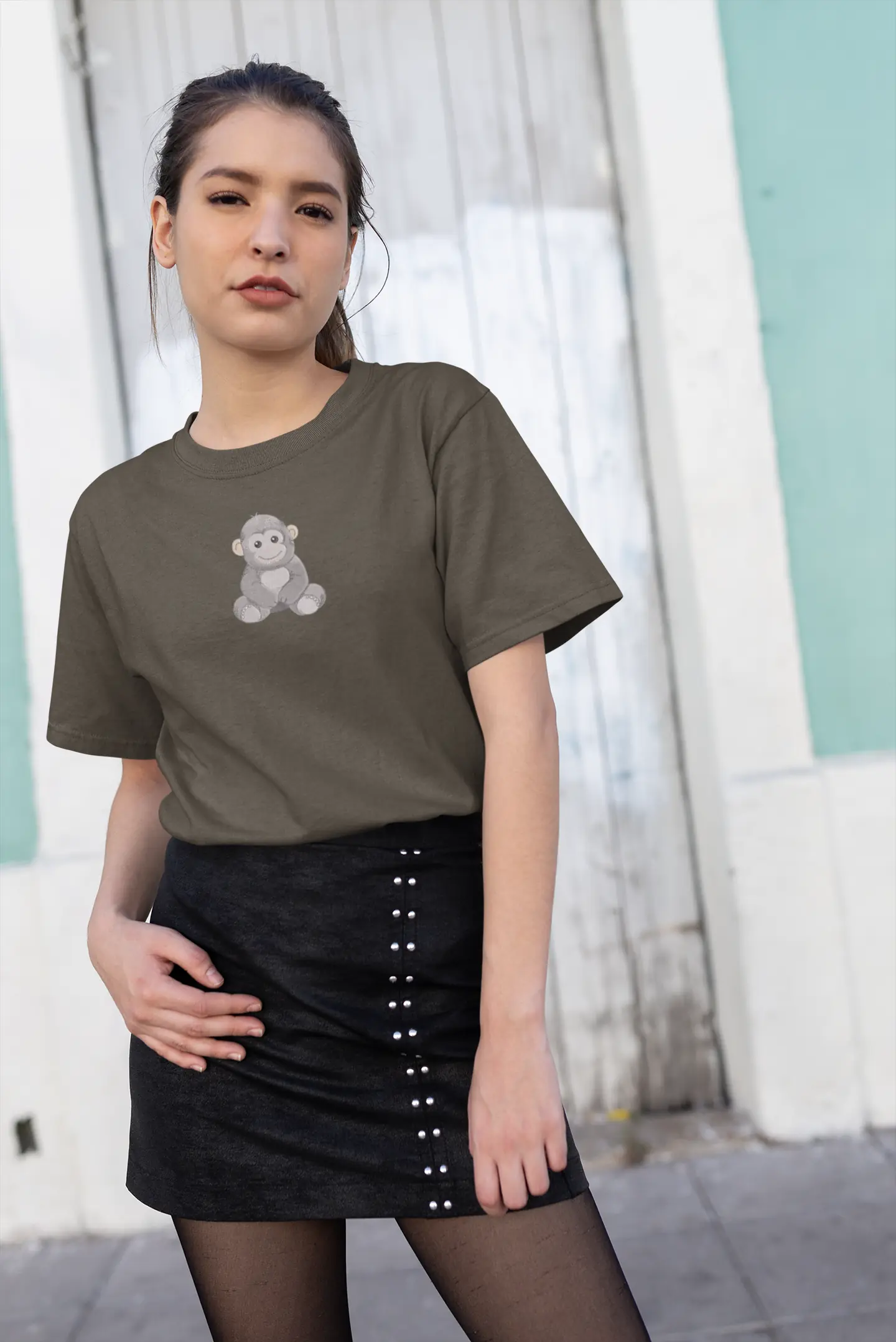 Woman wearing a green sweater with a teddy bear design and a black skirt against a graffiti-covered wall.