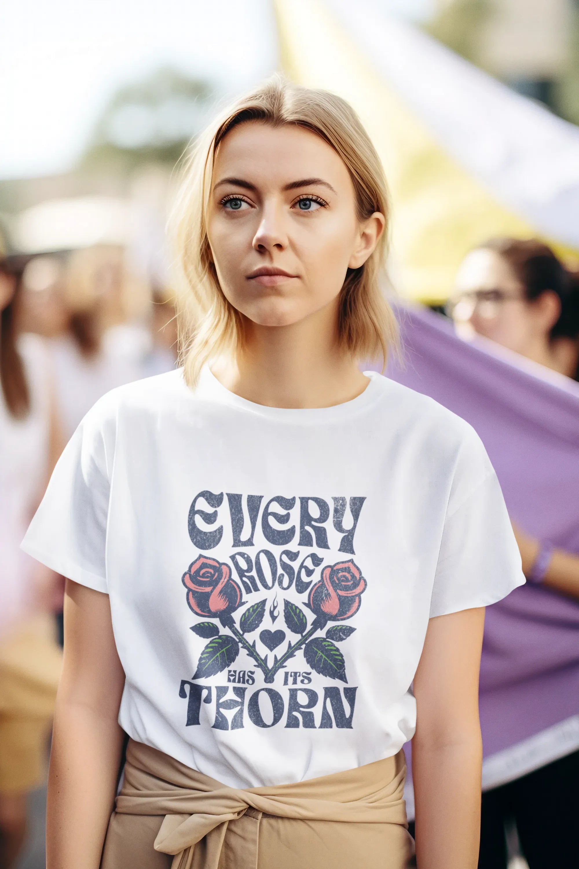 A poetic and edgy T-shirt design featuring the phrase “Every Rose Has Its Thorn” in elegant yet bold typography. Paired with a detailed rose and subtle thorn accents, it symbolizes beauty with strength — perfect for those who embrace love, resilience, and life’s contrasts.
