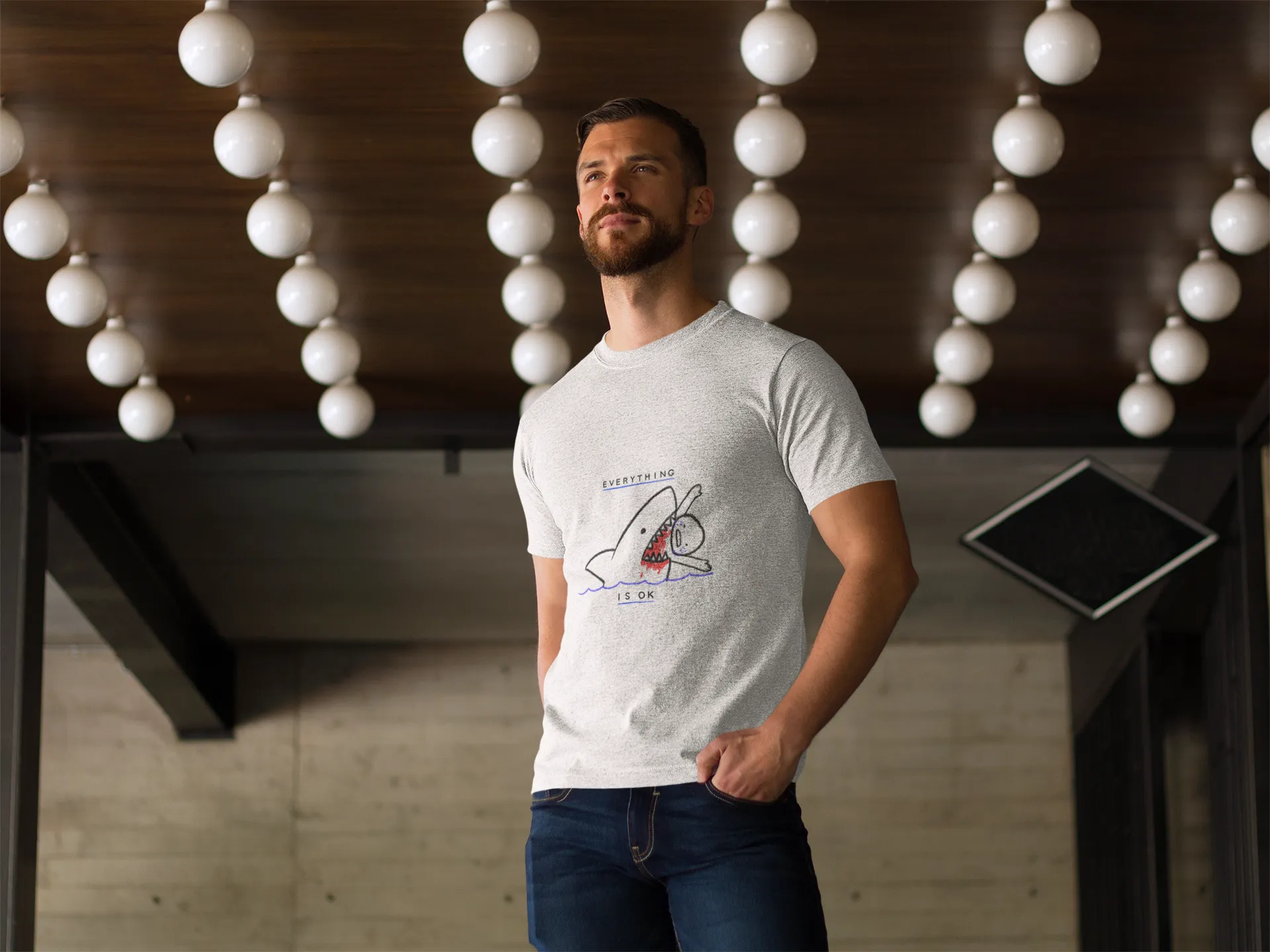 Man wearing a gray t-shirt with a graphic design, standing against a textured wall.