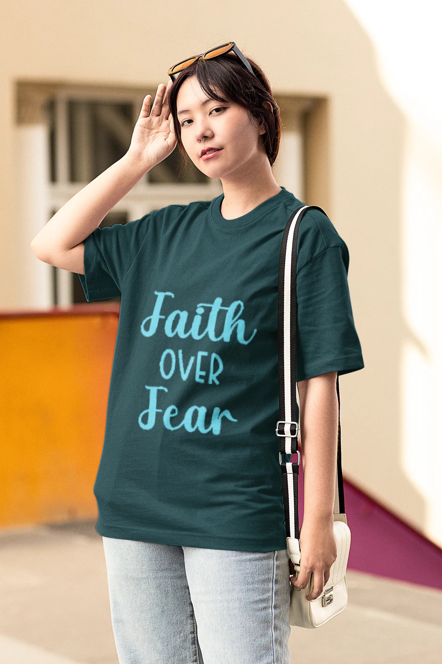 A minimal yet powerful "Faith Over Fear" T-shirt design featuring bold, elegant typography. The words "Faith" and "Fear" contrast in size or color, with subtle artistic elements like a cross, heartbeat line, or dove symbolizing hope and strength.