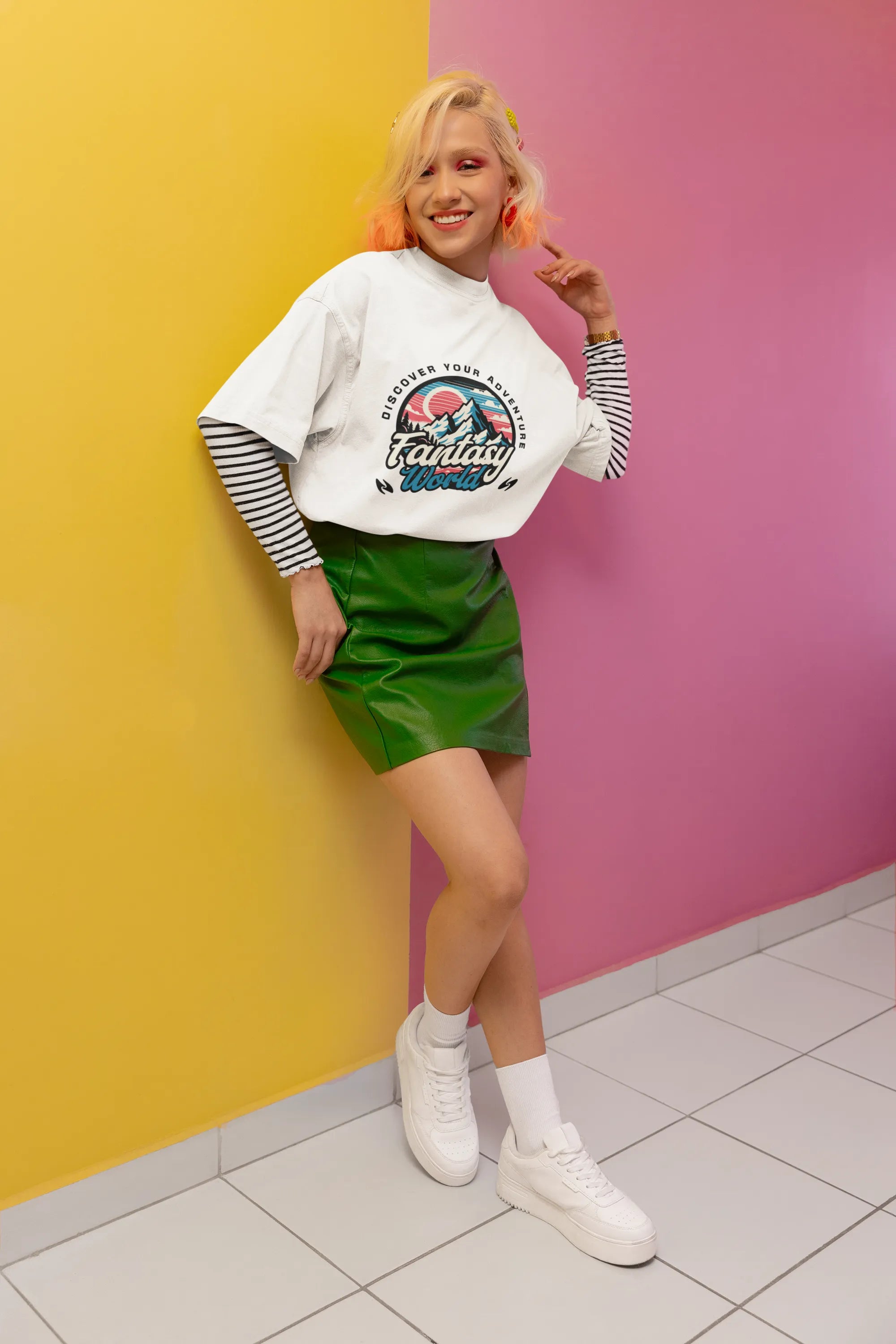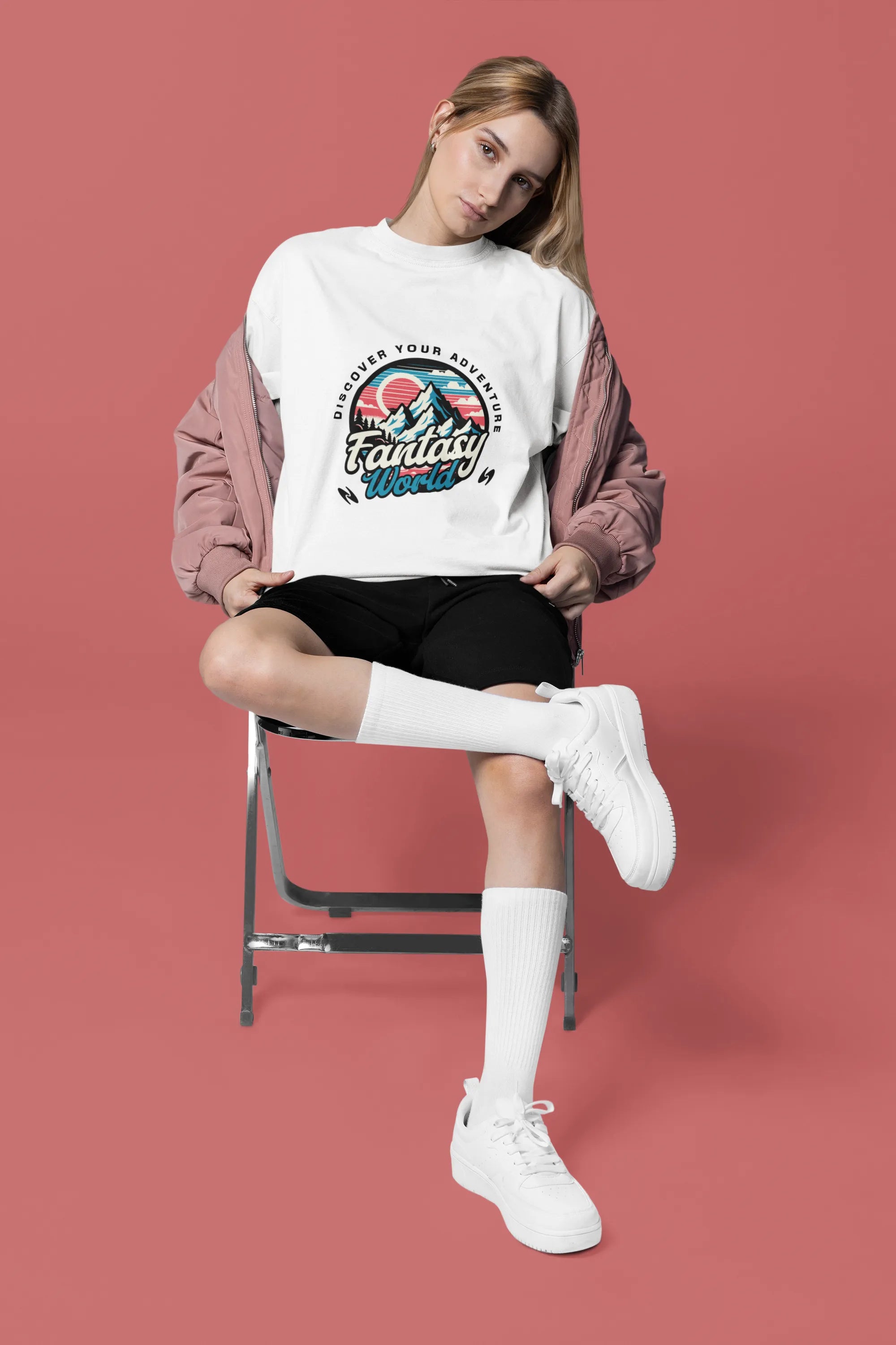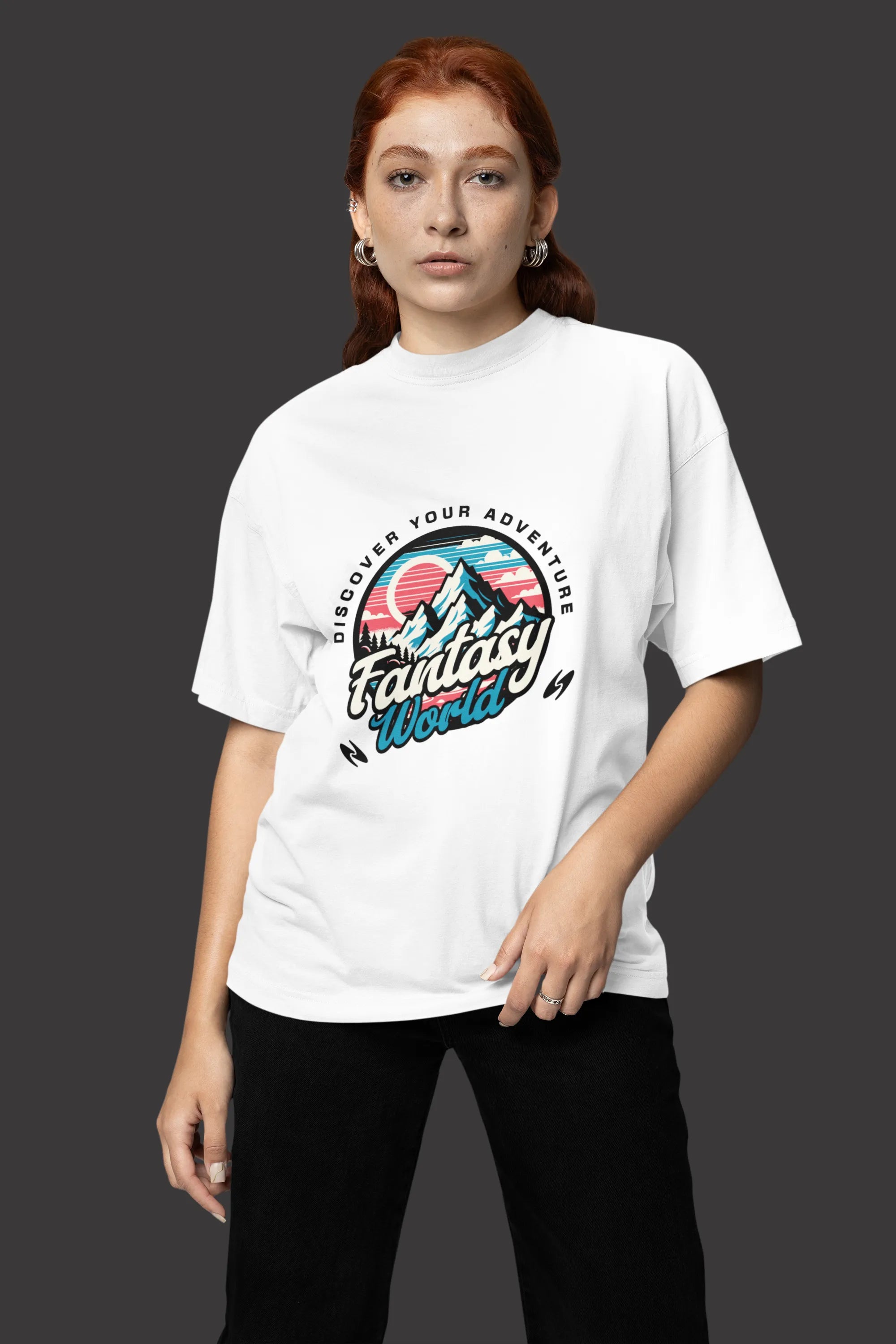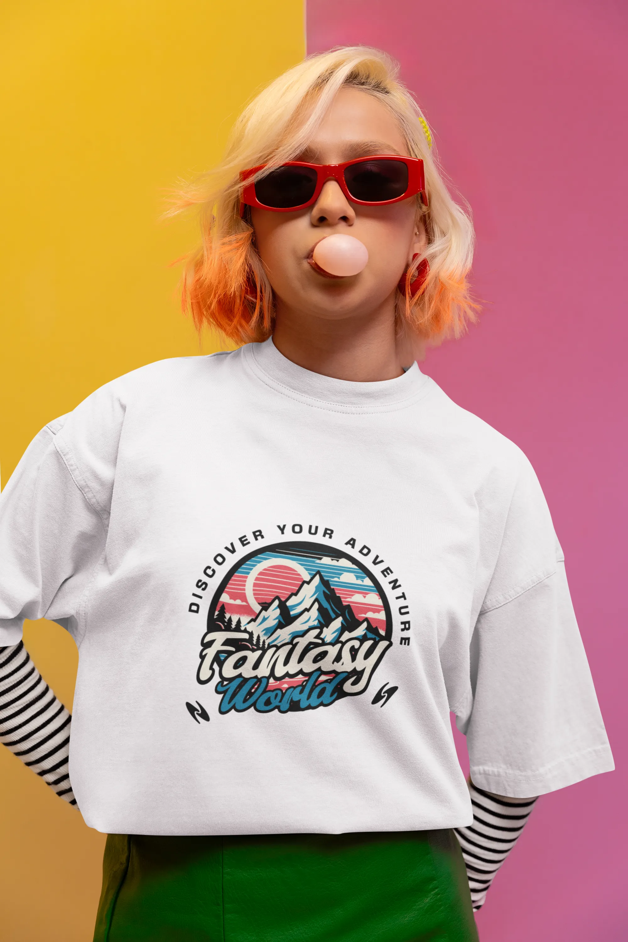 A vibrant fantasy world T-shirt design featuring a mystical landscape with floating islands, glowing mushrooms, and a neon-lit castle under a cosmic sky. Majestic creatures like dragons and phoenixes soar, while an enchanted river flows, creating a dreamlike, otherworldly aesthetic.