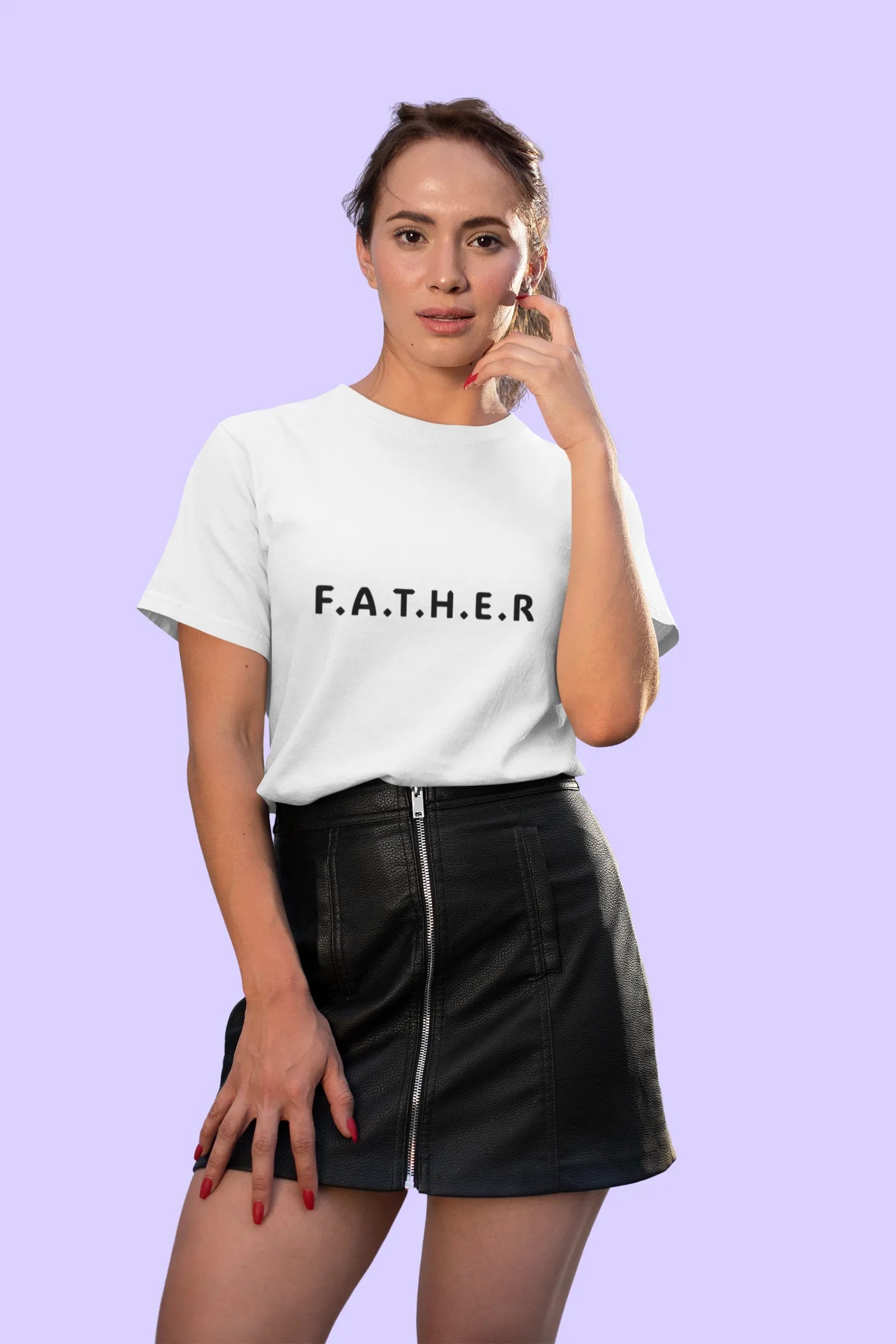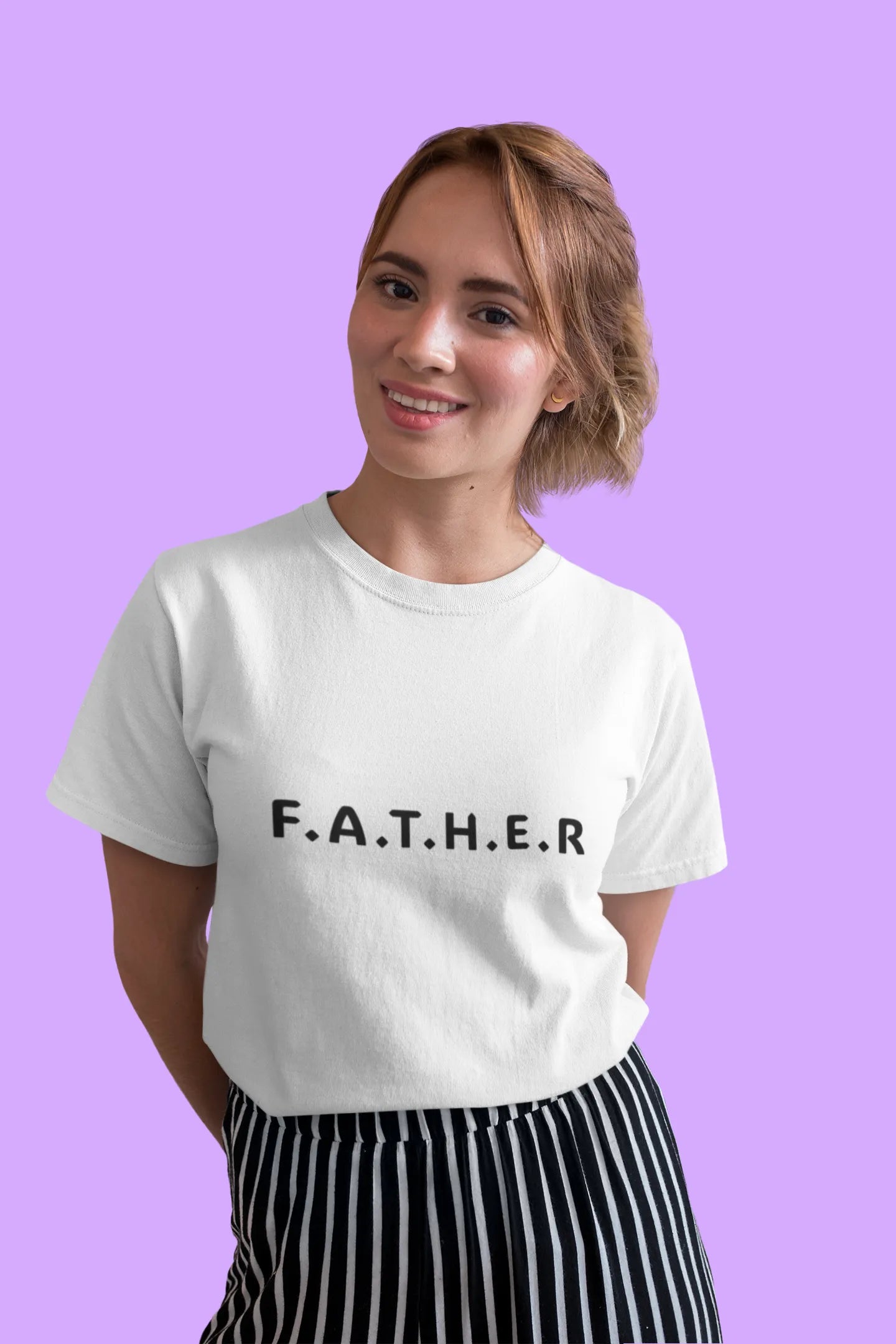 Woman wearing a white t-shirt with 'F.A.T.H.E.R.' text on a purple background