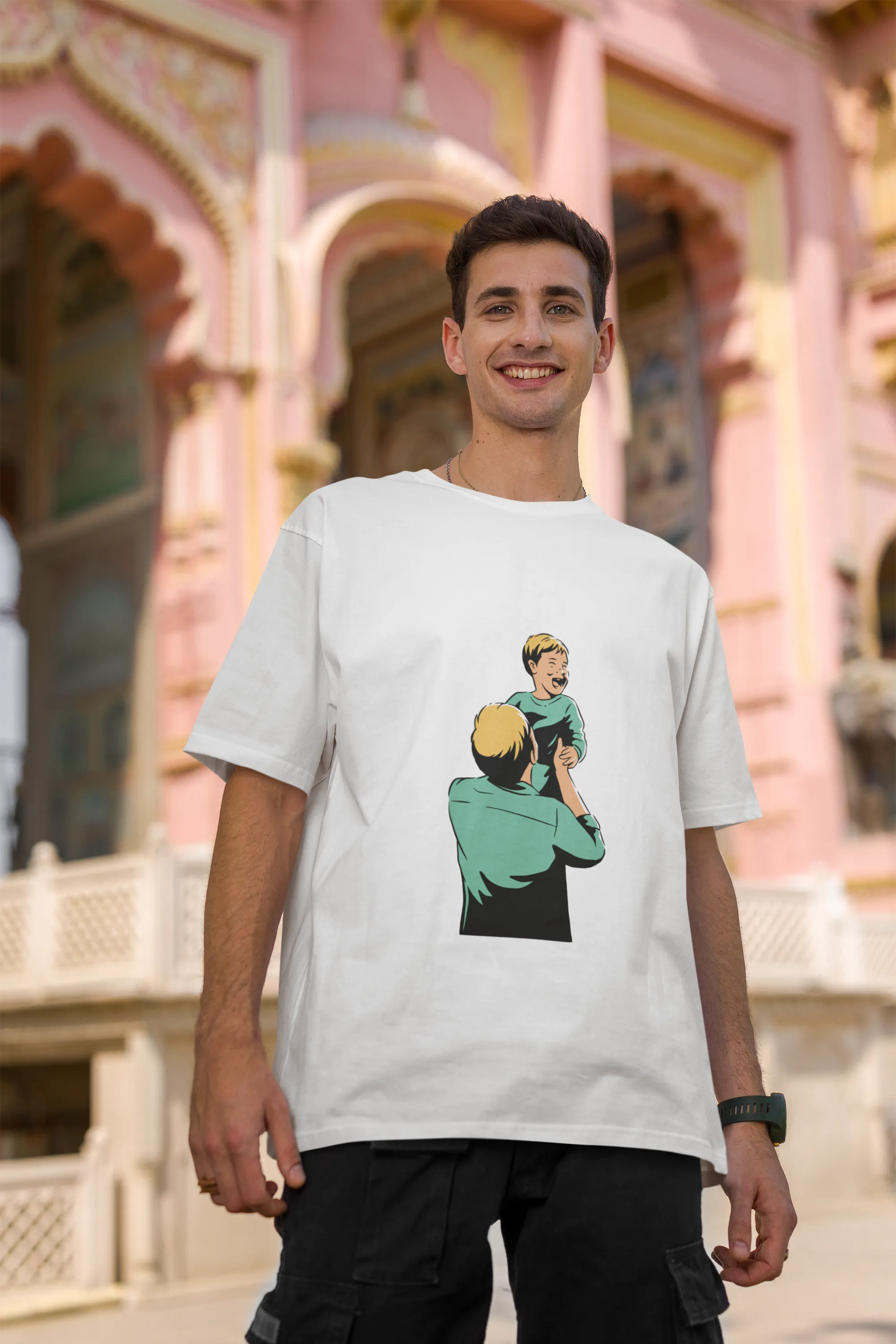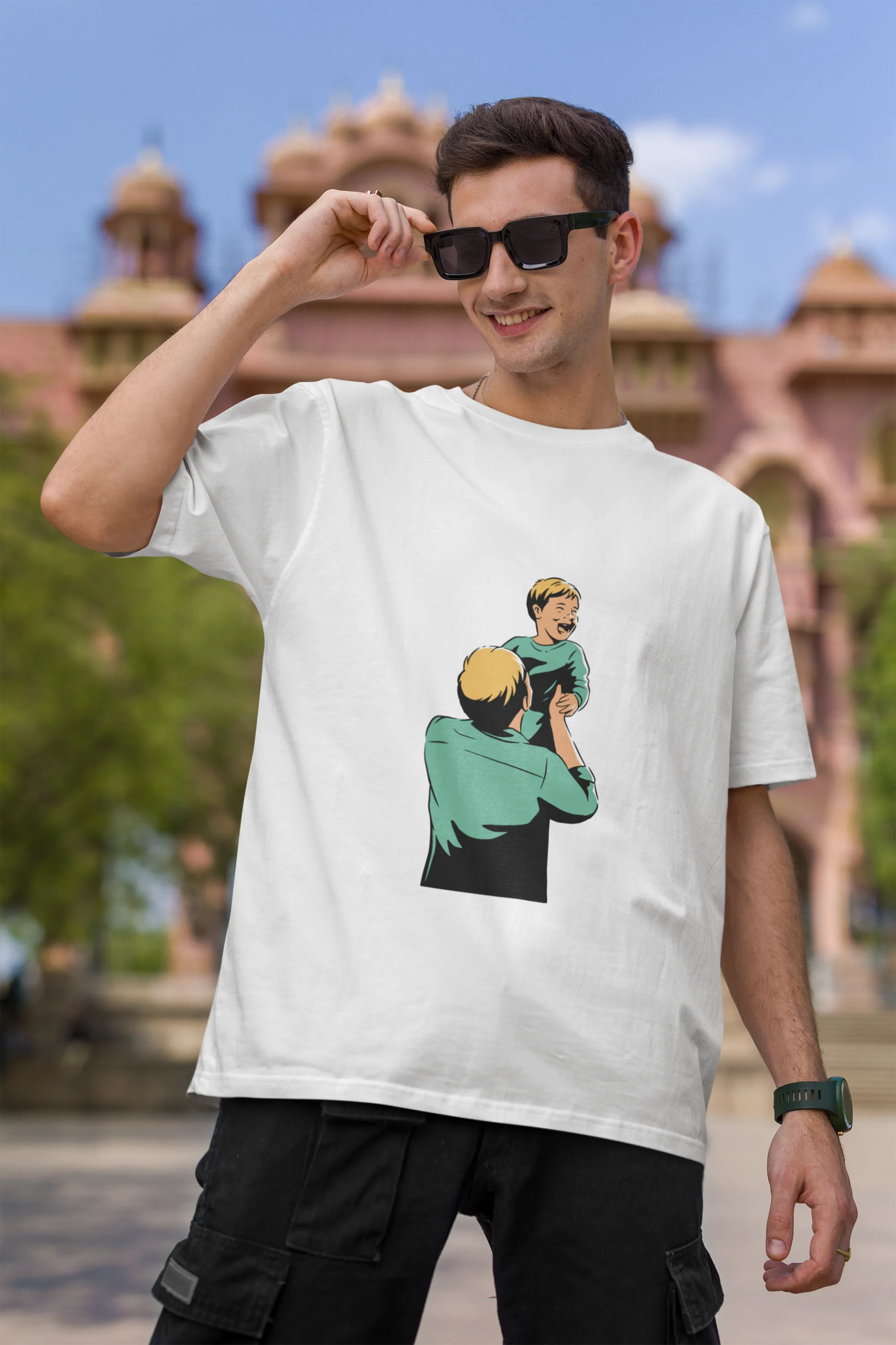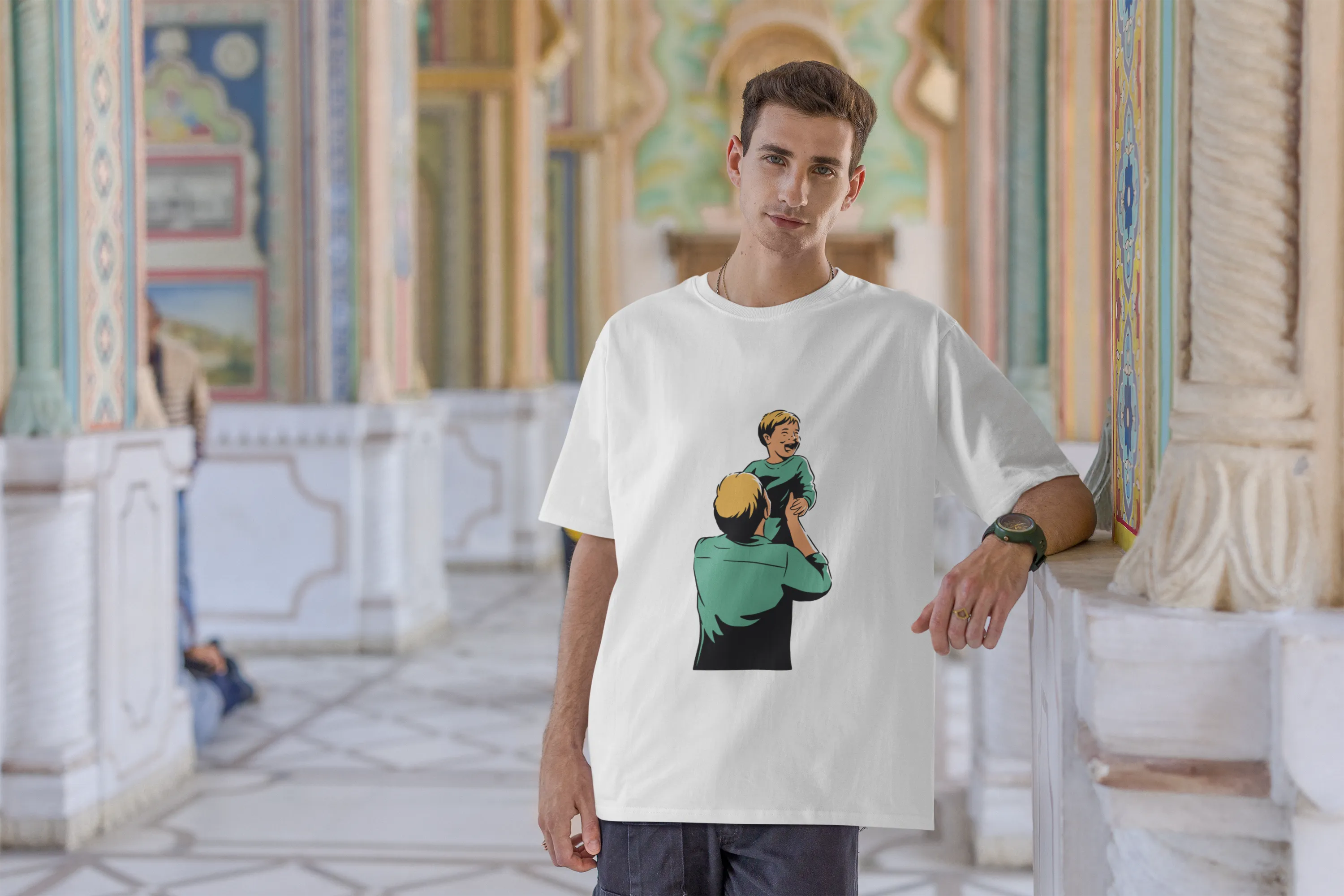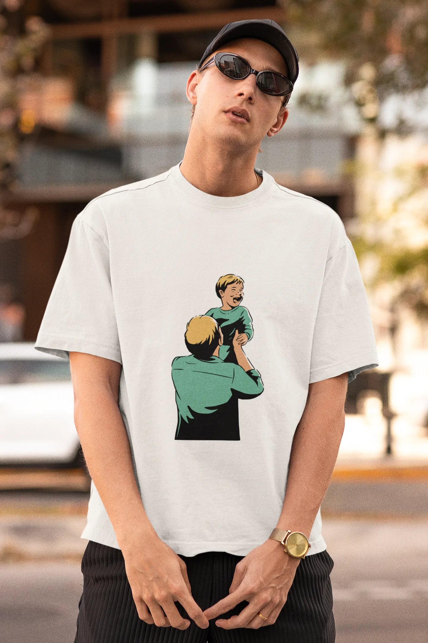 A stylish father-son T-shirt design featuring a matching theme, such as a superhero duo, king and prince, or "Like Father, Like Son" typography. Bold graphics, playful icons, and coordinated colors create a fun, heartwarming bond showcased through trendy apparel.