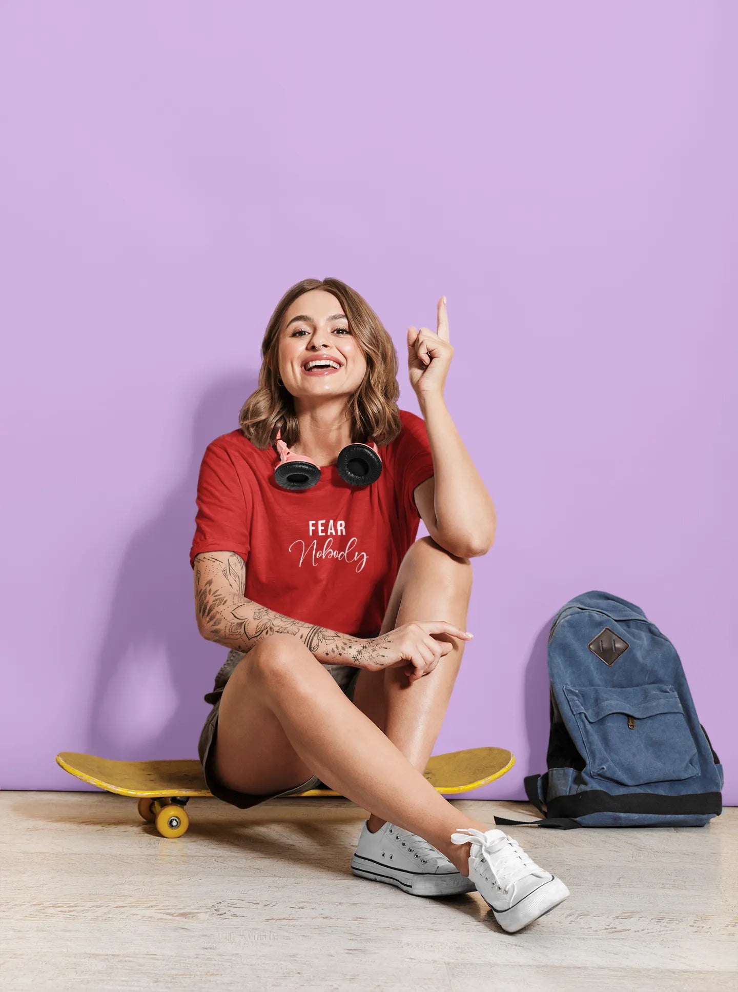 Woman wearing a red t-shirt with text, standing against a pink background