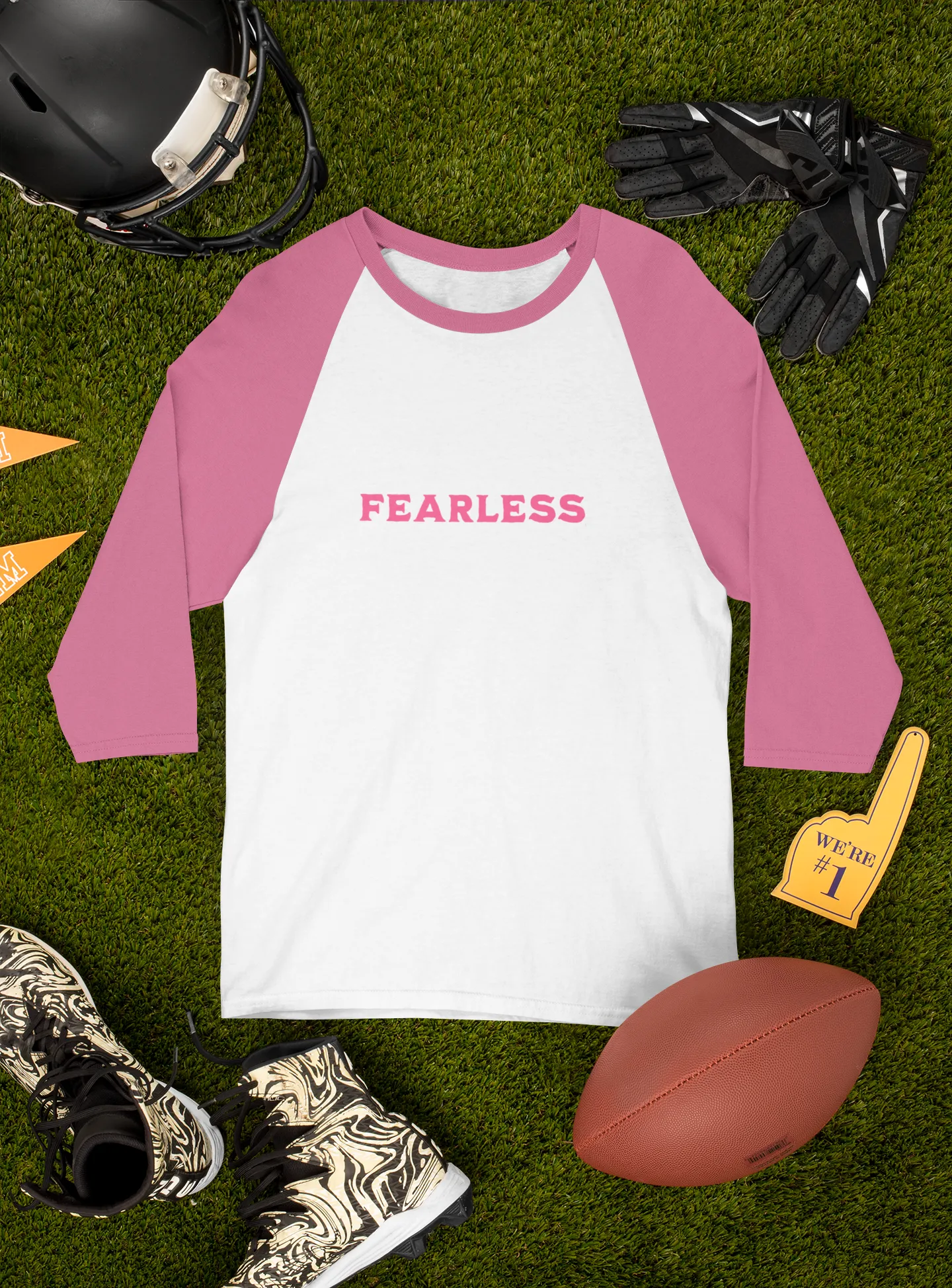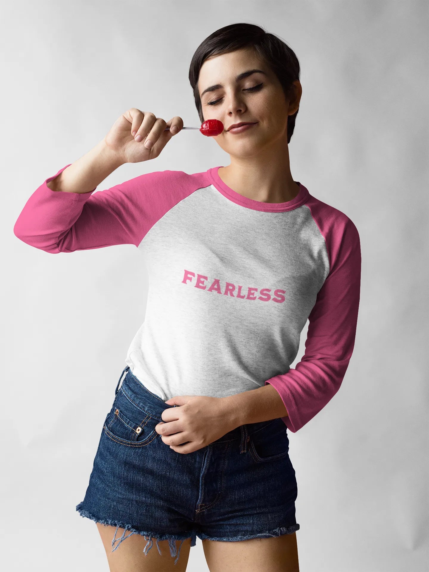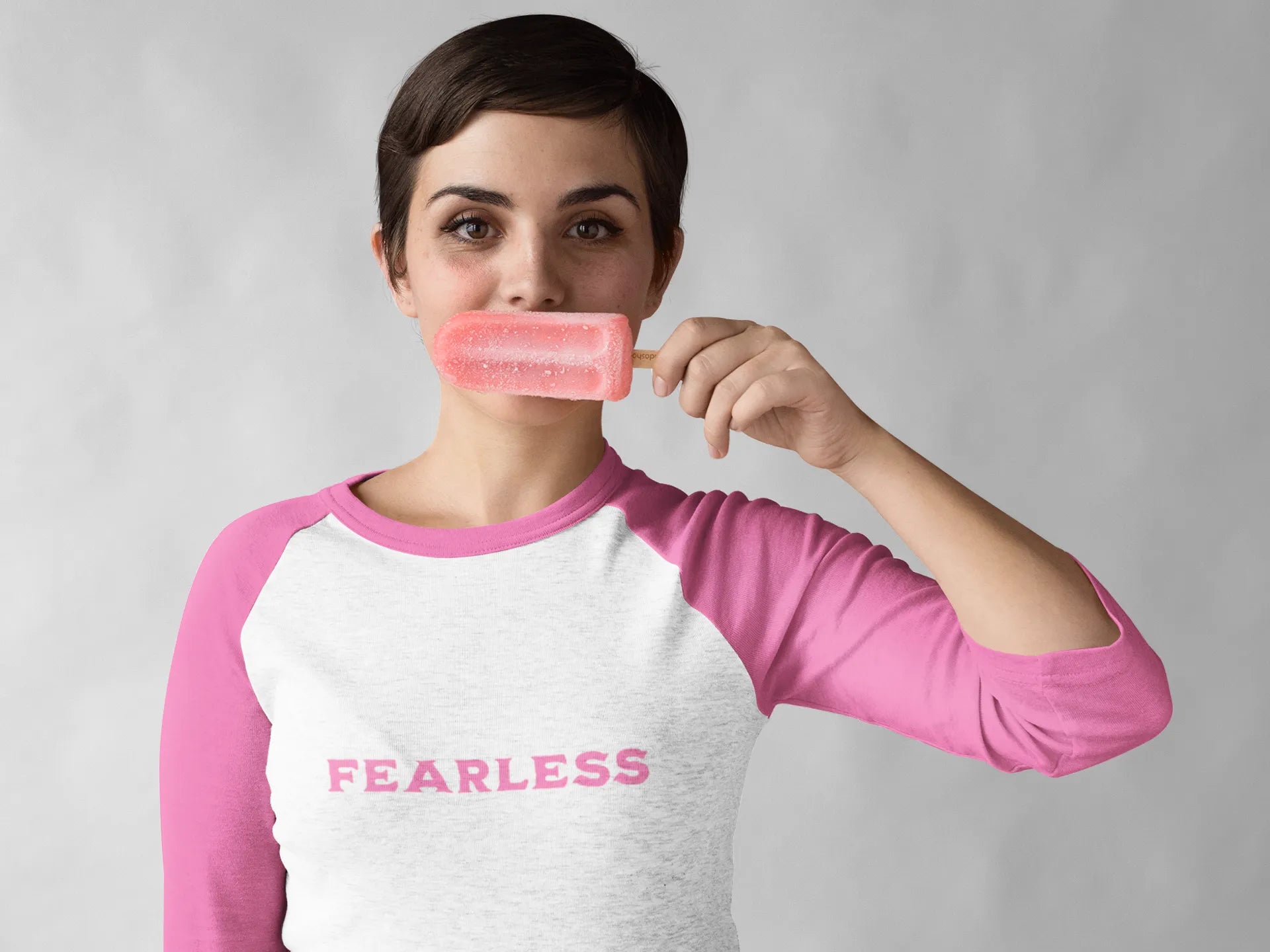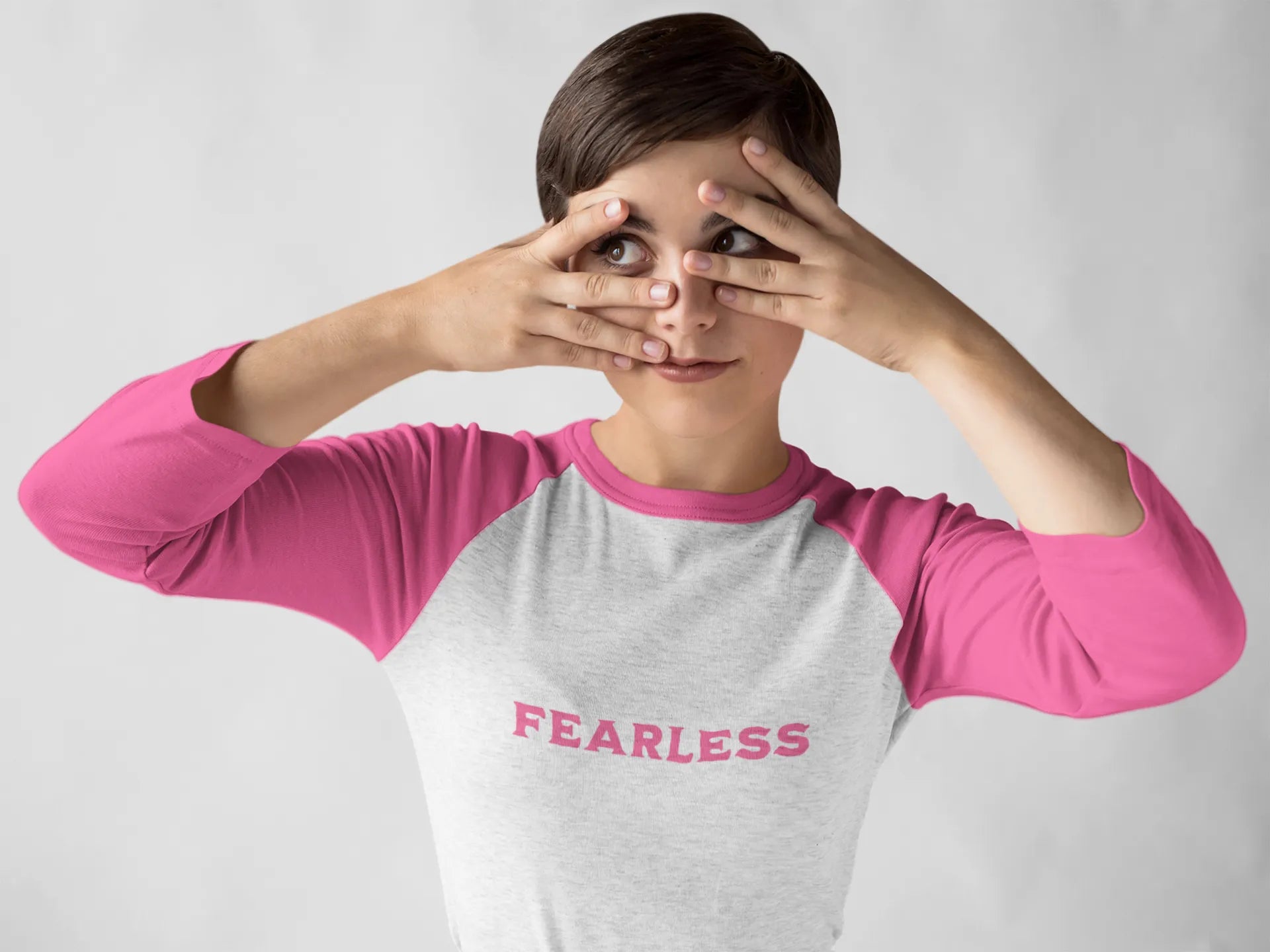 Person wearing a pink and gray 'FEARLESS' shirt against a white background