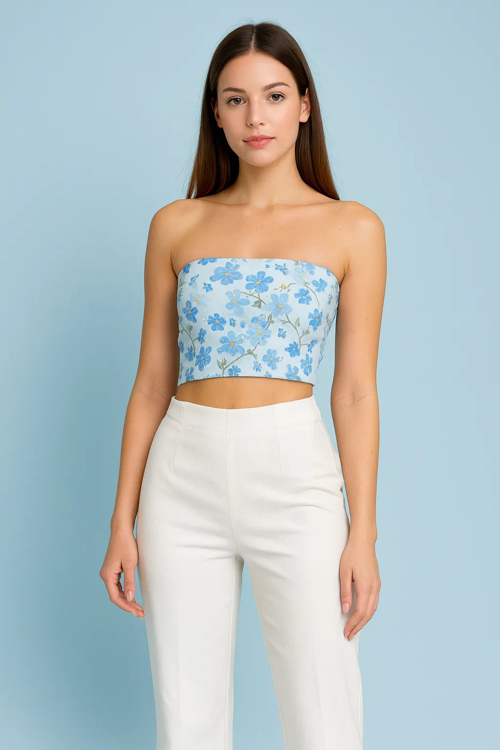 A stylish white tube top featuring delicate flower motifs, designed for everyday chic. Its regular fit provides comfort, making it a versatile piece for pairing with skirts, jeans, or layering for fashionable summer looks.