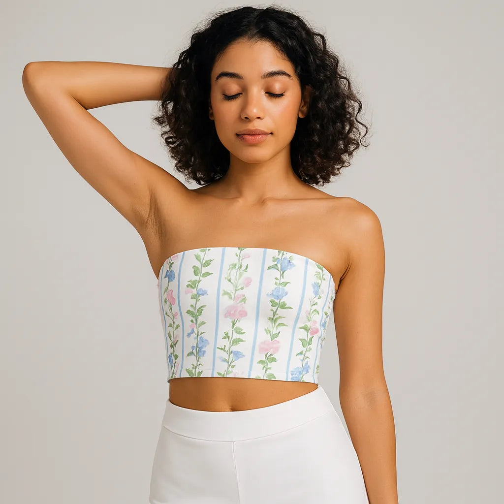 A stylish white tube top featuring delicate flower motifs, designed for everyday chic. Its regular fit provides comfort, making it a versatile piece for pairing with skirts, jeans, or layering for fashionable summer looks.