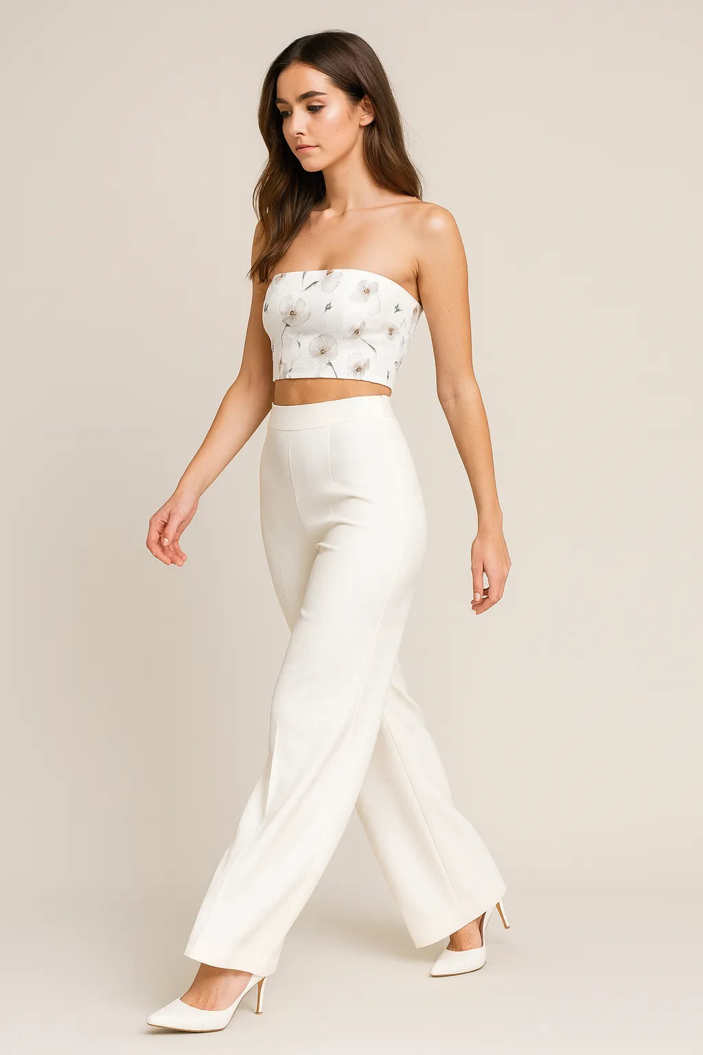 A stylish white tube top featuring delicate flower motifs, designed for everyday chic. Its regular fit provides comfort, making it a versatile piece for pairing with skirts, jeans, or layering for fashionable summer looks.