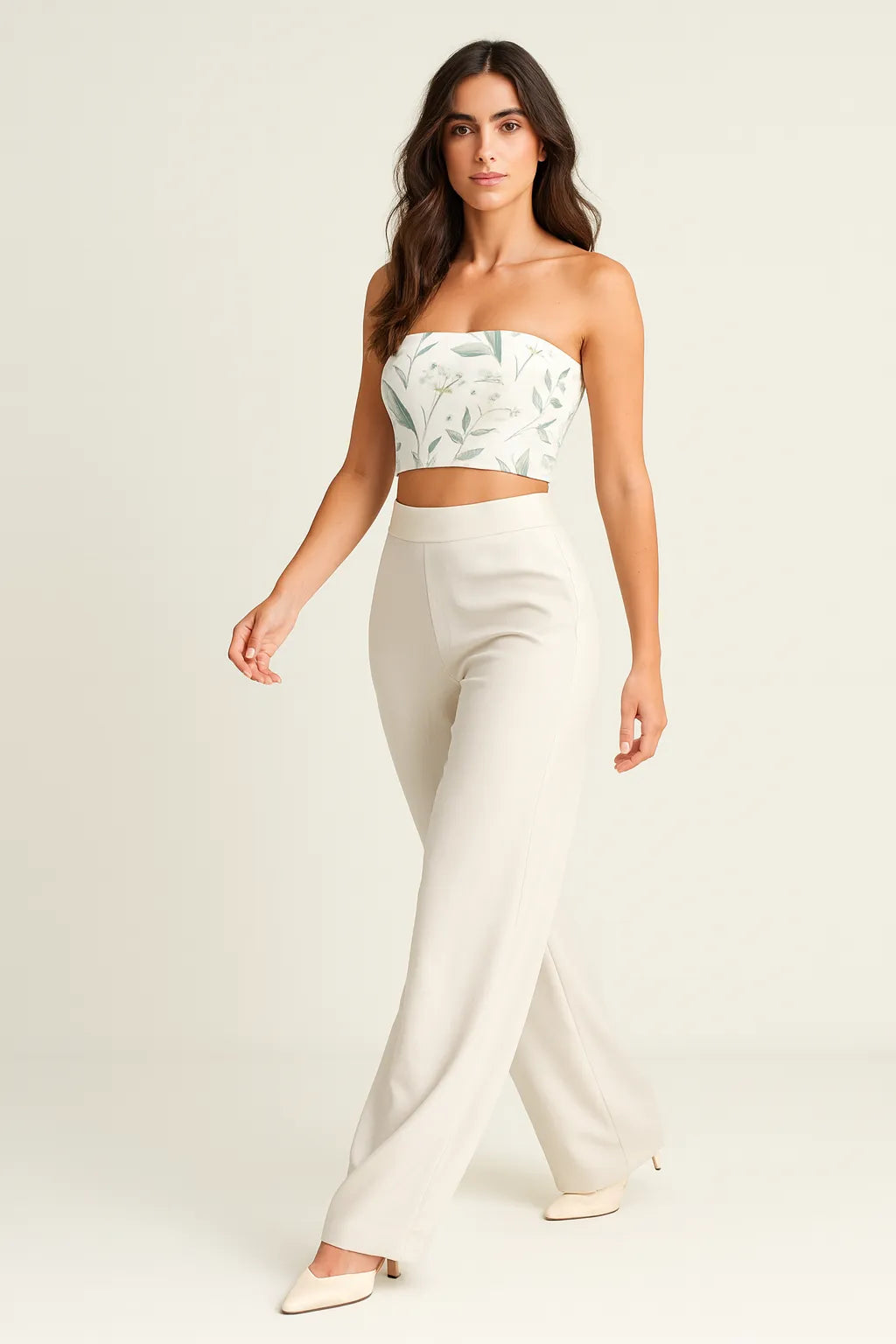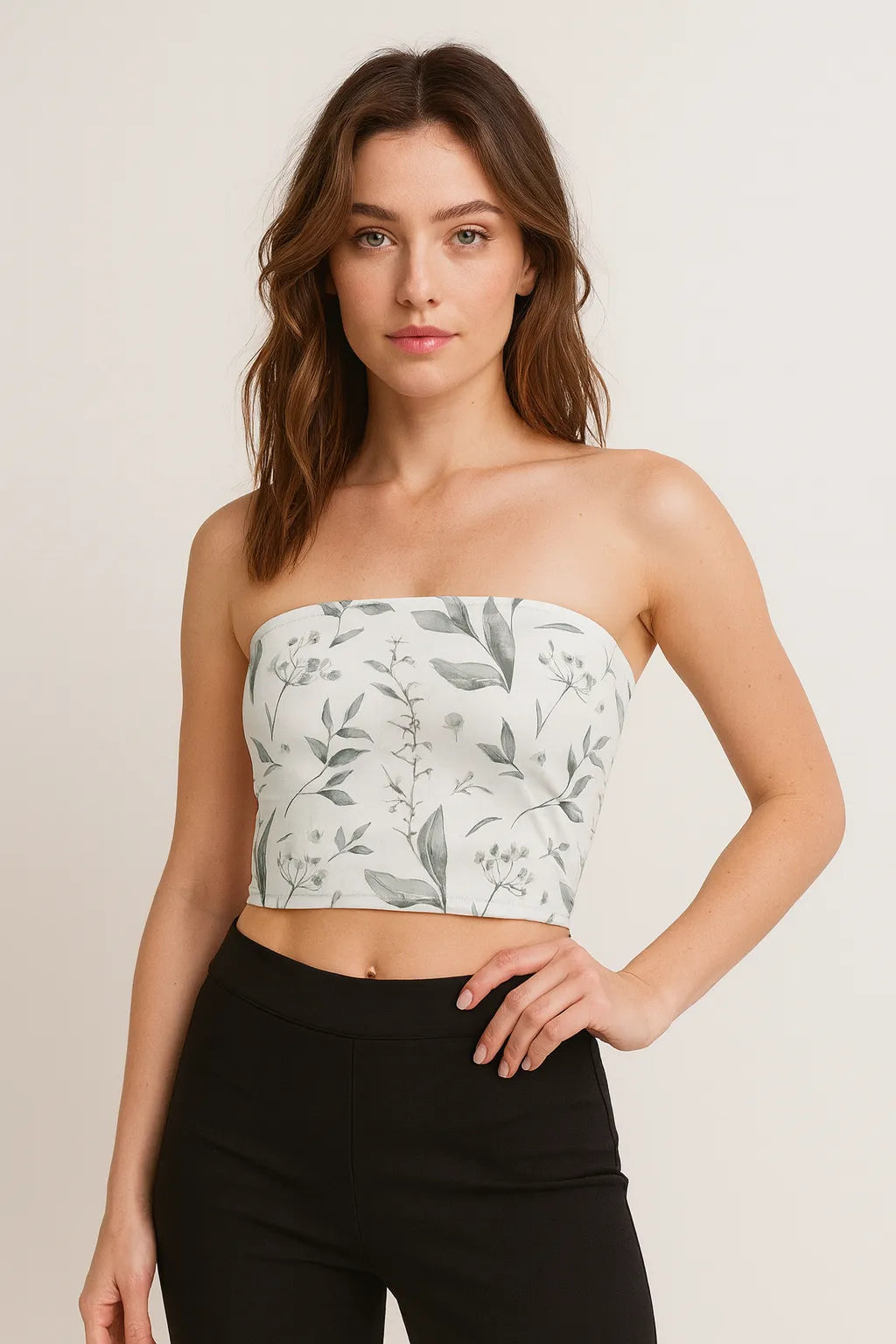 A stylish white tube top featuring delicate flower motifs, designed for everyday chic. Its regular fit provides comfort, making it a versatile piece for pairing with skirts, jeans, or layering for fashionable summer looks.